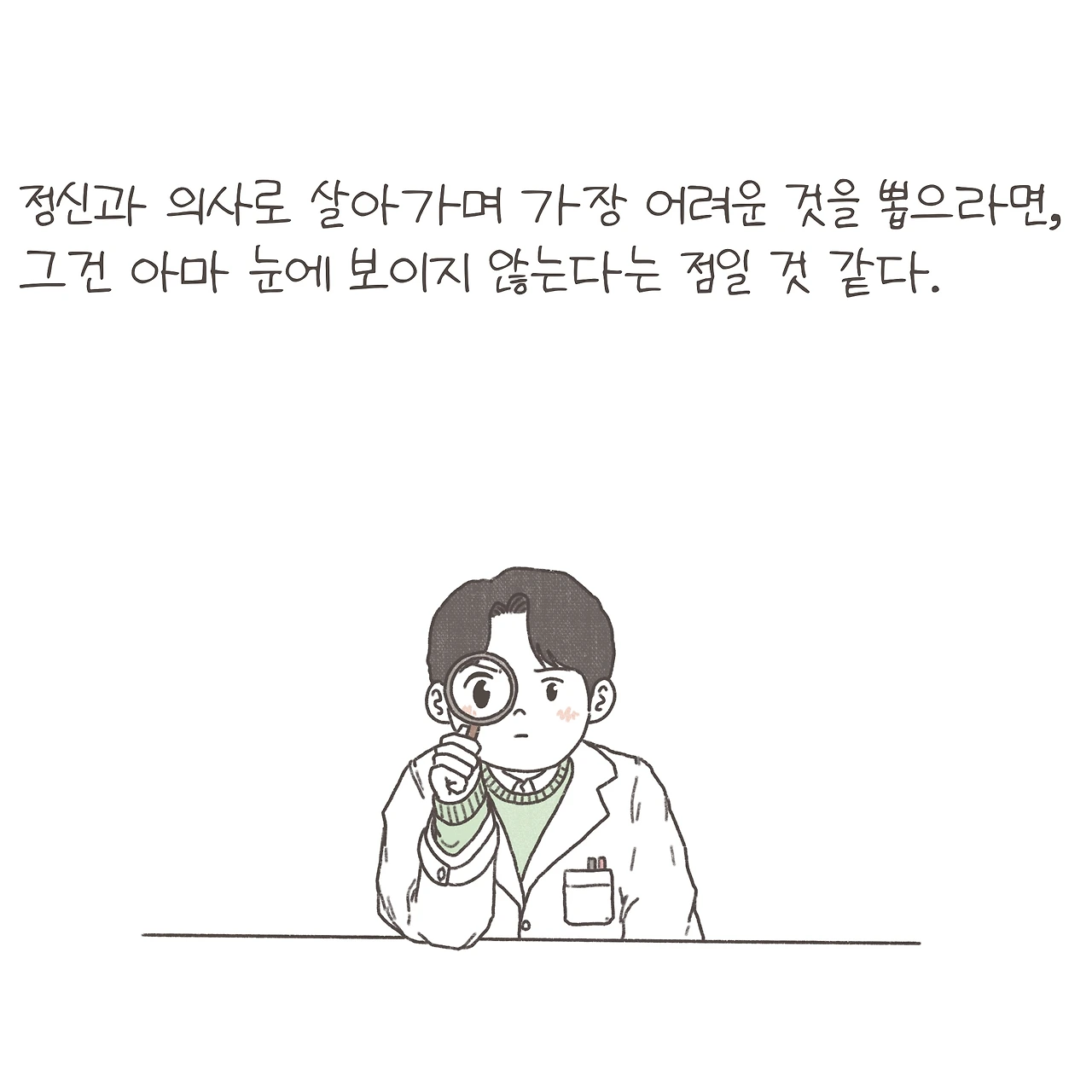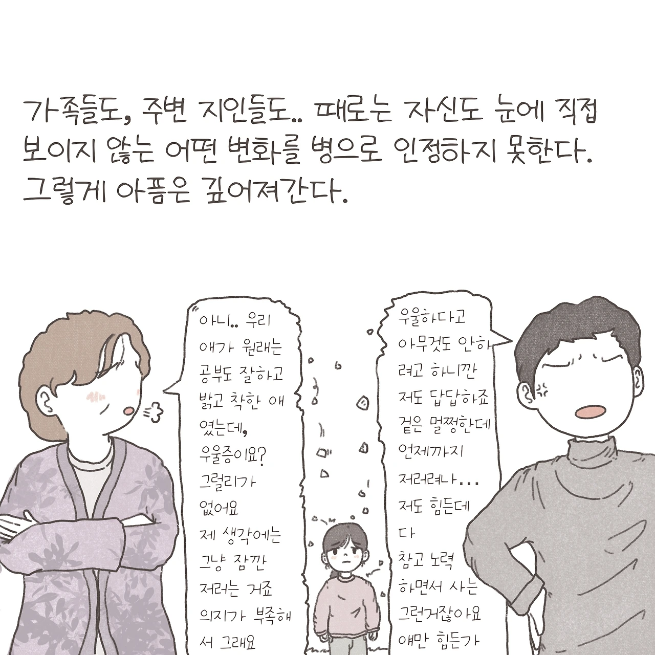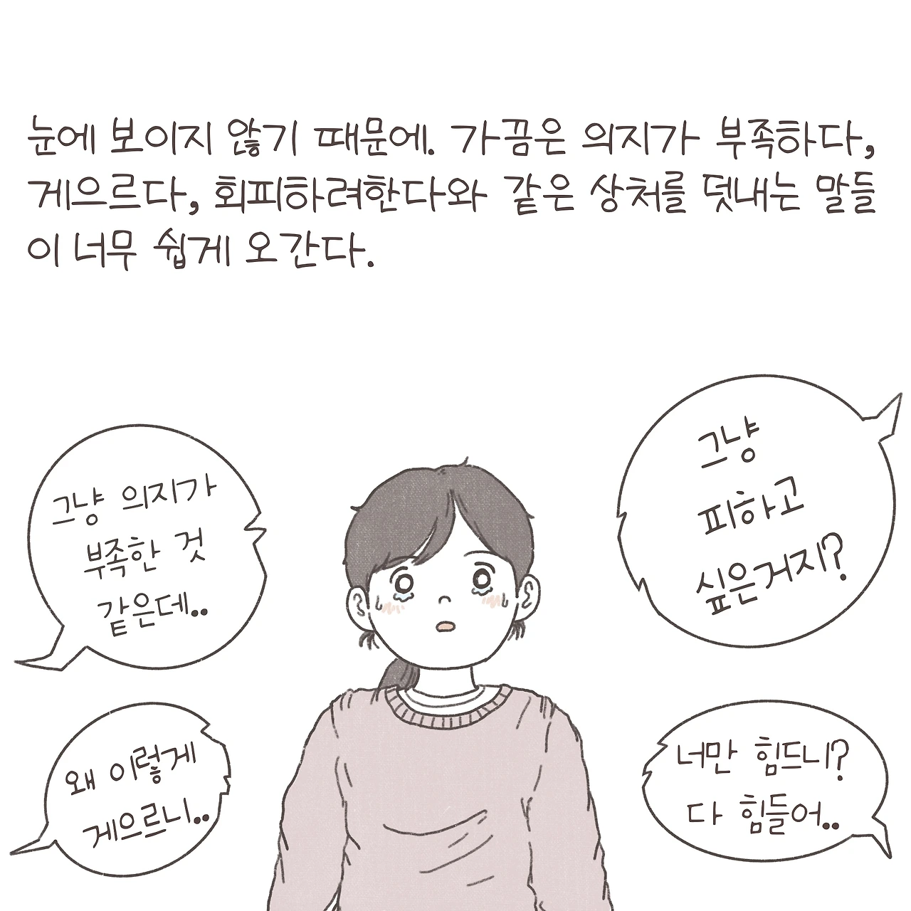 분명히 존재하지만 눈으로 직접 확인할 수 없는 정신과 질환들의 특성 탓에 어렵게 느껴지는 순간이 많습니다. 때로는 위험한 상황에서 도저히 설득이 안 되는 고집 센 가족들을 마주하거나, 자신을 정신과 질환이 있는 환자로 취급한다며 화를 내는 분들을 만나기도 해요. 눈에 보이지 않기 때문에, 처음 만난 누군가가 판단한 우울증 같은 무거운 말을 받아들이는 것은 어려운 일일 것 같습니다. 차라리 잠깐 힘들어서 생긴 변화일 거라, 의지가 부족해서 그런 거지 언제든 이겨낼 수 있으리라.. 그렇게 아끼는 마음에서 출발한 말들은 때로는 날이 선 화살이 되어 정작 본인을 아프게 하기도 해요. 눈에 보이지 않지만, 분명 치료와 시간이 필요한 문제들을 자신의 탓으로 여기며 주눅 드는 누군가를 위해 짧은 글을 남겨봅니다.