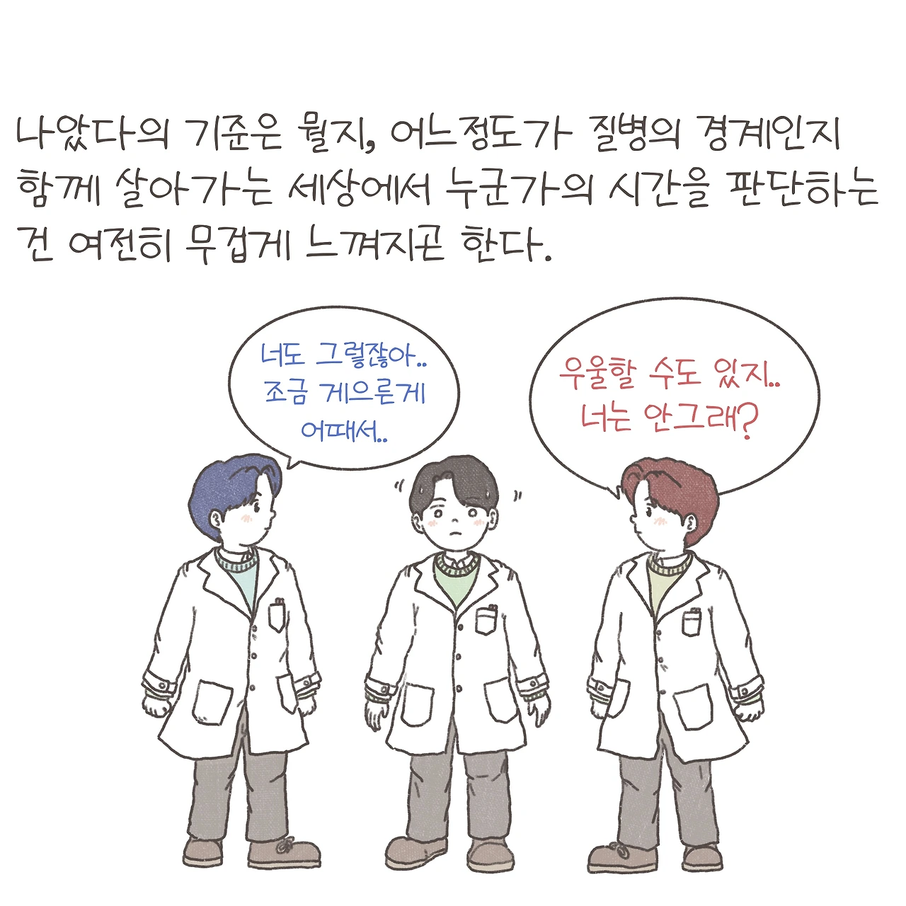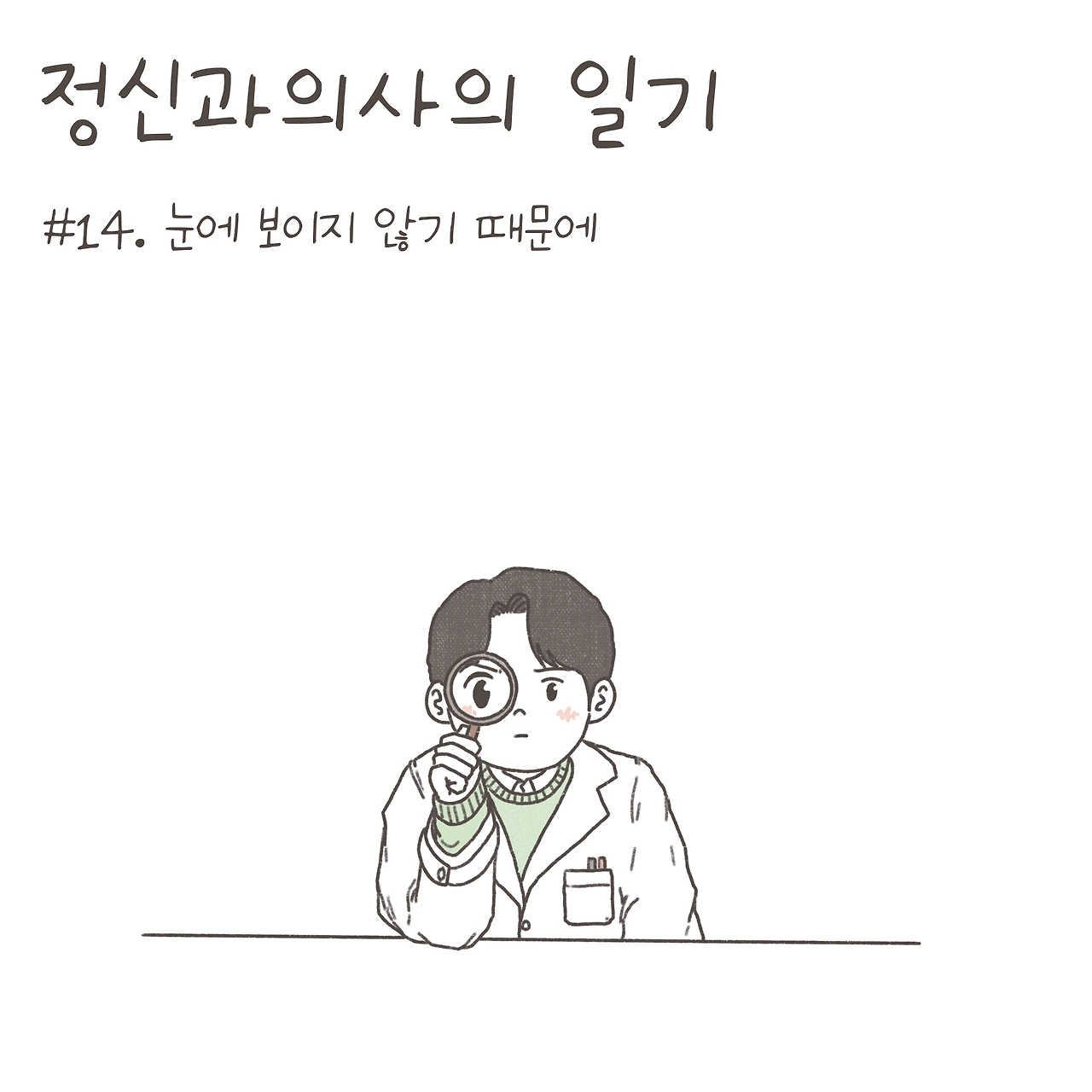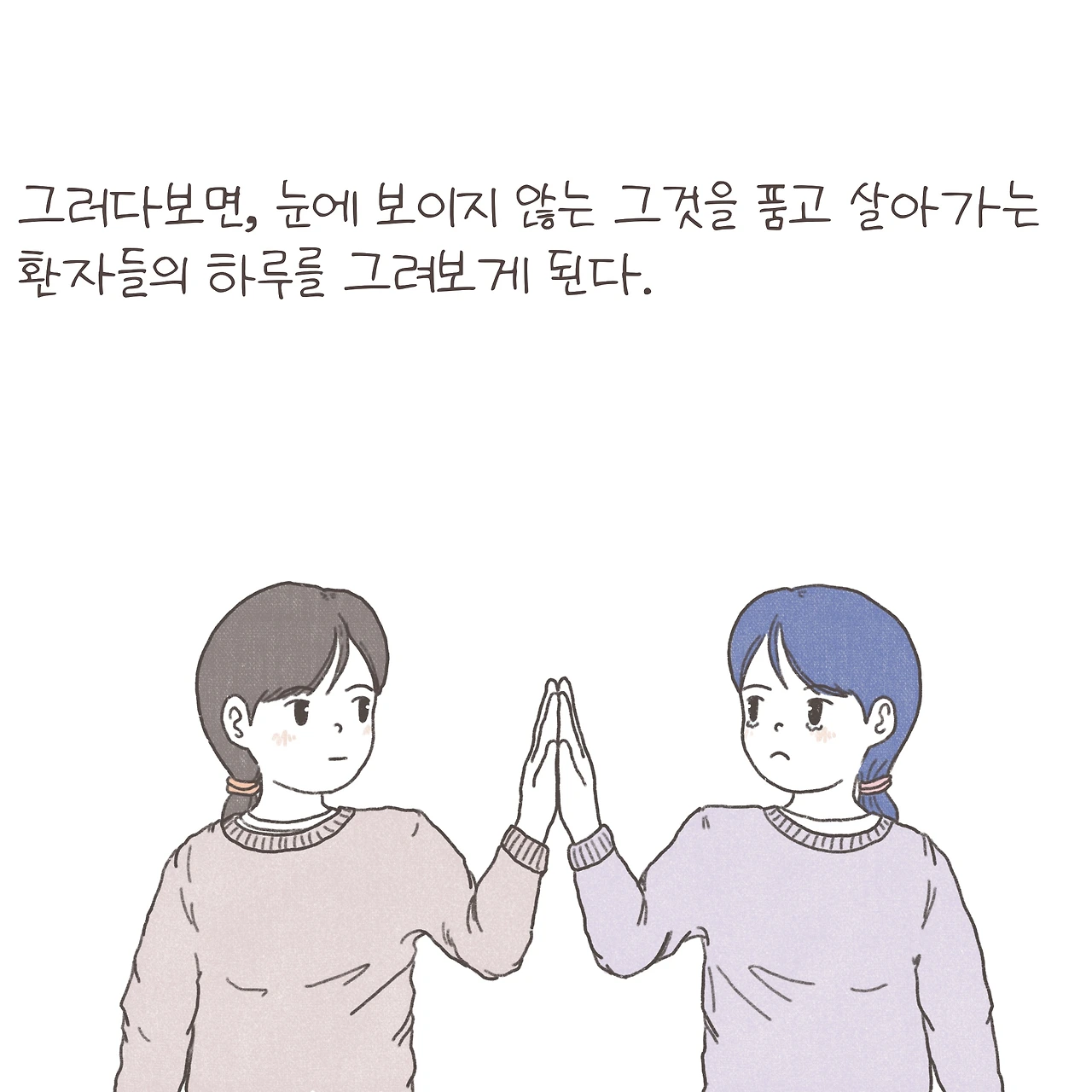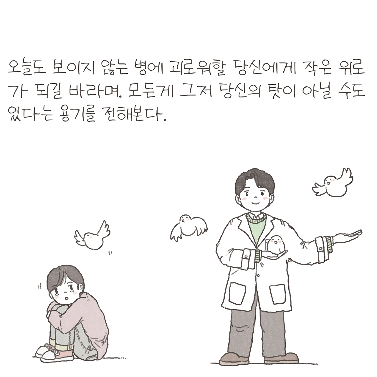 분명히 존재하지만 눈으로 직접 확인할 수 없는 정신과 질환들의 특성 탓에 어렵게 느껴지는 순간이 많습니다. 때로는 위험한 상황에서 도저히 설득이 안 되는 고집 센 가족들을 마주하거나, 자신을 정신과 질환이 있는 환자로 취급한다며 화를 내는 분들을 만나기도 해요. 눈에 보이지 않기 때문에, 처음 만난 누군가가 판단한 우울증 같은 무거운 말을 받아들이는 것은 어려운 일일 것 같습니다. 차라리 잠깐 힘들어서 생긴 변화일 거라, 의지가 부족해서 그런 거지 언제든 이겨낼 수 있으리라.. 그렇게 아끼는 마음에서 출발한 말들은 때로는 날이 선 화살이 되어 정작 본인을 아프게 하기도 해요. 눈에 보이지 않지만, 분명 치료와 시간이 필요한 문제들을 자신의 탓으로 여기며 주눅 드는 누군가를 위해 짧은 글을 남겨봅니다.
