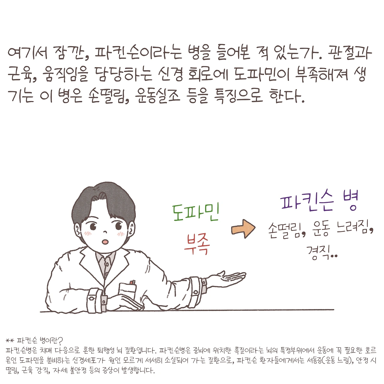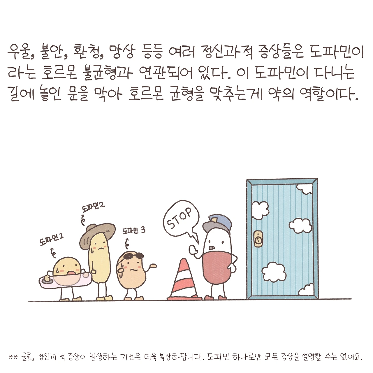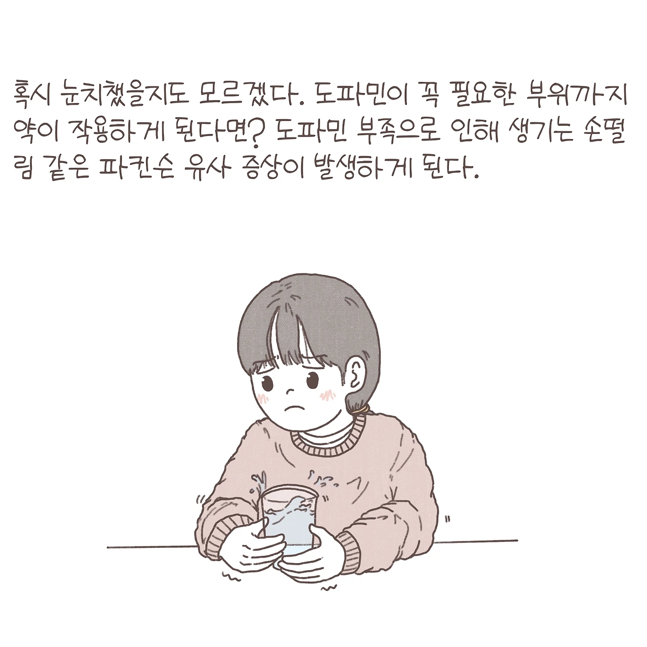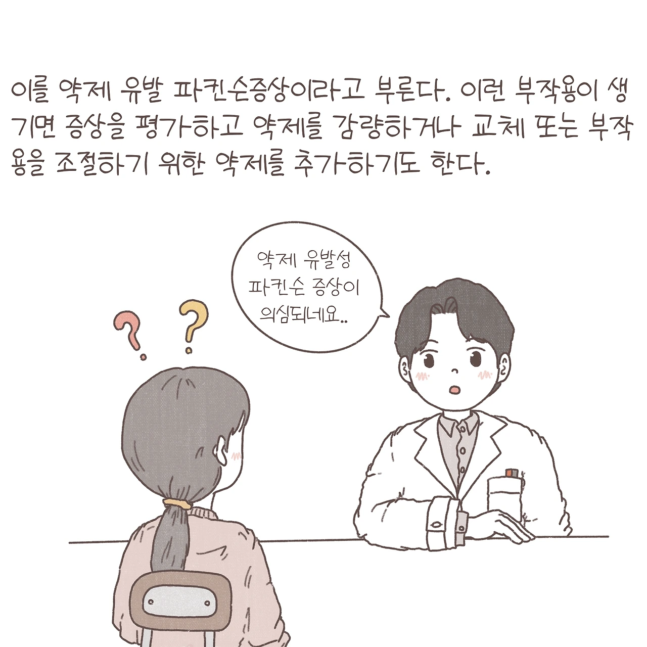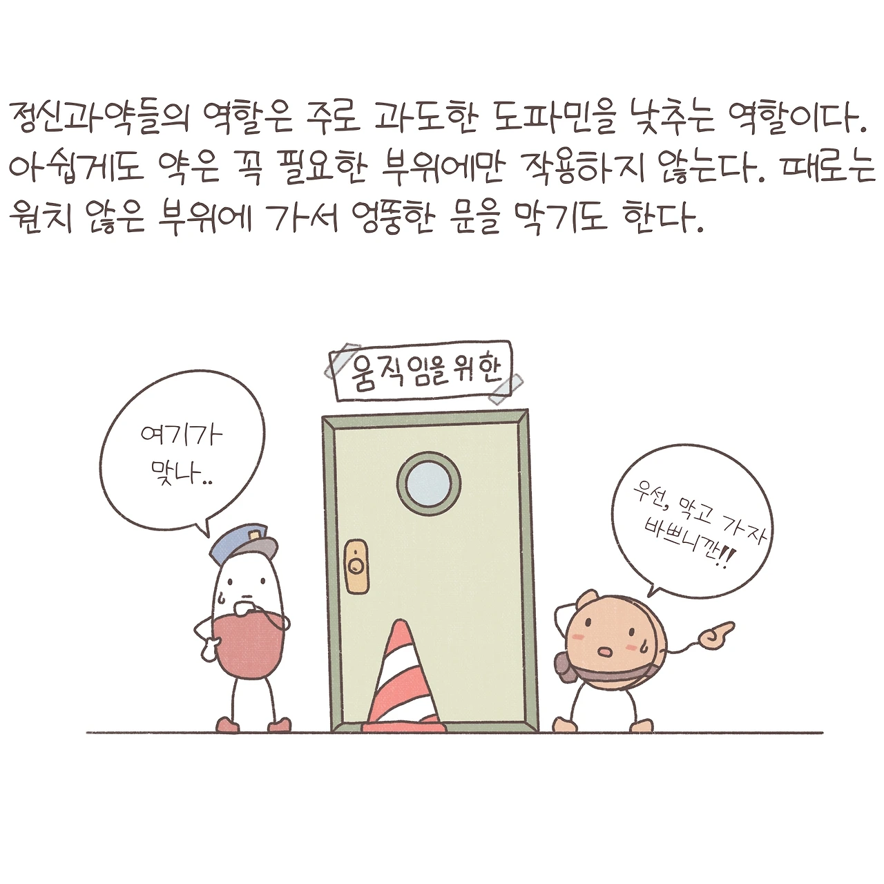 오늘은 추체외로증상이라고도 부르는 손떨림, 관절 경직, 말 어눌해짐 등을 대표 증상으로 하는 약제 유발 파킨슨 증상에 대해 이야기해보려 합니다. 일상생활에 직접적인 영향을 줄 수 있는 부작용들인 탓에 왜 이런 부작용이 생기는지 궁금해하시는 분들이 많았어요. 간단히 표현하면 우리가 약을 통해 막고 싶은 문이 아닌 다른 문을 막게 되면서 나타나는 증상이랍니다. 현재까지 부작용이 전혀 없는 약은 없는 탓에 이러한 부작용들이 나타나면 치료하던 증상(환청이나 망상, 기분증상 등등)의 심각도를 평가하고 약제를 감량하거나 교체 또는 부작용을 줄여주는 부가적인 약제를 추가하기도 합니다.