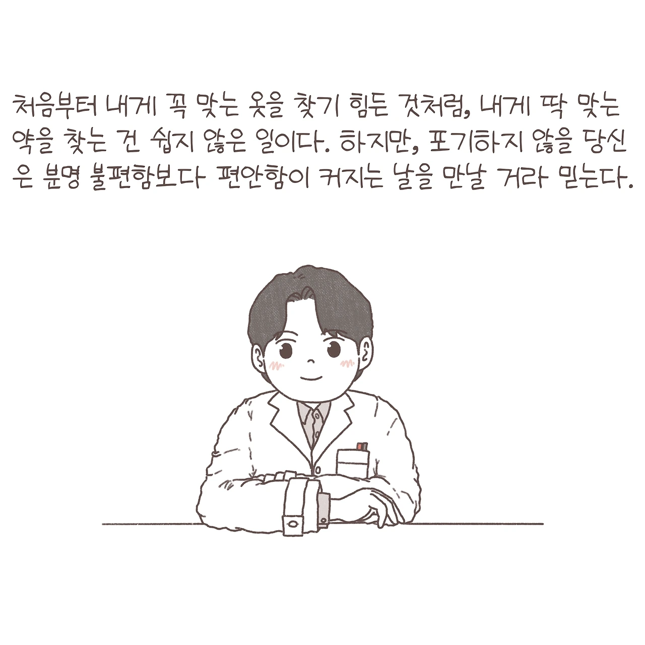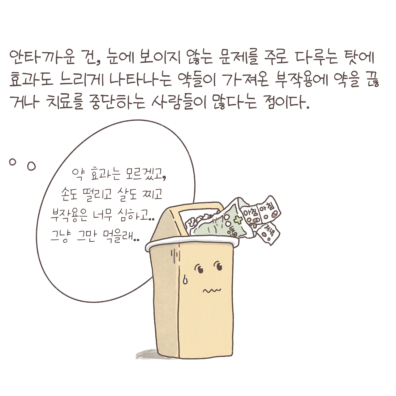 곧바로 효과가 나타나지 않고 충분 기간 유지가 필요한 정신과 약제의 특성상, 부작용이 더 빠르게 나타나면 치료에 대한 신뢰가 떨어져 약을 끊어버리는 경우가 많아요. 하지만, 이러한 부작용 또한 정확한 평가와 약제 조절을 통해 내게 좀 더 잘 맞는 약을 찾아가는 과정이라고 생각하며 충분한 시간을 갖는 것이 중요하다고 생각해요. 그런 마음을 담아 짧게나마 누군가의 이해를 돕기 위한 글을 남겨봅니다.