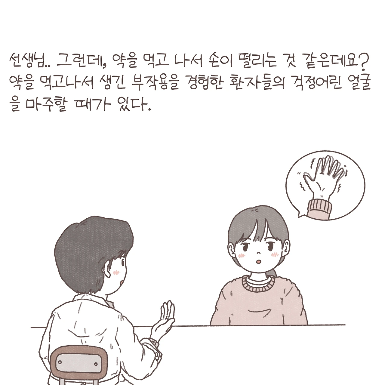 진료를 하다가 난감한 순간을 꼽자면, 약에 반응은 있지만 부작용을 견디기 힘들어하는 경우인 것 같아요. 체중증가, 손떨림, 관절 경직, 배뇨이상, 어지럼증 등등 정말 다양한 부작용을 보일 수 있는 정신과 약제의 특성상, 부작용을 평가하고 줄여가는 것이 치료 순응도 유지에 정말 중요한 요소인 것 같습니다.