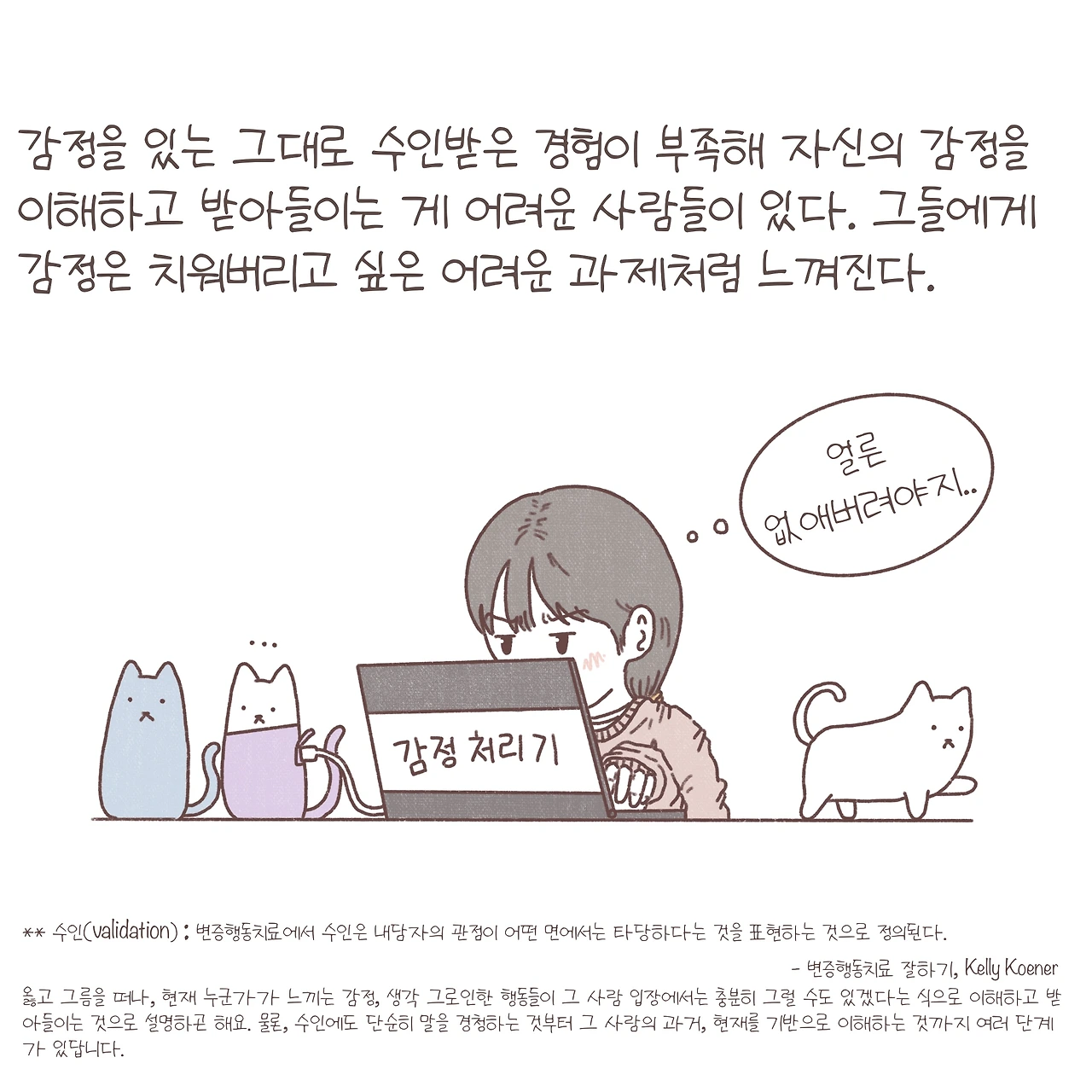 유독 감정에 취약한 사람들을 자주 만나곤 합니다. 감정 자체는 나쁜 것이 아니지만, 그 감정을 느끼는 순간이 너무 괴로워 습관적으로 감정을 얼른 해소하려는 노력을 하곤 하죠. 감정을 잊을 수 있는 강렬한 무언가를 찾거나, 감정 자체를 억누르고 부인하는 경우가 많아요. 이렇게 자신의 감정을 다루는 것에 서투른 사람들은 또 그만큼 감정에 예민해져 있기도 합니다. 나에게는 너무 불편한 것이기 때문에 작은 단서로도 감정을 캐치하고 더 나아가 내가 아닌 타인의 감정에도 감수성이 높죠.