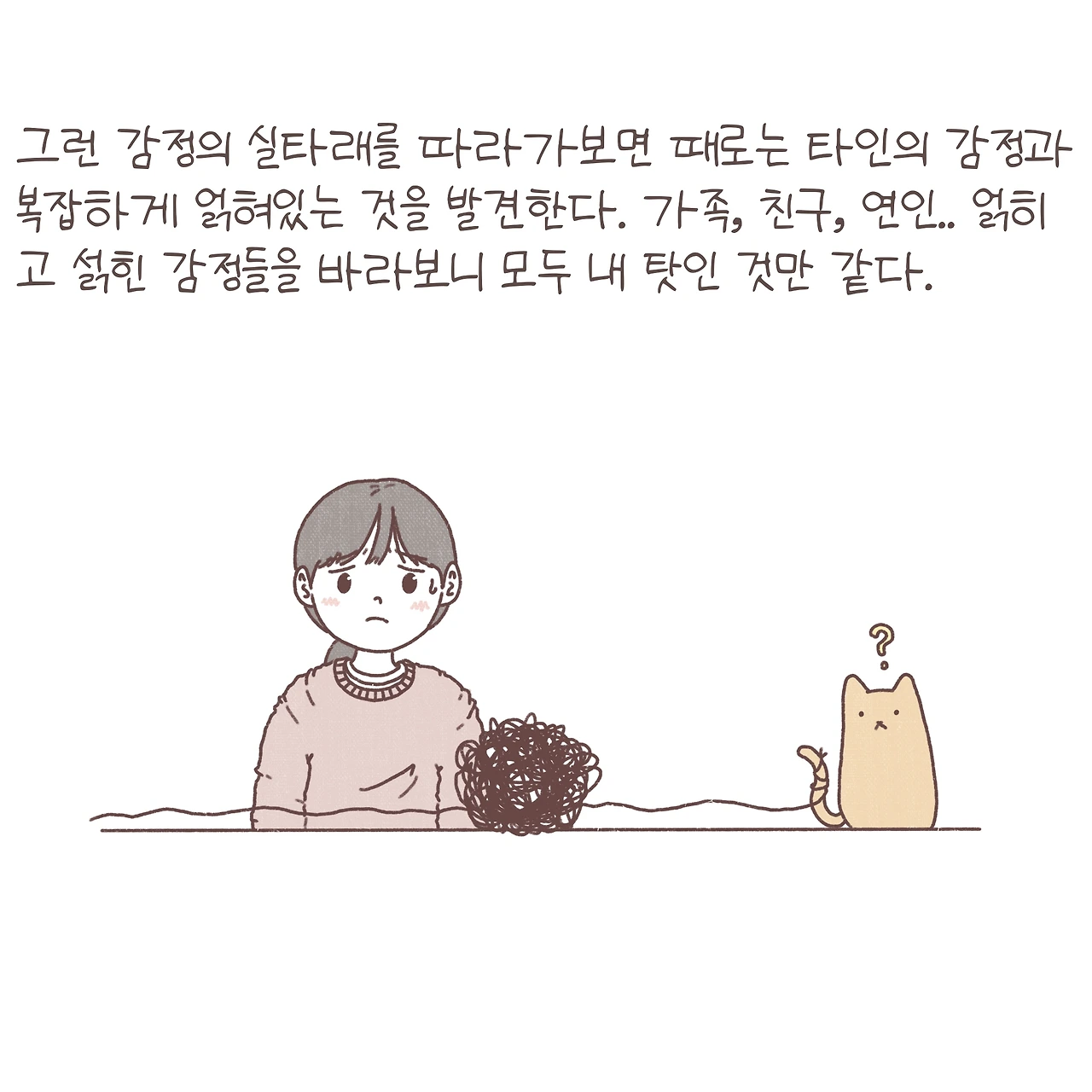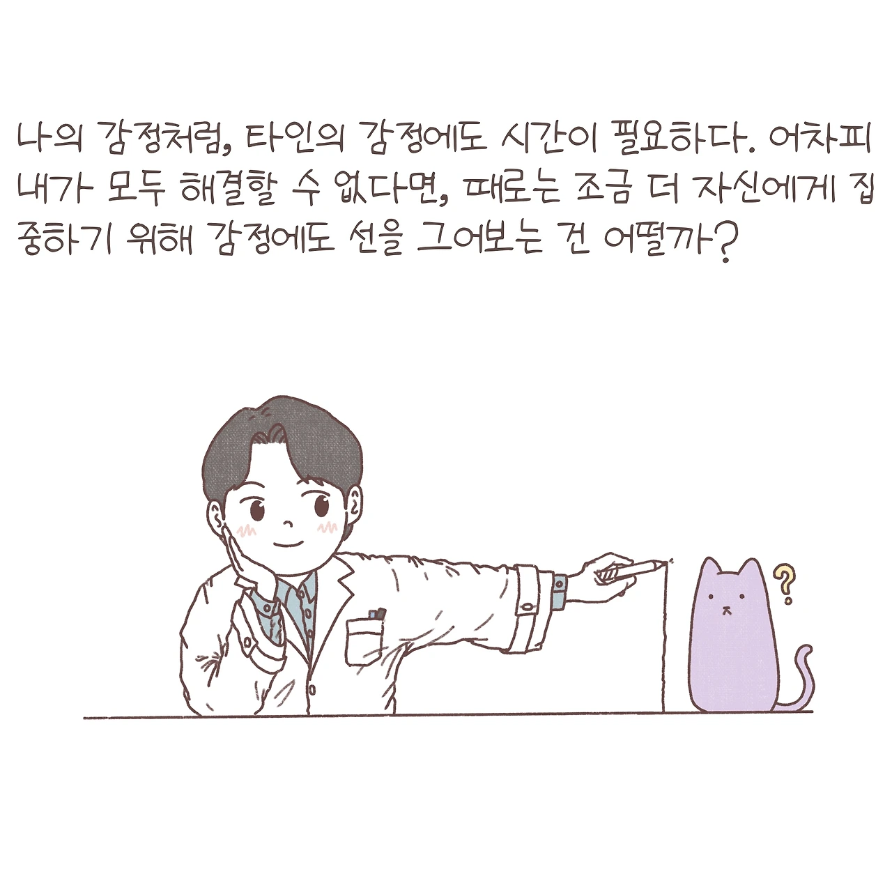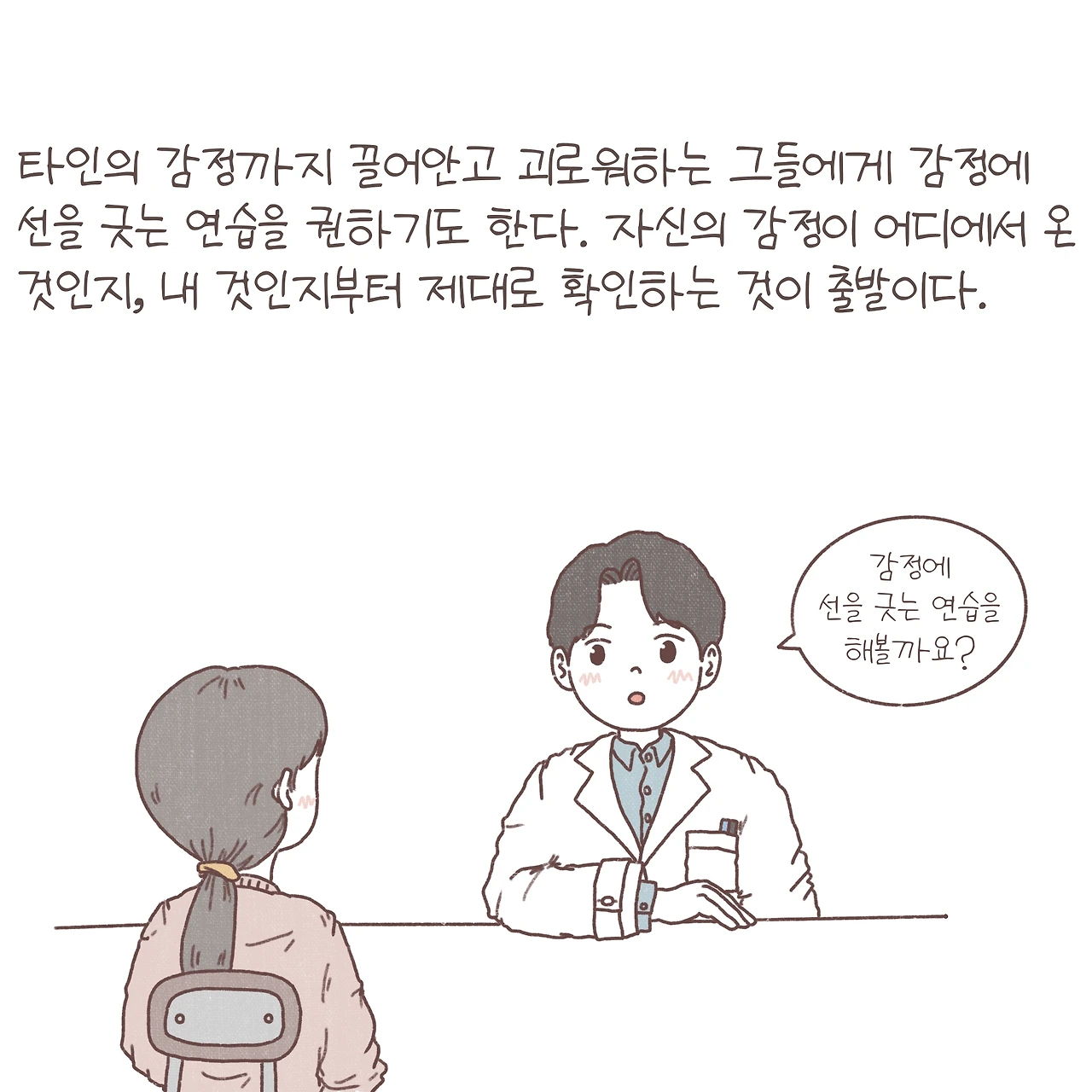 문제는 이렇게 타인의 감정을 느끼지만, 때로는 이게 내 감정인지, 타인에게서 온 감정인지 헷갈릴 때가 많다는 점인 것 같습니다. 내 감정도 어려운 누군가에겐 더욱 어렵게 다가오겠죠. 나를 걱정하는 부모님의 감정까지, 여러 가지 일이 겹쳐 힘들어하는 친구의 감정까지 내가 해결할 수 있을까요? 사람마다 스트레스와 감정을 관리하는 방법은 다르고 때로는 시간이 필요한 문제들도 있기 마련입니다.