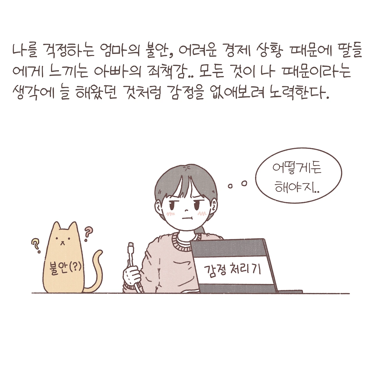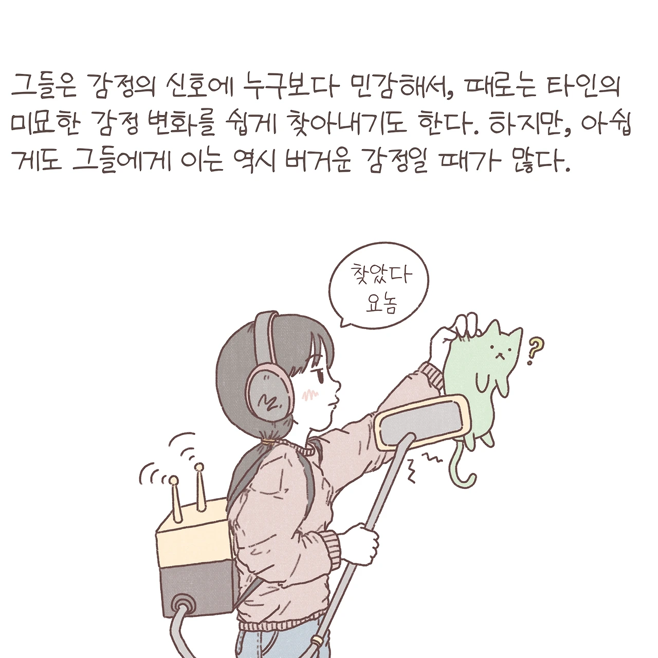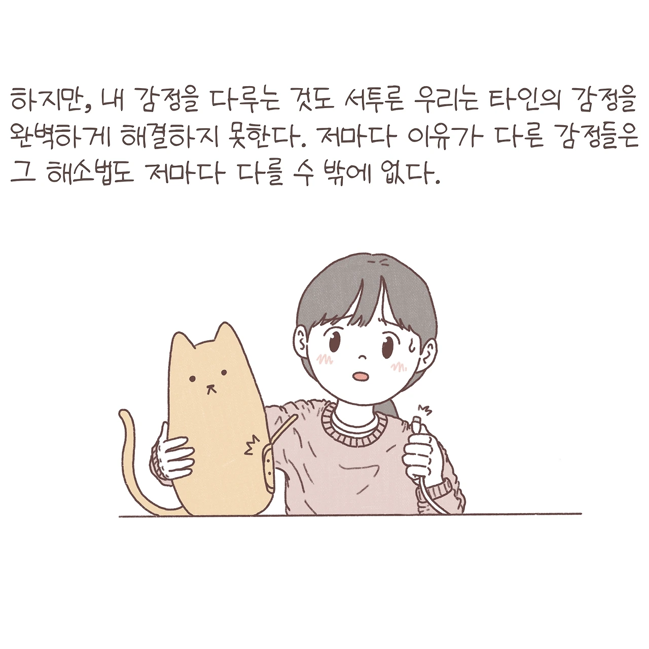 문제는 이렇게 타인의 감정을 느끼지만, 때로는 이게 내 감정인지, 타인에게서 온 감정인지 헷갈릴 때가 많다는 점인 것 같습니다. 내 감정도 어려운 누군가에겐 더욱 어렵게 다가오겠죠. 나를 걱정하는 부모님의 감정까지, 여러 가지 일이 겹쳐 힘들어하는 친구의 감정까지 내가 해결할 수 있을까요? 사람마다 스트레스와 감정을 관리하는 방법은 다르고 때로는 시간이 필요한 문제들도 있기 마련입니다.