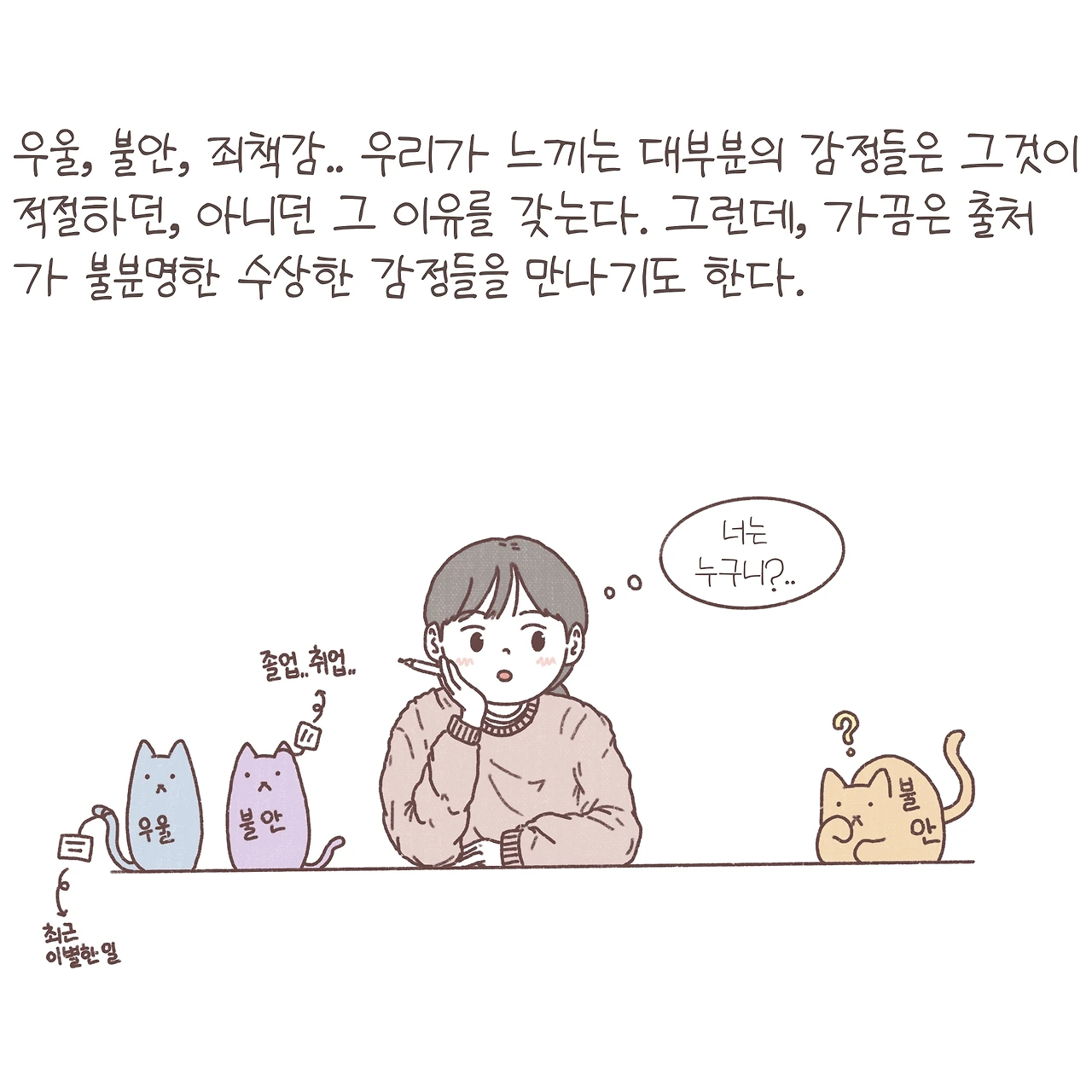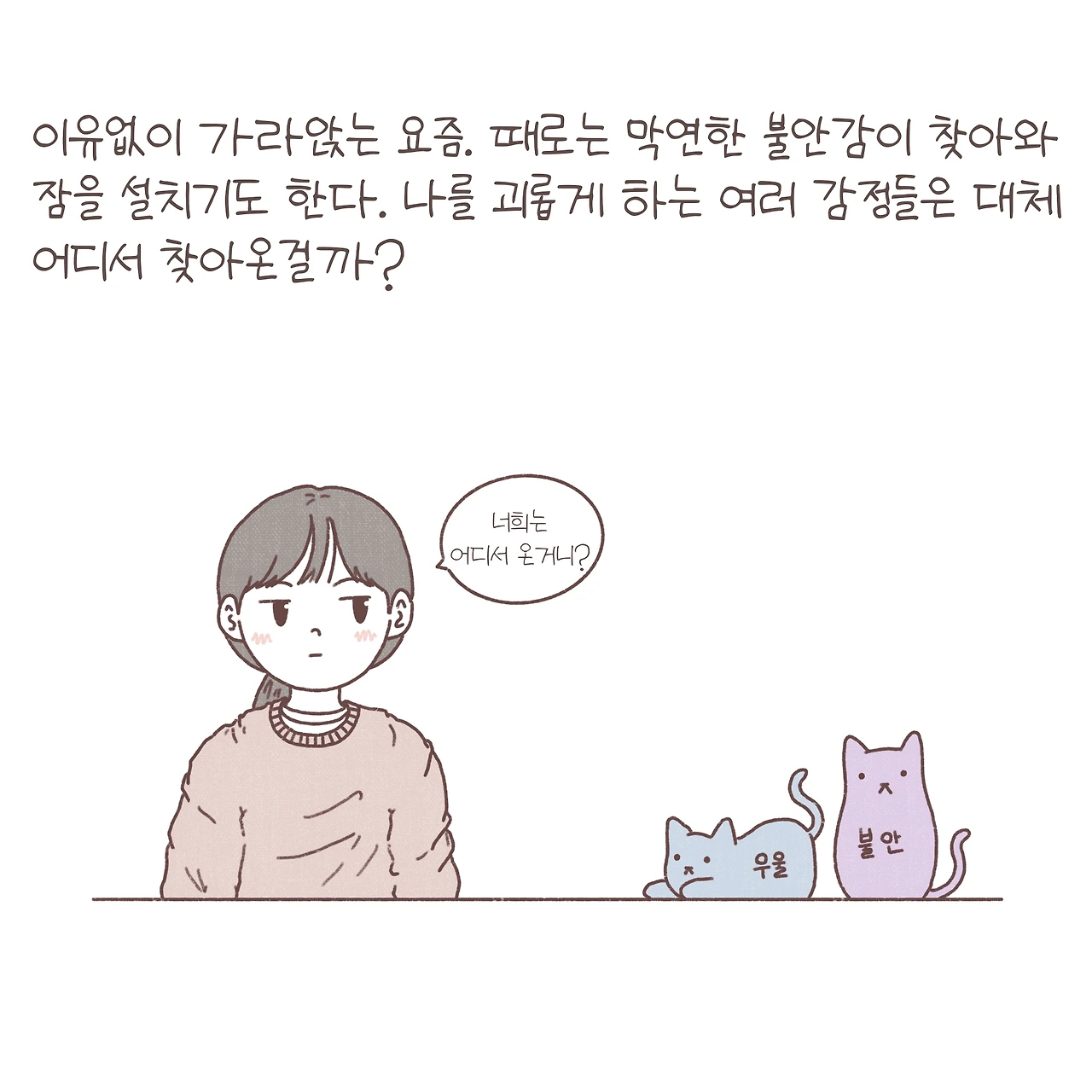 ** 감정고양이라는 캐릭터를 만들어봤어요! 저마다 색을 가지고, 감정을 담고 있답니다. 감정이 해소되면 색이 연해지다가 흰색이 되기도 해요. 앞으로 종종 등장할 것 같아요:)