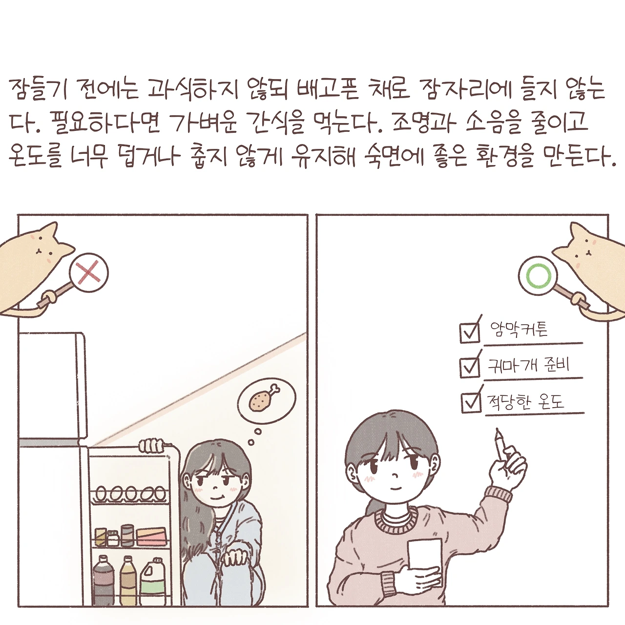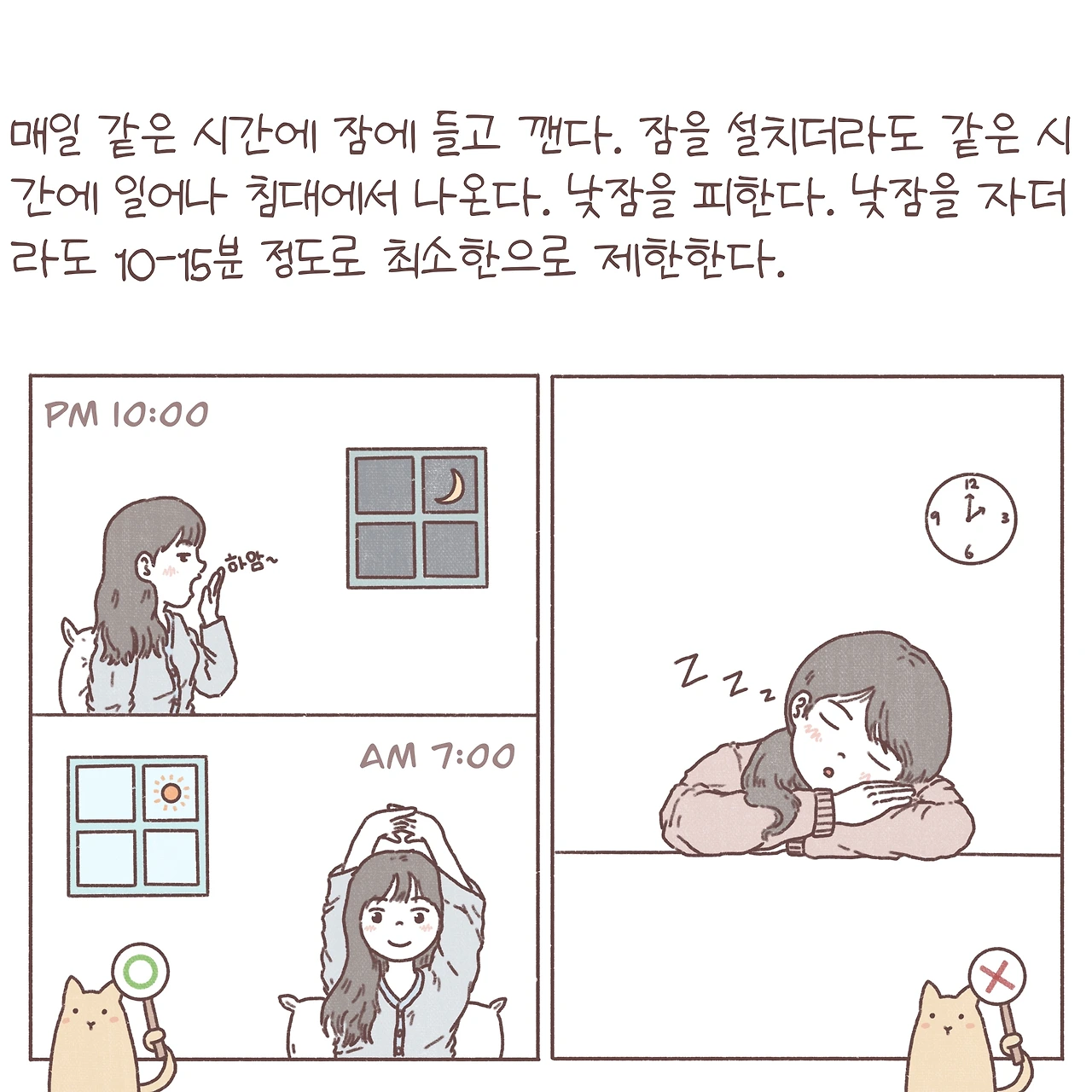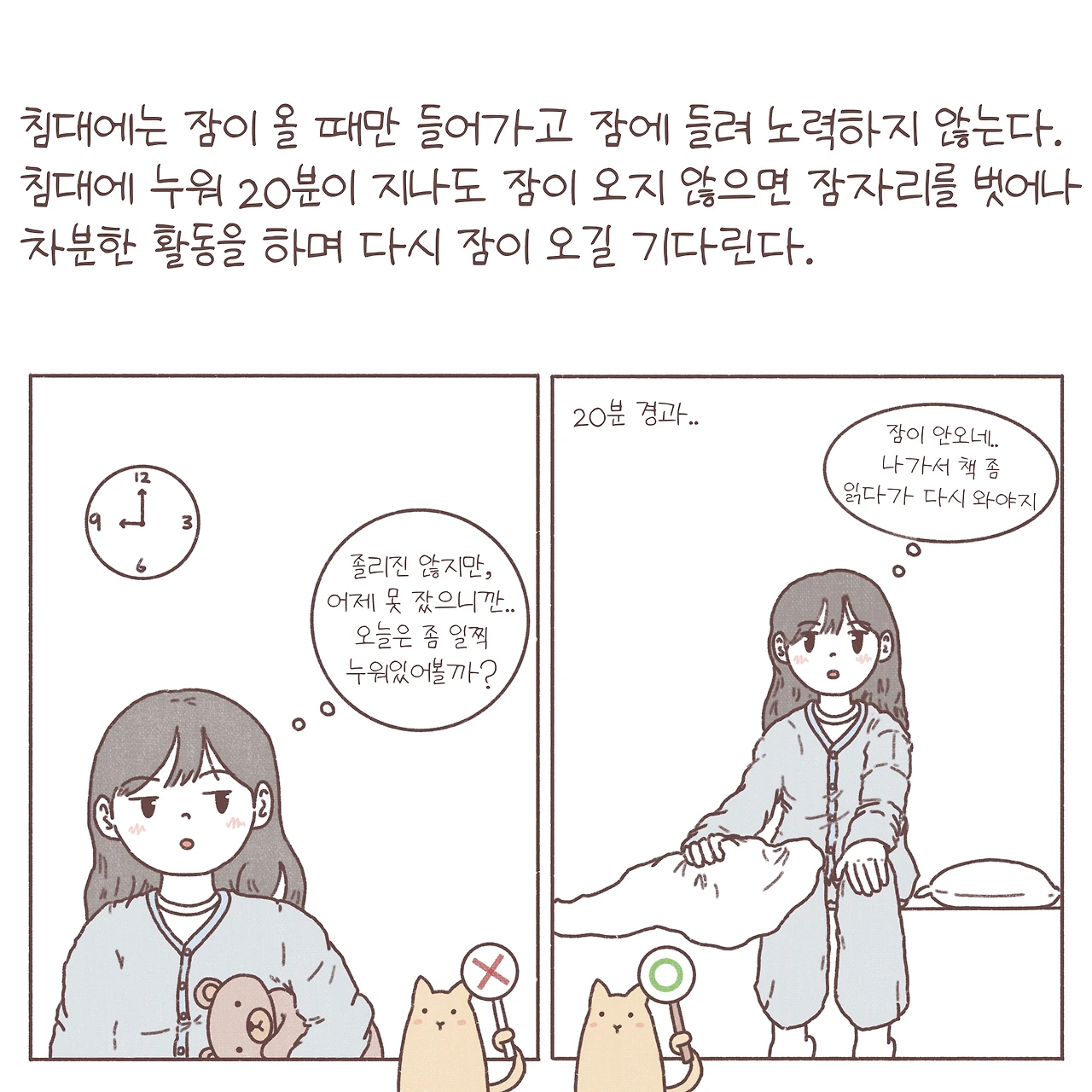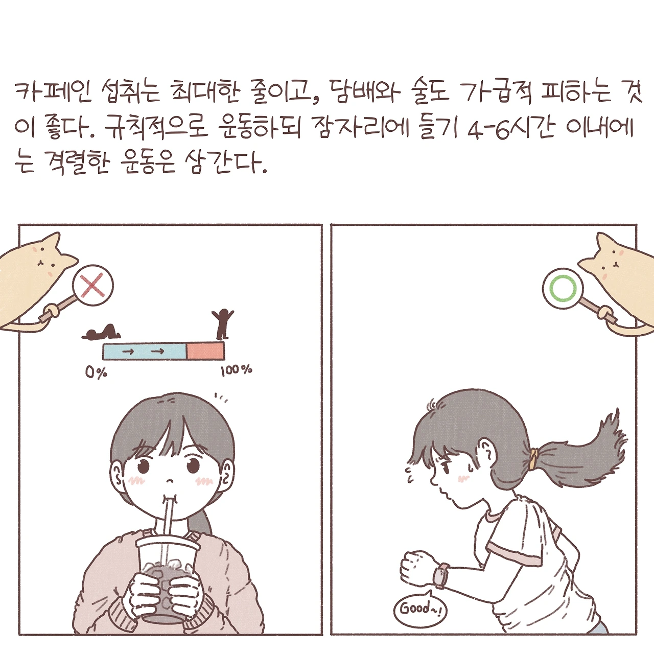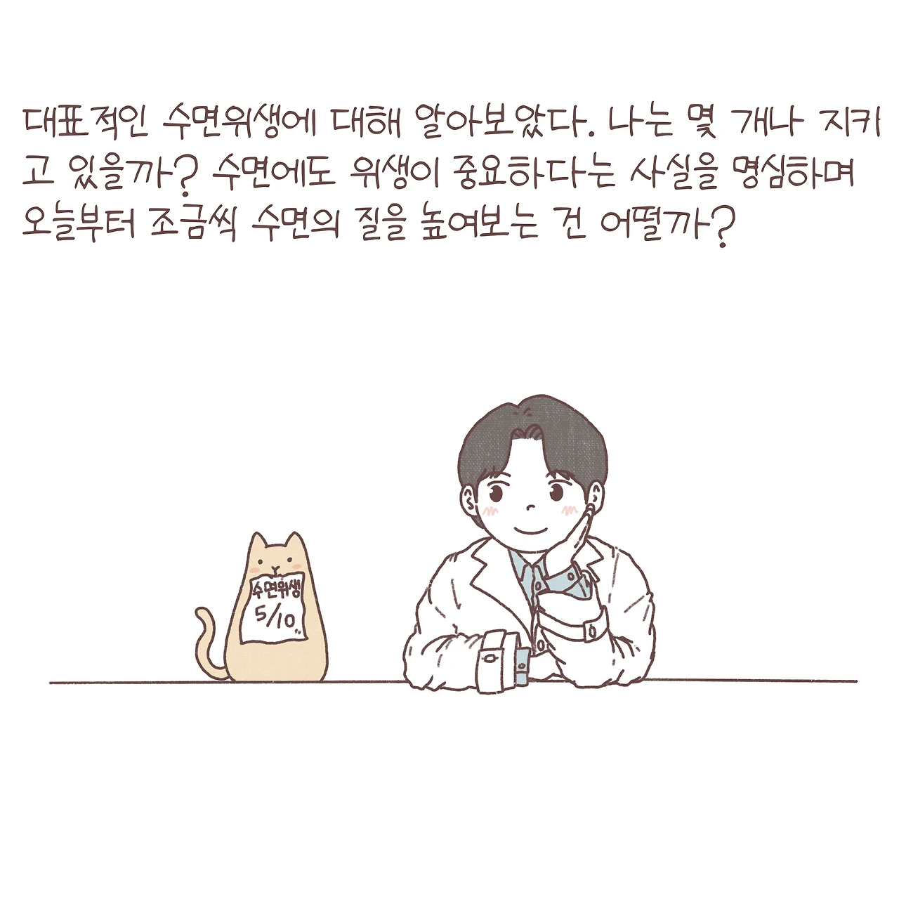 상식적으로 알고 있는 것들이 많지만, 저부터도 생각보다 지키지 않고 있는 것들이 많은 것 같네요. 그림으로 그려본 것들 이외에도 이완요법이나, 수면에 대한 잘못된 신념 버리기 등등 수면의 질을 높이기 위한 수면위생 권장사항들이 있답니다. 여러분들은 몇 가지나 지키고 있나요?