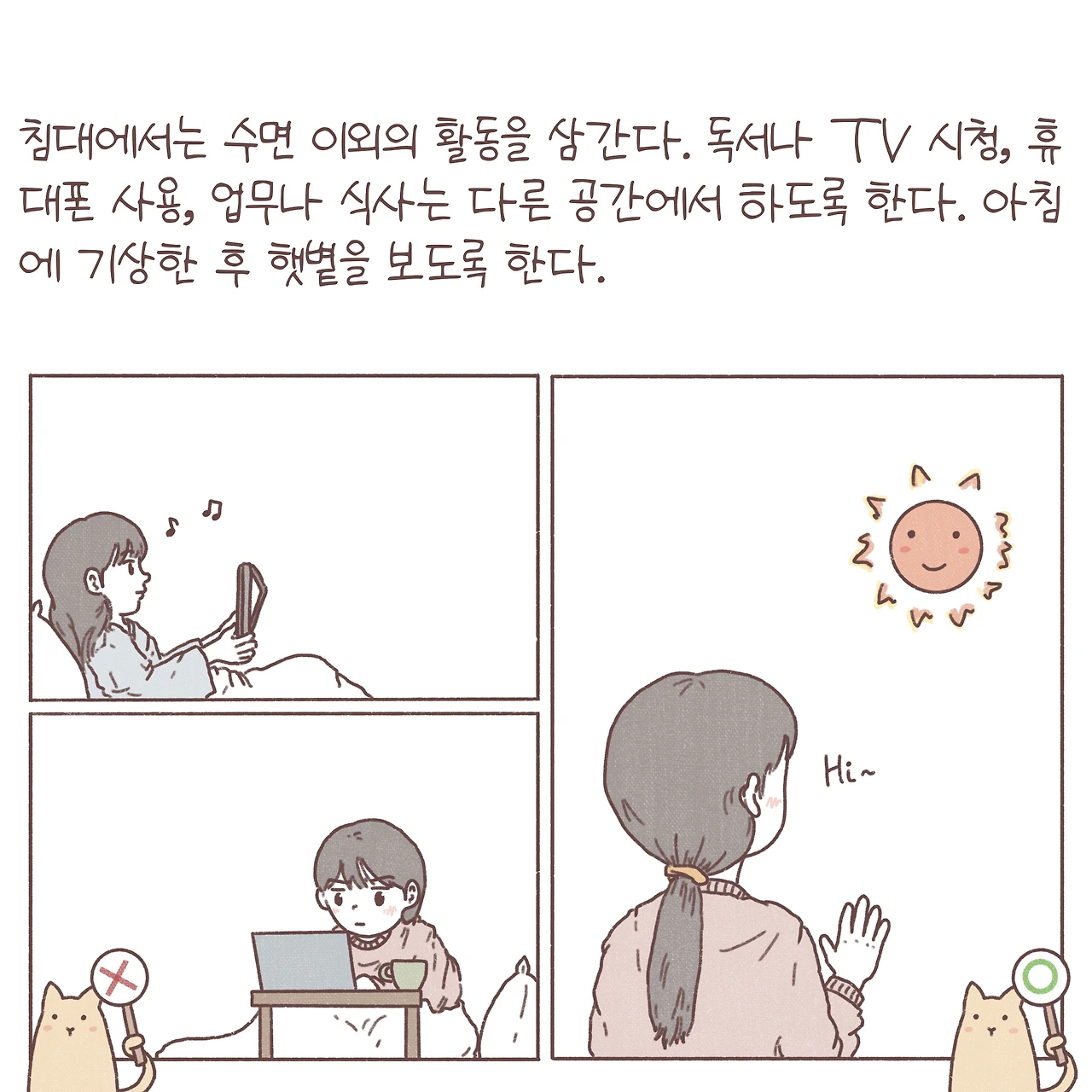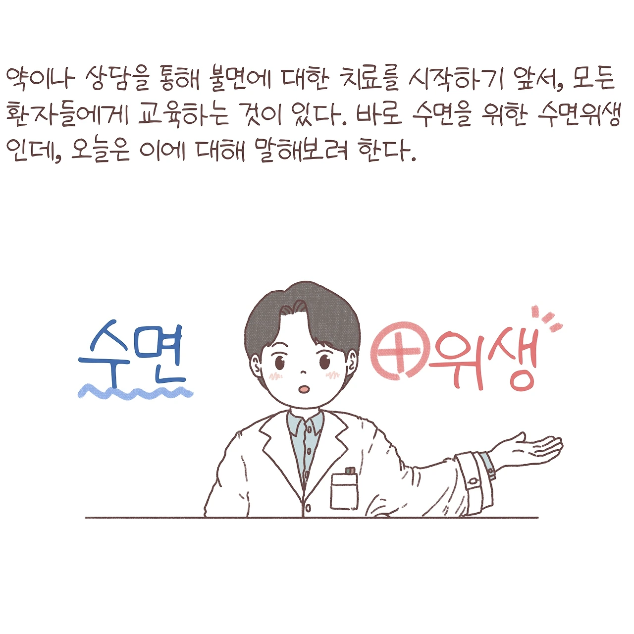 수면위생이란, 수면에 영향을 주는 개인적이고 환경적인 요인들에 대한 일련의 규칙 및 기본 정보를 뜻합니다.