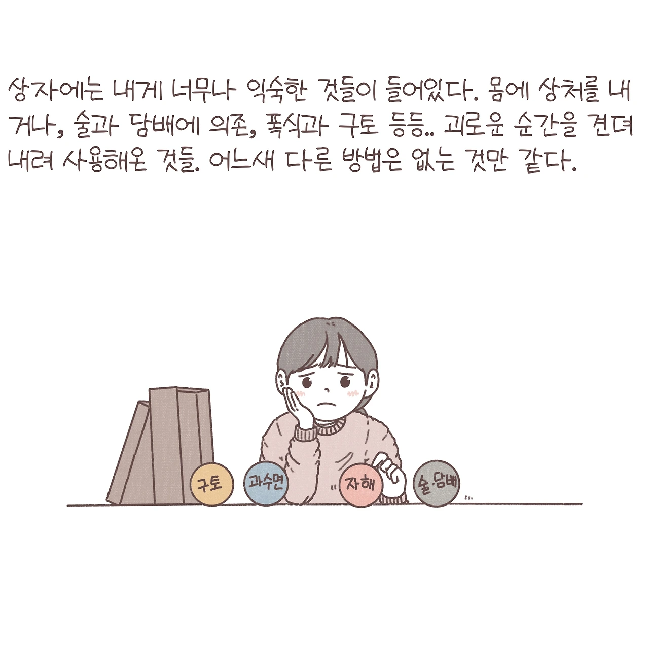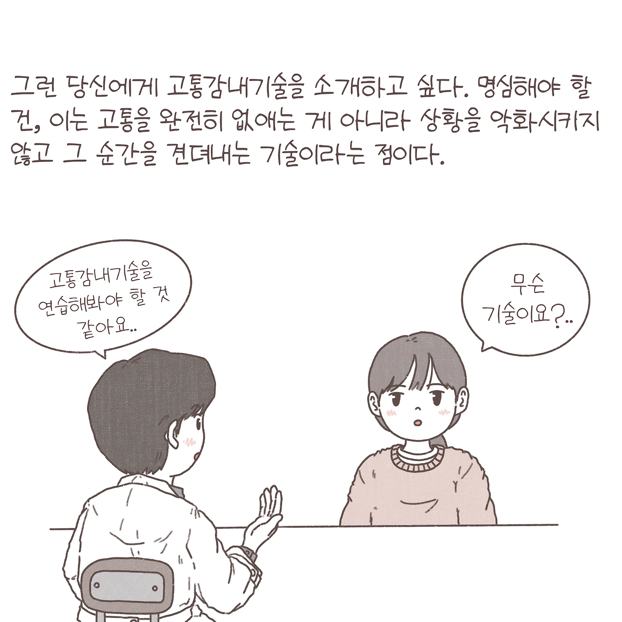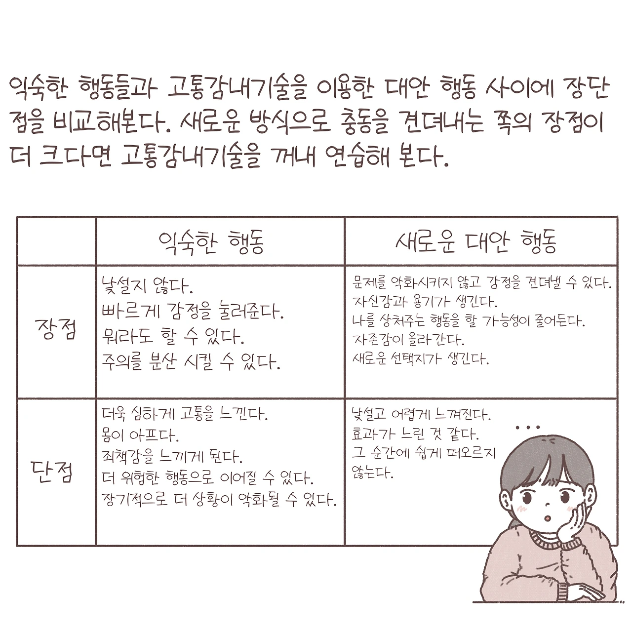 나도 사실 멈추고 싶은데, 그 방법을 모르겠고.. 하루에도 몇 번씩 나를 찾아오는 감정들은 떠나갈 것 같지가 않네요. 그런 누군가에게 고통감내기술을 소개하곤 합니다. 고통감내기술은 문제를 완전히 해결하는 방법은 아니지만, 내가 반복하던 위험한 행동들을 점차 안전한 대안행동으로 바꿔가는 기술들이랍니다. 처음에는 내게 익숙한 방법들에 비해 효과도 부족하고, 막상 그 순간에 떠오르지 않아 사용하기 어려워하는 경우가 많은 것 같아요. 하지만, 누구에게나 처음은 어려운 거랍니다. 처음부터 익숙했던 것은 하나도 없었듯, 차근차근 시간을 두고 연습해 간다면 지금은 낯선 이런 기술들이 언젠가 나를 괴로움으로부터 한걸음 나아갈 수 있도록 도움을 줄 수 있을 거예요. 짧은 만화로 설명하기는 많아 축약된 내용을 담았지만, 어려움을 겪고 있는 당신에게 작은 도움이 되길 바랍니다.