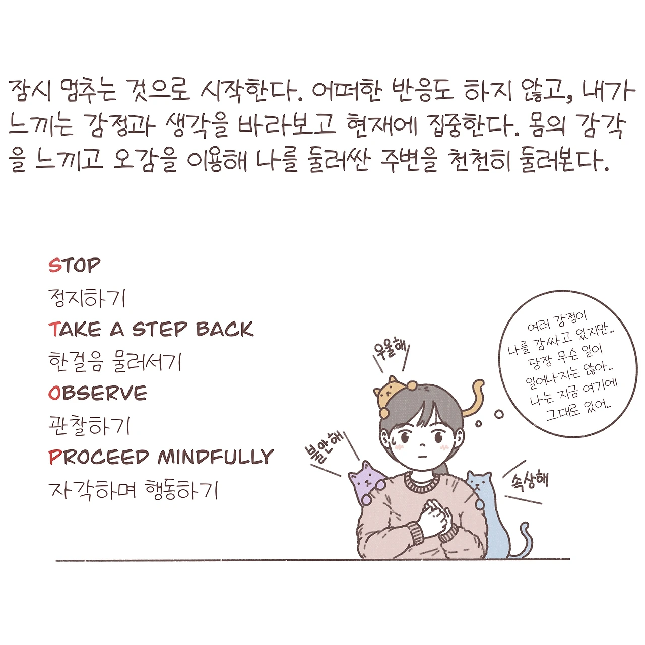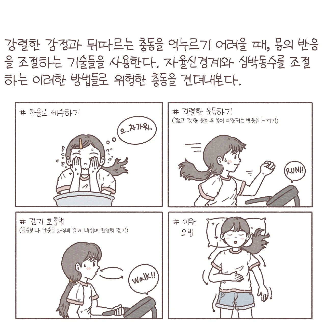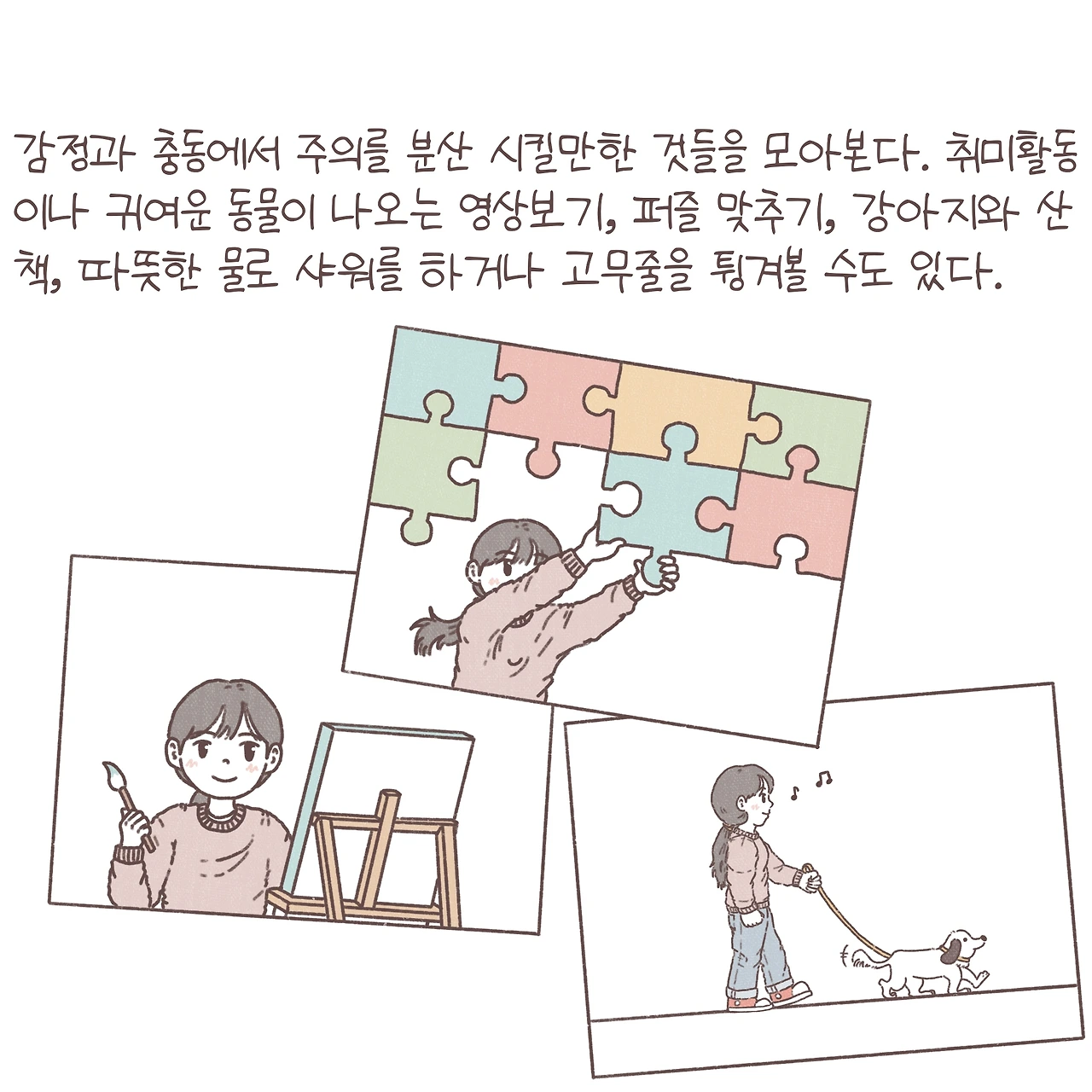 나도 사실 멈추고 싶은데, 그 방법을 모르겠고.. 하루에도 몇 번씩 나를 찾아오는 감정들은 떠나갈 것 같지가 않네요. 그런 누군가에게 고통감내기술을 소개하곤 합니다. 고통감내기술은 문제를 완전히 해결하는 방법은 아니지만, 내가 반복하던 위험한 행동들을 점차 안전한 대안행동으로 바꿔가는 기술들이랍니다. 처음에는 내게 익숙한 방법들에 비해 효과도 부족하고, 막상 그 순간에 떠오르지 않아 사용하기 어려워하는 경우가 많은 것 같아요. 하지만, 누구에게나 처음은 어려운 거랍니다. 처음부터 익숙했던 것은 하나도 없었듯, 차근차근 시간을 두고 연습해 간다면 지금은 낯선 이런 기술들이 언젠가 나를 괴로움으로부터 한걸음 나아갈 수 있도록 도움을 줄 수 있을 거예요. 짧은 만화로 설명하기는 많아 축약된 내용을 담았지만, 어려움을 겪고 있는 당신에게 작은 도움이 되길 바랍니다.