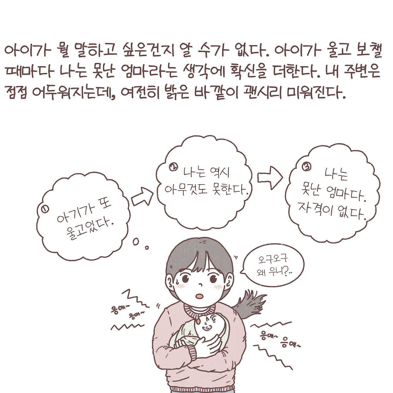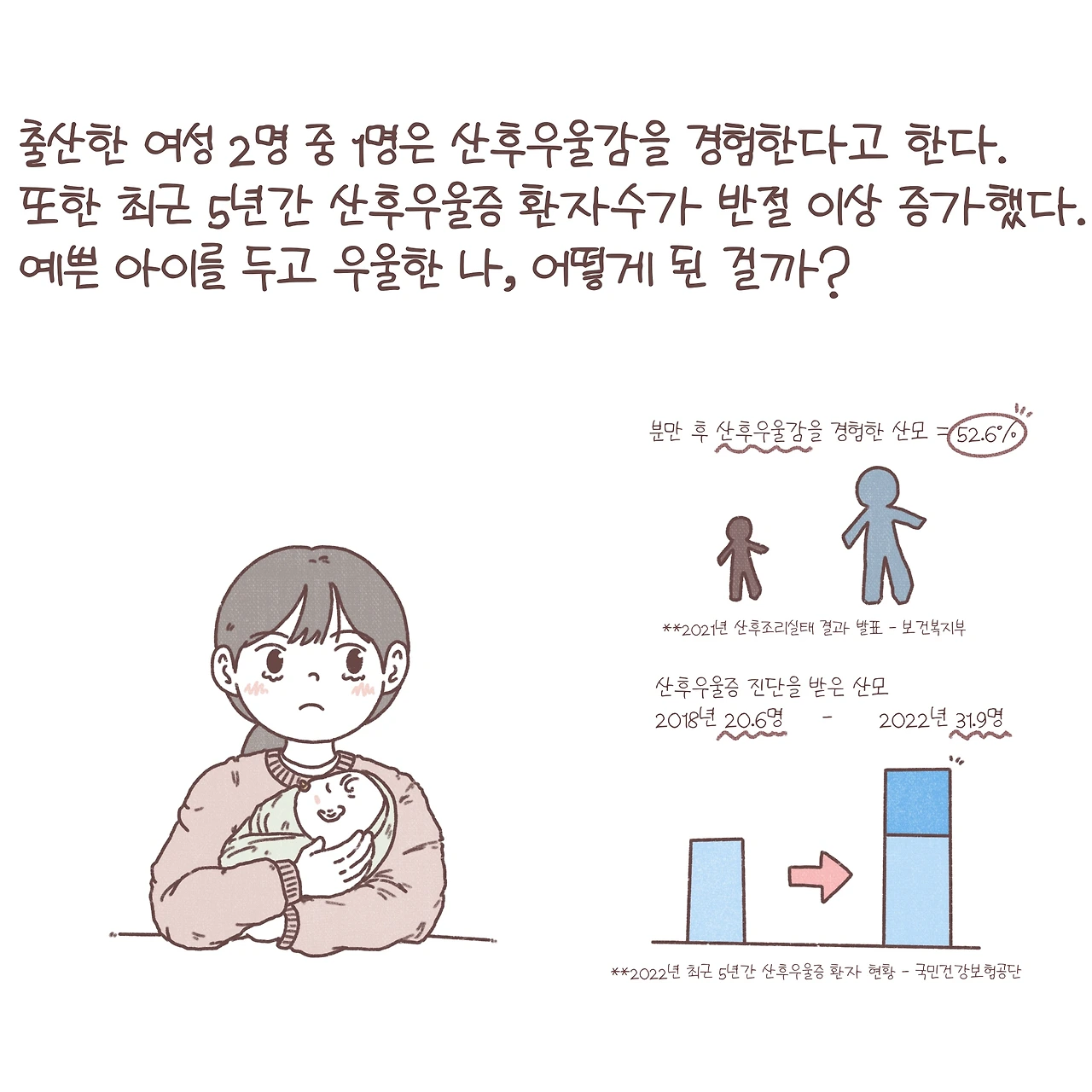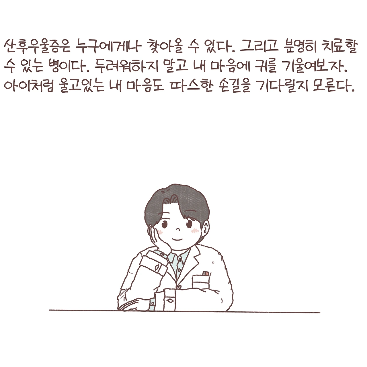 최근에 산부인과에서 산후우울증에 대한 강의를 하게 되어서 관련된 내용들을 찾아보다가 만화로 그려두면 좋겠다 싶어 짧게 내용을 정리해 봤습니다. 사실, 진단기준이나 증상 자체가 우리가 아는 우울증과 크게 다르지는 않지만, 임신기간, 출산 후 기간에 발생해서 산모와 아이에게 큰 영향을 미친다는 것이 산후우울증의 특징인 것 같네요. 누군가에게는 간절히 원하던 임신과 출산이라는 일. 그리고 기다림 끝에 태어난 아이를 끌어안고 남몰래 눈물을 흘리는 일은 정말 힘든 일이 아닐까 싶어요. 산후우울증도 우울증처럼 호르몬의 변화나 우울증 과거력, 가족력과 같은 생물학적 요인들, 갑작스레 변한 사회환경적인 요인, 아이와 육아에 대한 스트레스를 비롯한 심리적 요인까지 다양한 원인들에 의해 발생합니다. 이번 이야기에는 그중 엄마가 되었다는 심리적 압박감으로 인한 어려움에 초점을 맞춰봤어요. 온종일 아이를 돌보느라 어느새 나를 돌보는 것을 잊어버린, 엄마라는 단어에 내가 사랑했던 많은 것들을 잠시 포기한, 서툴지만 분명 조금씩 앞으로 나아갈 누군가에게 작은 위로를 전해봅니다.