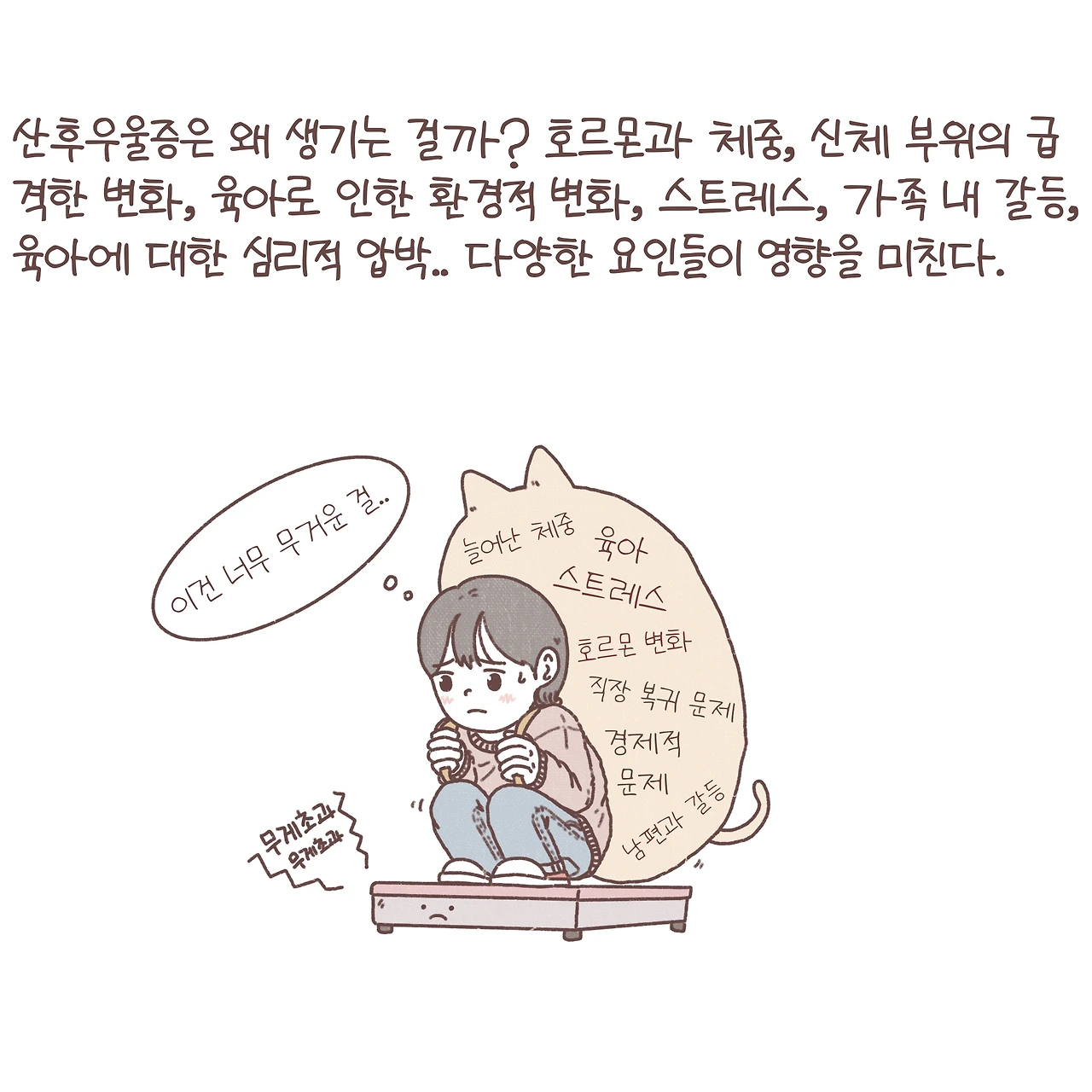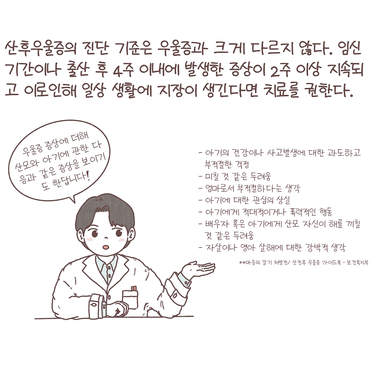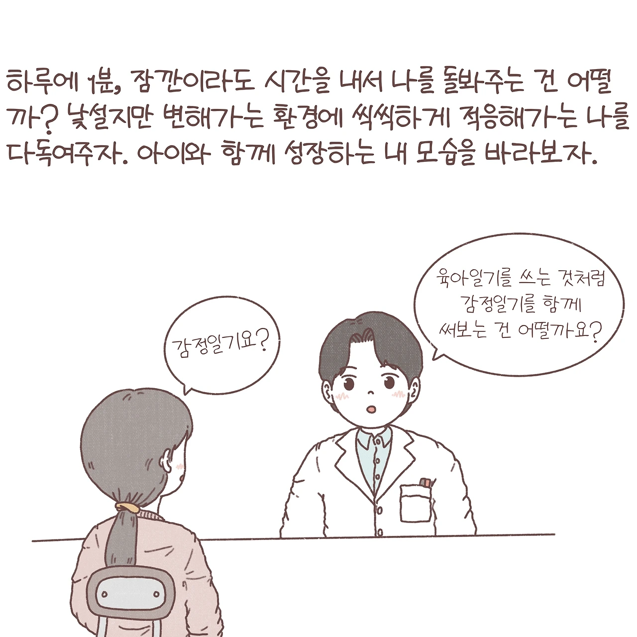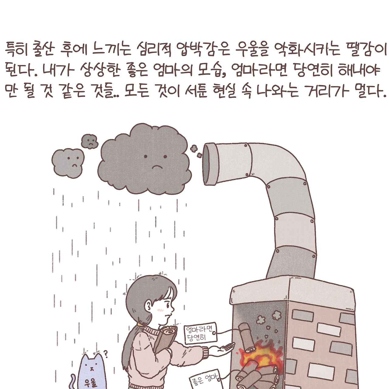 최근에 산부인과에서 산후우울증에 대한 강의를 하게 되어서 관련된 내용들을 찾아보다가 만화로 그려두면 좋겠다 싶어 짧게 내용을 정리해 봤습니다. 사실, 진단기준이나 증상 자체가 우리가 아는 우울증과 크게 다르지는 않지만, 임신기간, 출산 후 기간에 발생해서 산모와 아이에게 큰 영향을 미친다는 것이 산후우울증의 특징인 것 같네요. 누군가에게는 간절히 원하던 임신과 출산이라는 일. 그리고 기다림 끝에 태어난 아이를 끌어안고 남몰래 눈물을 흘리는 일은 정말 힘든 일이 아닐까 싶어요. 산후우울증도 우울증처럼 호르몬의 변화나 우울증 과거력, 가족력과 같은 생물학적 요인들, 갑작스레 변한 사회환경적인 요인, 아이와 육아에 대한 스트레스를 비롯한 심리적 요인까지 다양한 원인들에 의해 발생합니다. 이번 이야기에는 그중 엄마가 되었다는 심리적 압박감으로 인한 어려움에 초점을 맞춰봤어요. 온종일 아이를 돌보느라 어느새 나를 돌보는 것을 잊어버린, 엄마라는 단어에 내가 사랑했던 많은 것들을 잠시 포기한, 서툴지만 분명 조금씩 앞으로 나아갈 누군가에게 작은 위로를 전해봅니다.