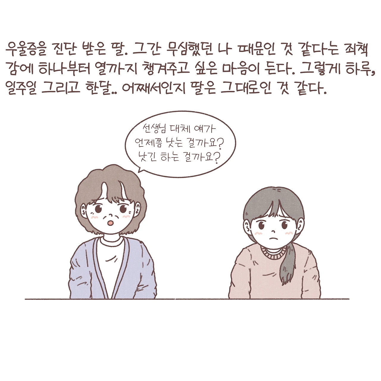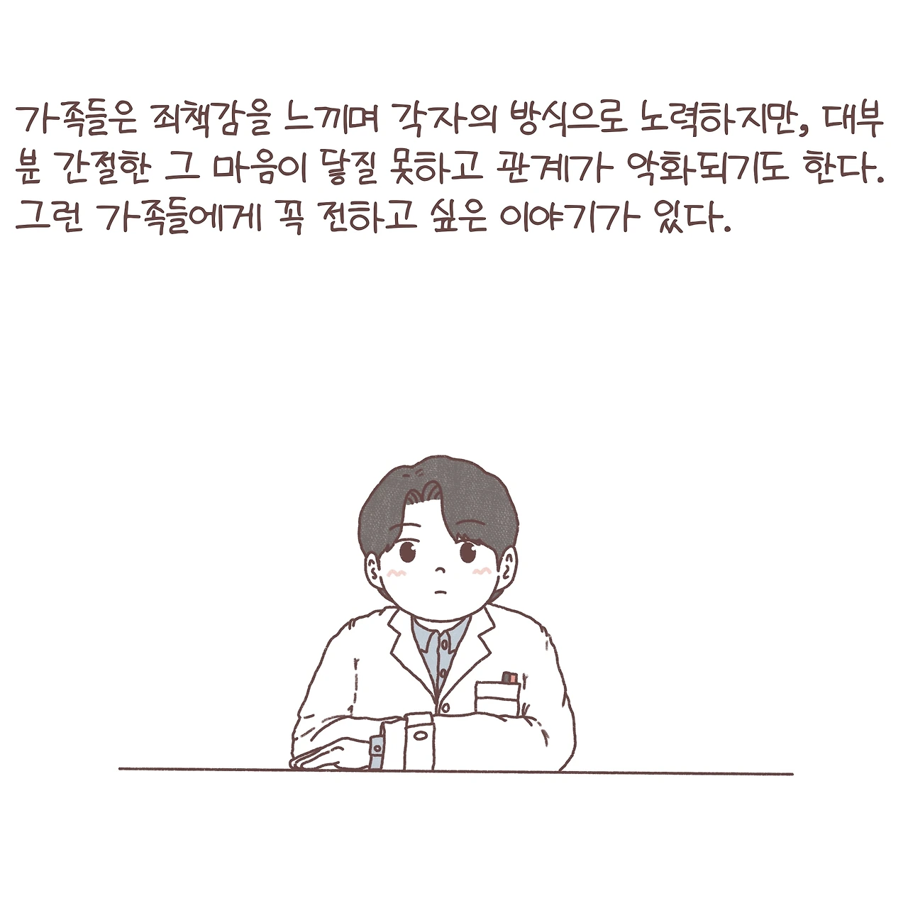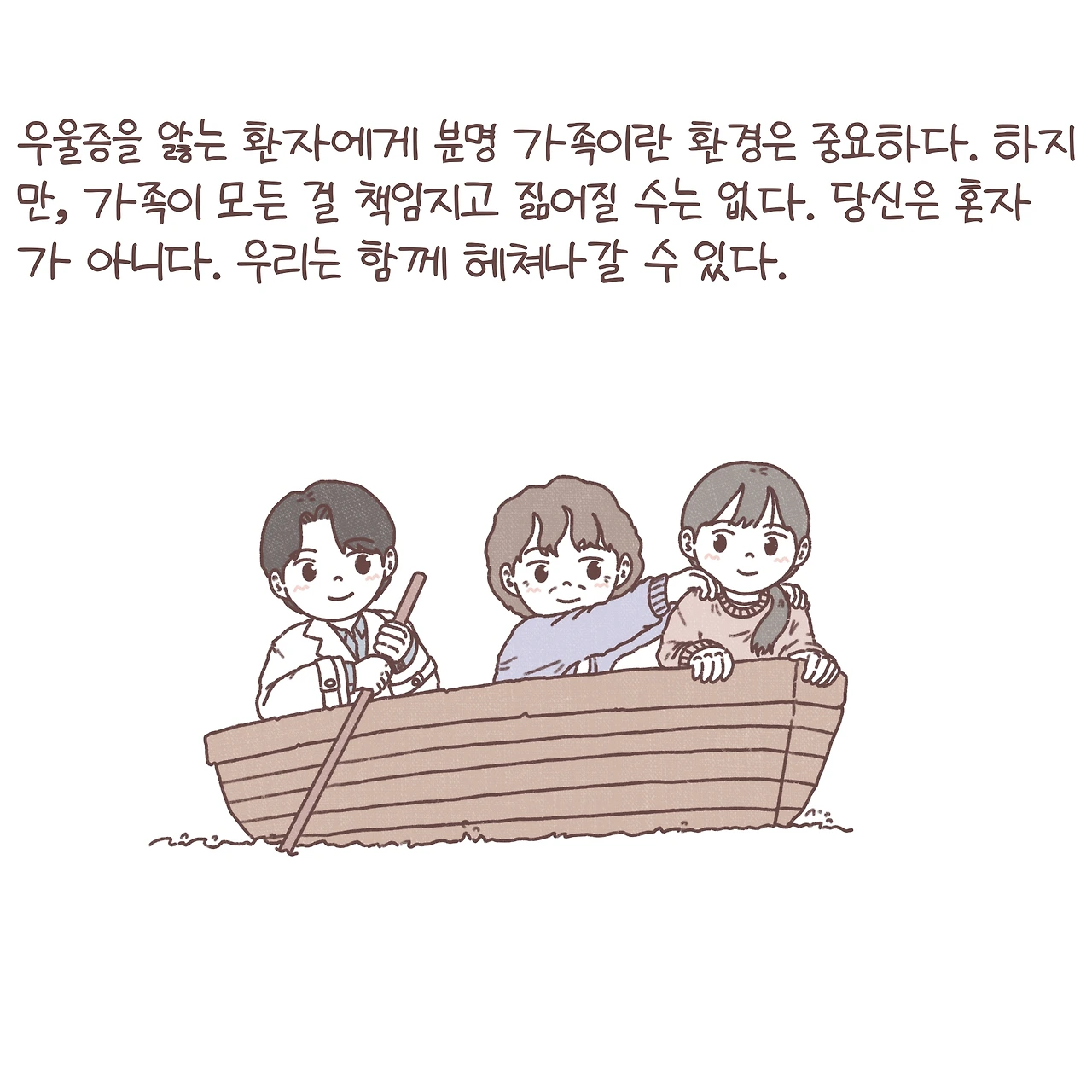 어떤 내용을 담아야 할까 참 무겁게 느껴졌던 것 같습니다. 우울증 뿐만 아니라 정신질환을 앓는 환자와 함께 살아가는 가족들이 겪는 어려움은 그 무게를 가늠하기가 쉽지 않은 것 같아요. 어떤 말도 모두를 위로할 수 없고, 어떤 조언도 모두의 정답이 될 수 없음을 알지만, 짧은 시간 동안 제가 만나왔던 환자분들과 그 가족들을 떠올리며 작은 위로의 말을 건네봅니다.