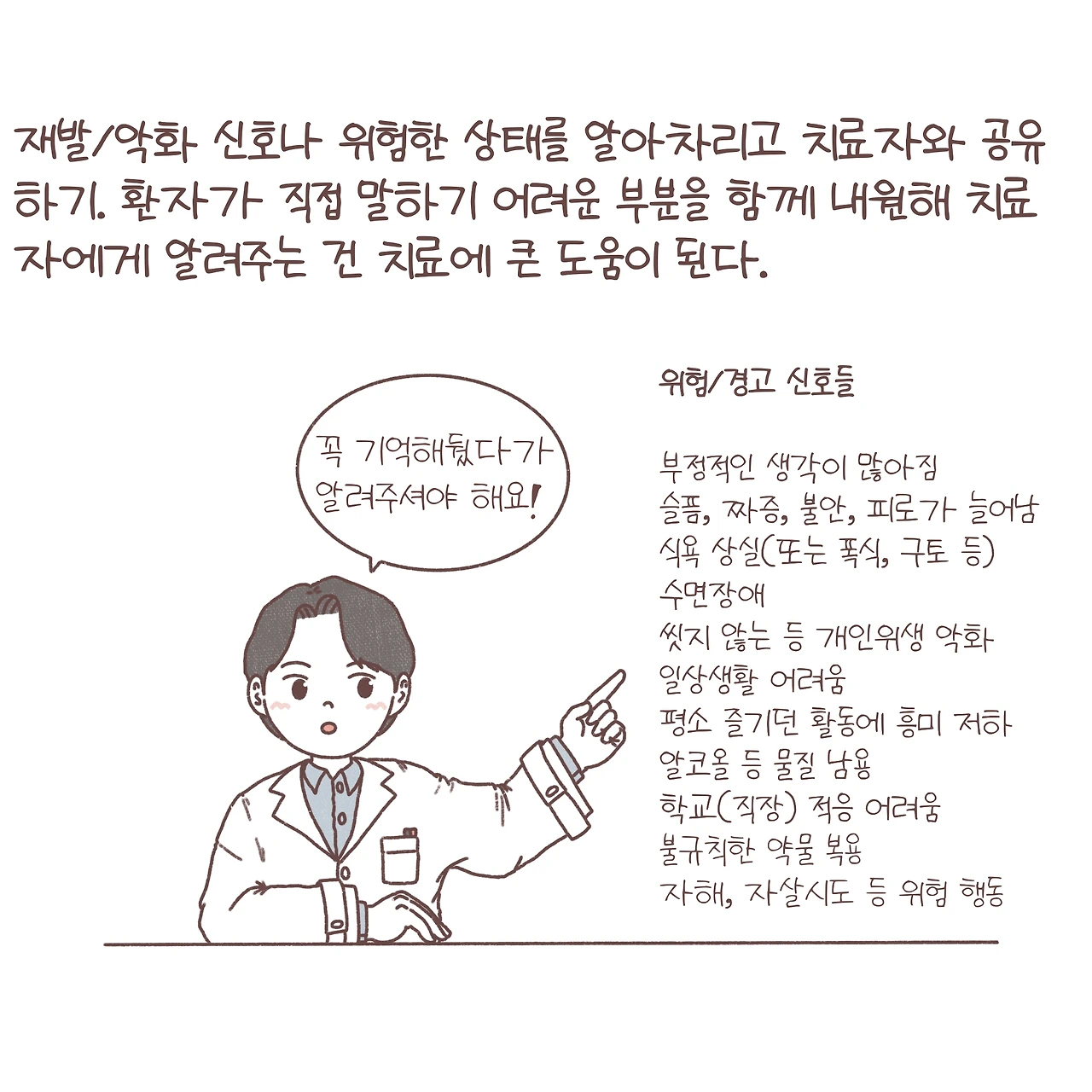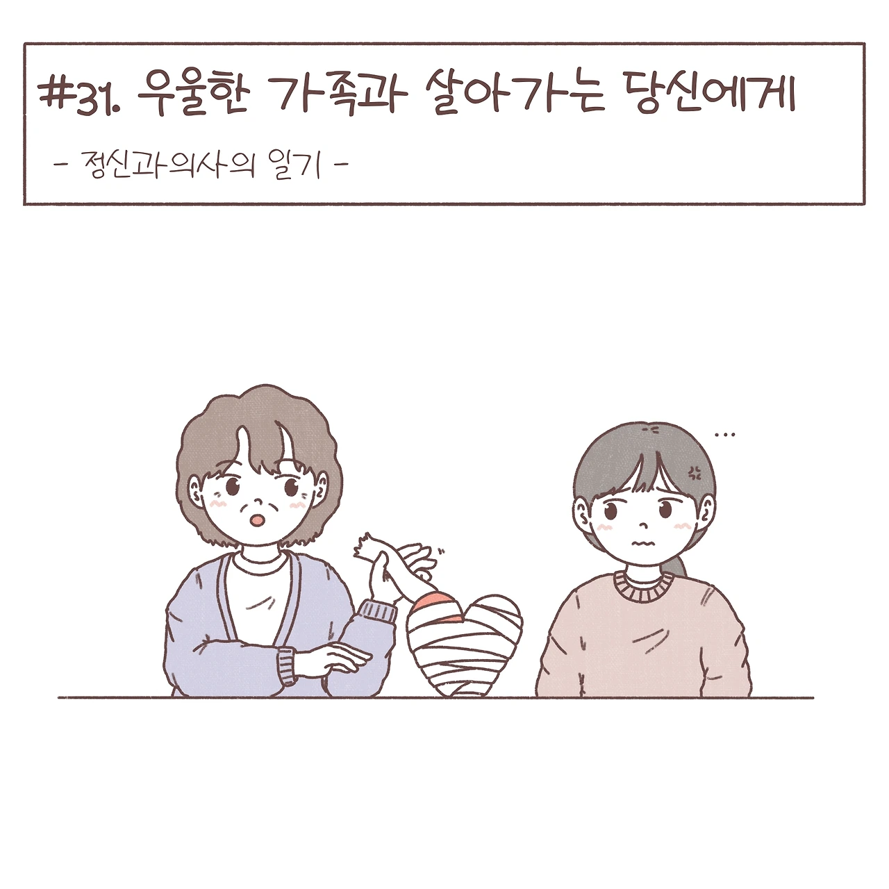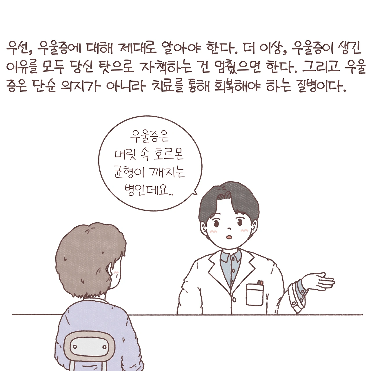 어떤 내용을 담아야 할까 참 무겁게 느껴졌던 것 같습니다. 우울증 뿐만 아니라 정신질환을 앓는 환자와 함께 살아가는 가족들이 겪는 어려움은 그 무게를 가늠하기가 쉽지 않은 것 같아요. 어떤 말도 모두를 위로할 수 없고, 어떤 조언도 모두의 정답이 될 수 없음을 알지만, 짧은 시간 동안 제가 만나왔던 환자분들과 그 가족들을 떠올리며 작은 위로의 말을 건네봅니다.