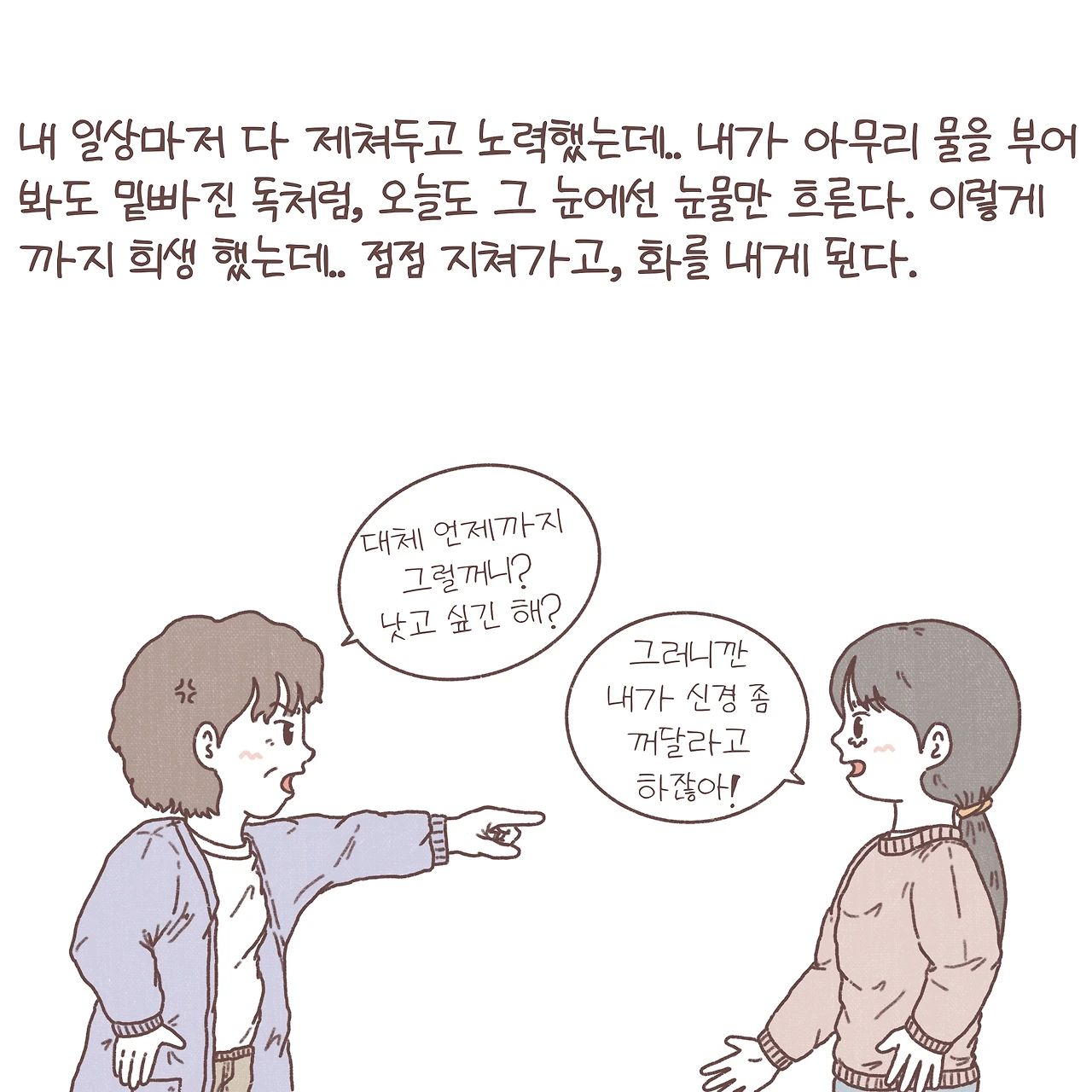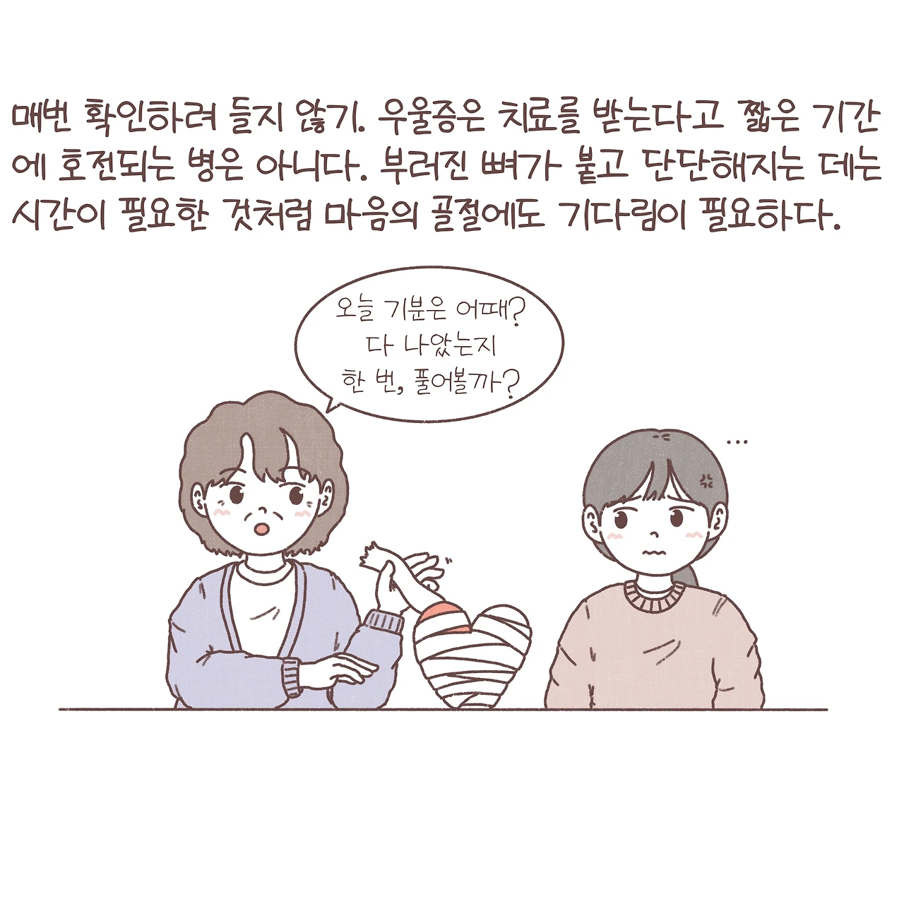 이야기를 만들면서 수전 J 누난 작가의 <우울한 사람 곁에서 무너지지 않게 도움 주는 법>이라는 책을 참고했어요. 우울증을 비롯한 기분장애를 겪는 환자와 함께 살아갈 가족들이 알아두면 좋을 여러 디테일한 지식과 조언들을 담은 책이랍니다. 배우자 또는 자녀, 부모님 혹은 친구가 우울증으로 힘들어하고 있다면? 나는 어떤 태도를 보여야 할까.. 혹시 내 말이나 행동이 상처가 되지는 않을까? 고민하는 당신에게. 병에 대해 잘 알고, 위험/재발 신호를 눈여겨보고, 스스로를 챙기는 걸 잊지 않으면서 함께 기다려주라는 어쩌면 당연하지만, 때로는 놓치기 쉬운 것들을 조심스레 전해봅니다.