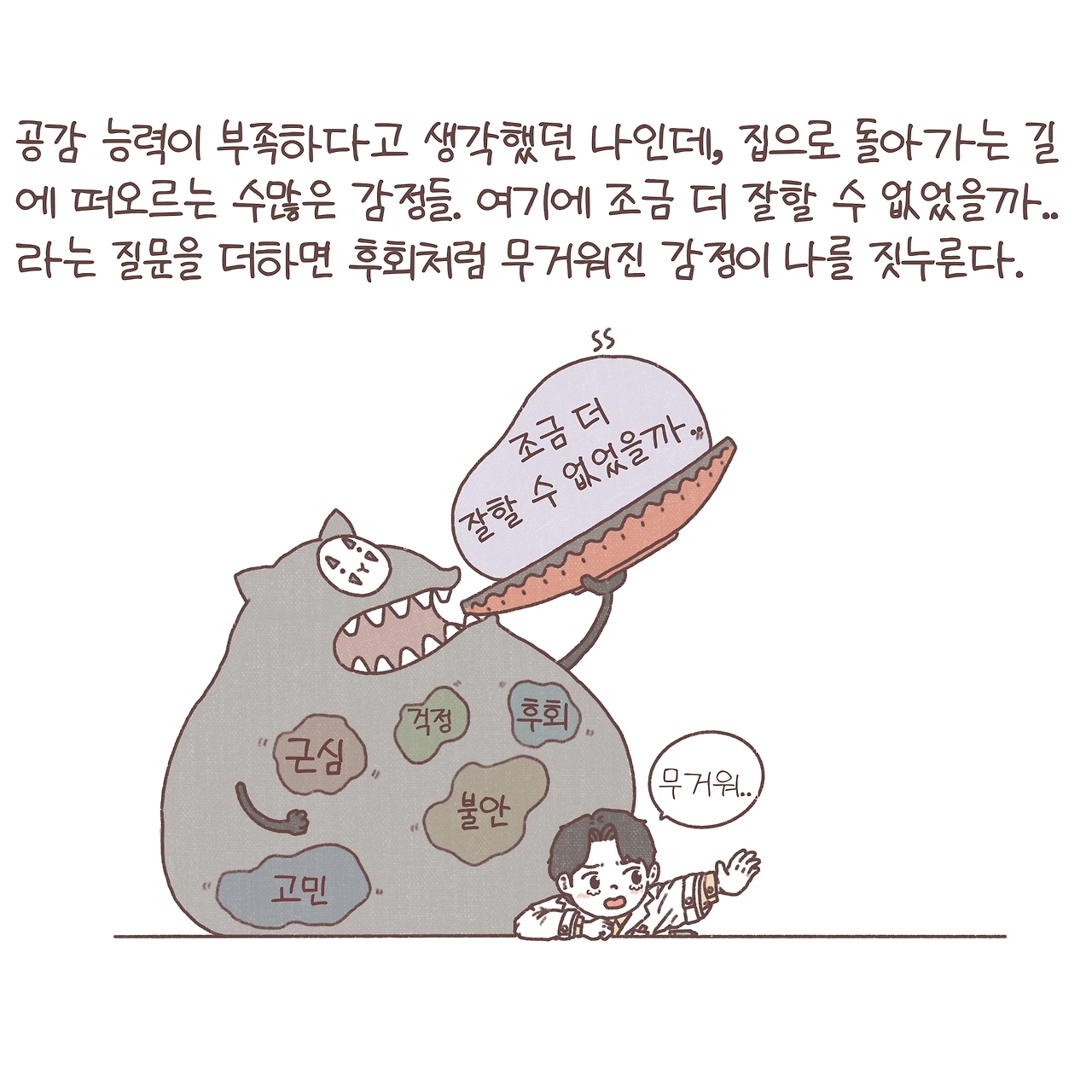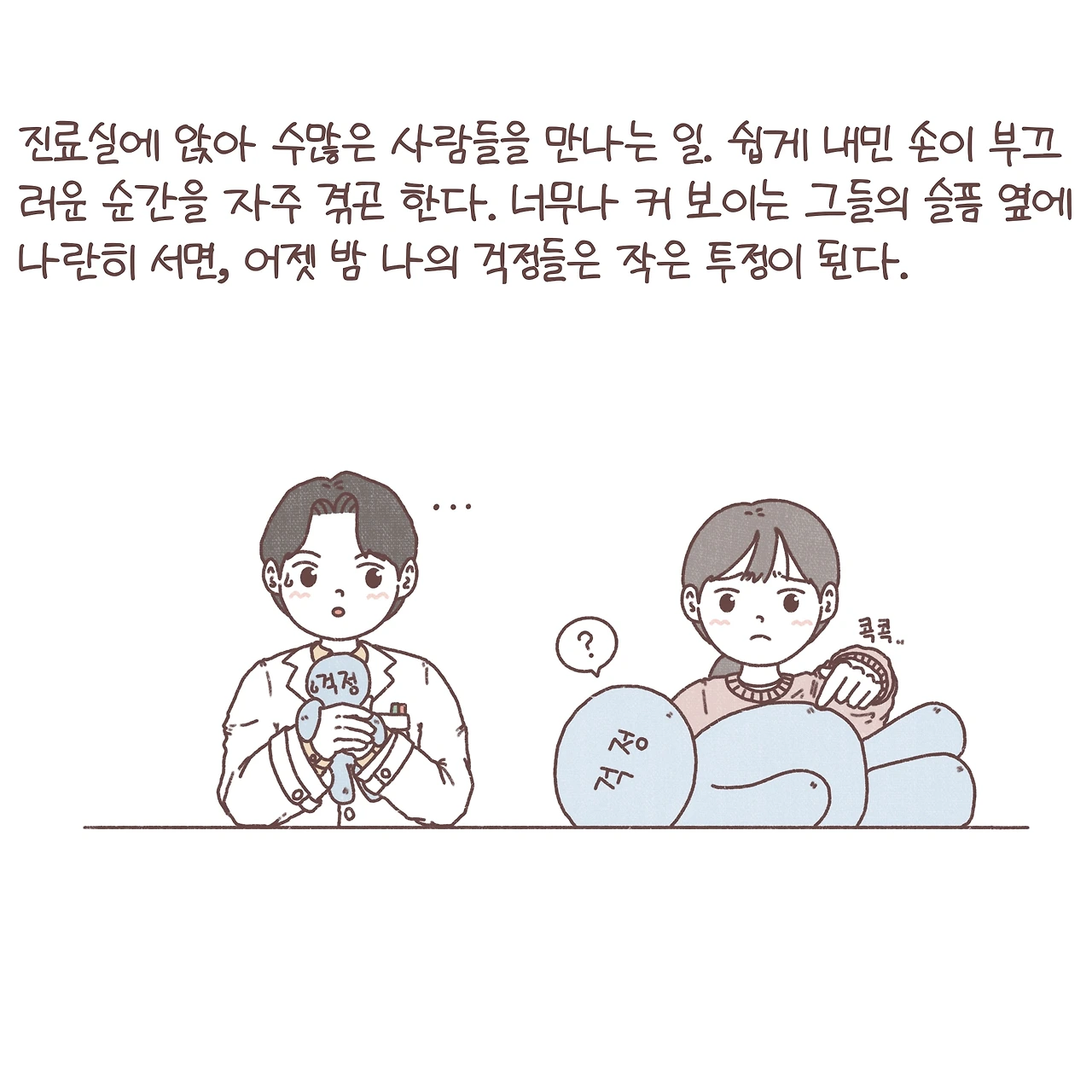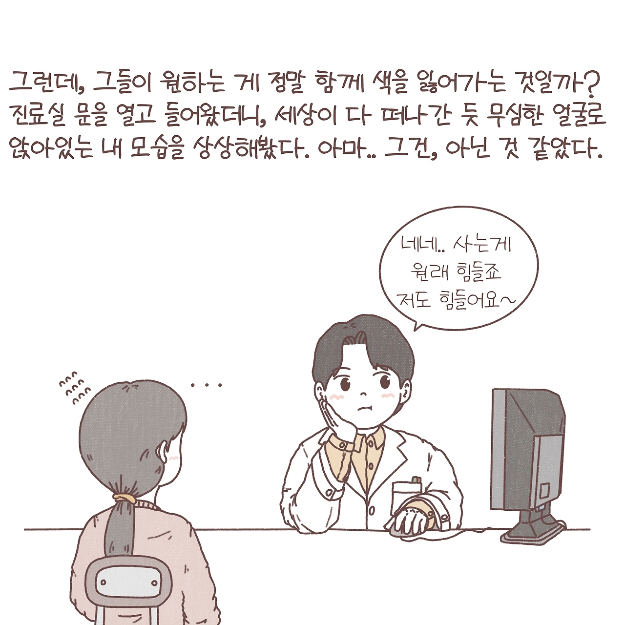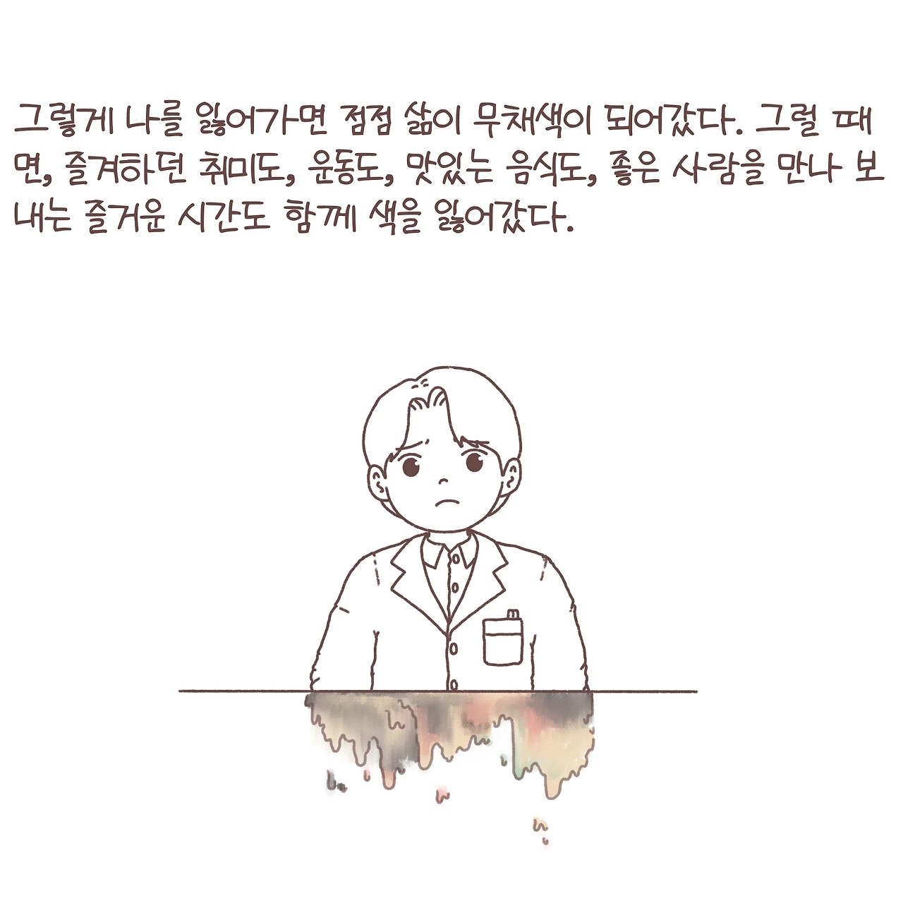 정신과의사가 되어 일을 시작한 지 얼마 되지 않았을 때, 주기적으로 겪는 어려움이 있었습니다. 바로, 삶이 무채색으로 변해 아무것도 재미가 없고, 주변의 자극에도 크게 반응하지 않는 상태가 되는 거였죠. 원래 에너지가 넘치는 성격도 아닌 터라, 더 가라앉아 버린 제 모습이 주변 사람들을 상처주기도 했던 것 같아요. 환자들과 이야기를 나누다 보면, 제가 겪어보지 못한 수많은 고난과 어려움, 고통, 슬픔을 마주합니다. 그런 이야기를 계속 듣다 보면, 어젯밤 잠들기 전 고민했던 제 인생 속 걱정거리들은 정말 보잘것없는 작은 투정처럼 느껴지곤 했어요. 그렇게 점점 내가 작아지다 보면, 어느 날 갑자기 삶이 무채색으로 변하곤 했습니다. 이런 거에 짜증내서 뭐 해.. 걱정해서 뭐 해.. 큰 일도 아닌데, 저런 거에 재밌어하면 뭐 해.. 세상은 그렇게 힘든데.. 자꾸만 가라앉는 거울 속 내 모습을 보면서도, 일을 처음 시작한 거니깐 어쩔 수 없다며 스스로를 다그쳤답니다.