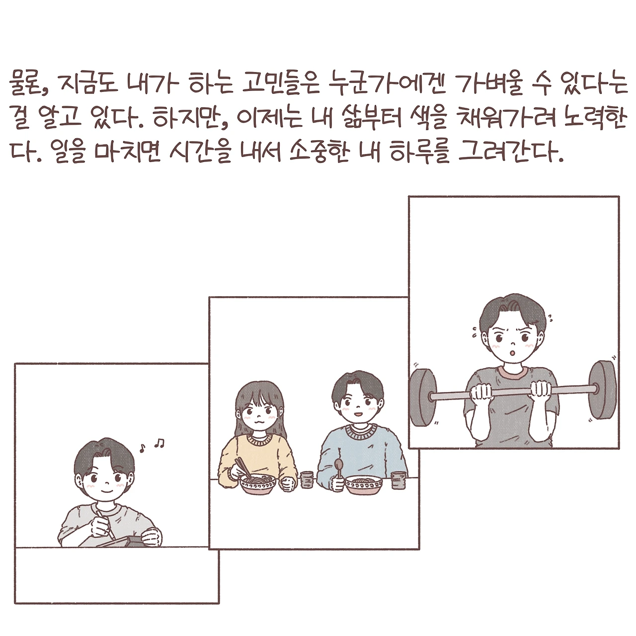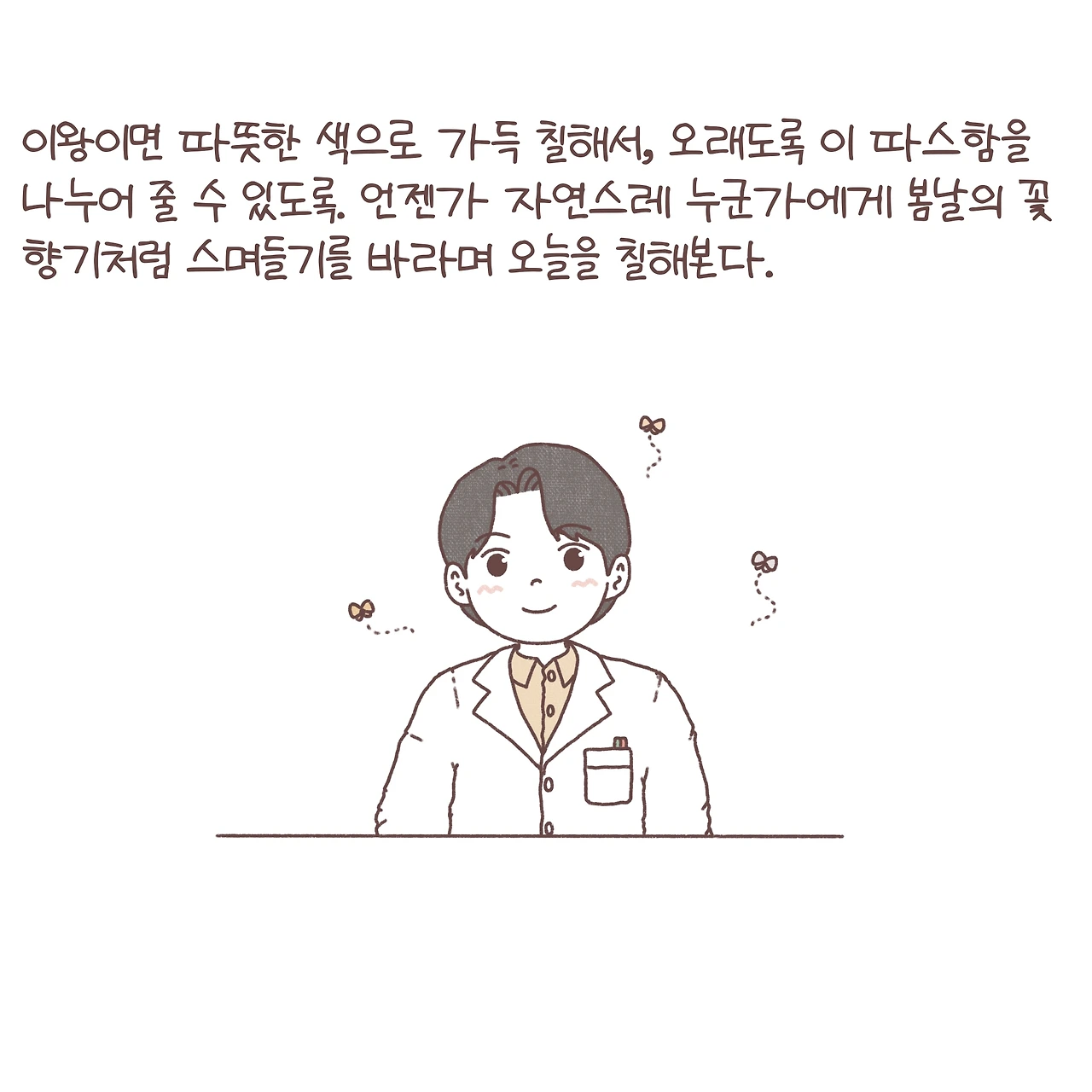 하지만, 저를 만나러 오는 환자들이 제게 원하는 건 함께 색을 잃어가는 건 아닐 것이 분명했습니다. 제 역할에 대해 고민하고 또 고민해 제가 내린 정답은 ‘함께 색을 잃어가는 것이 아닌, 내가 가진 따뜻한 색을 나누어 주는 것’이었어요. 누군가에게 색을 나누어주기 위해 우선, 나부터 색을 채워가기로 결심했습니다. 이왕이면, 따뜻한 색으로 가득 채워 봄처럼 은은하게 스며들 수 있도록. 오늘도 그림을 그리고, 사랑하는 사람과 맛있는 저녁을 먹고, 운동을 하며 저만의 색을 채워봅니다.