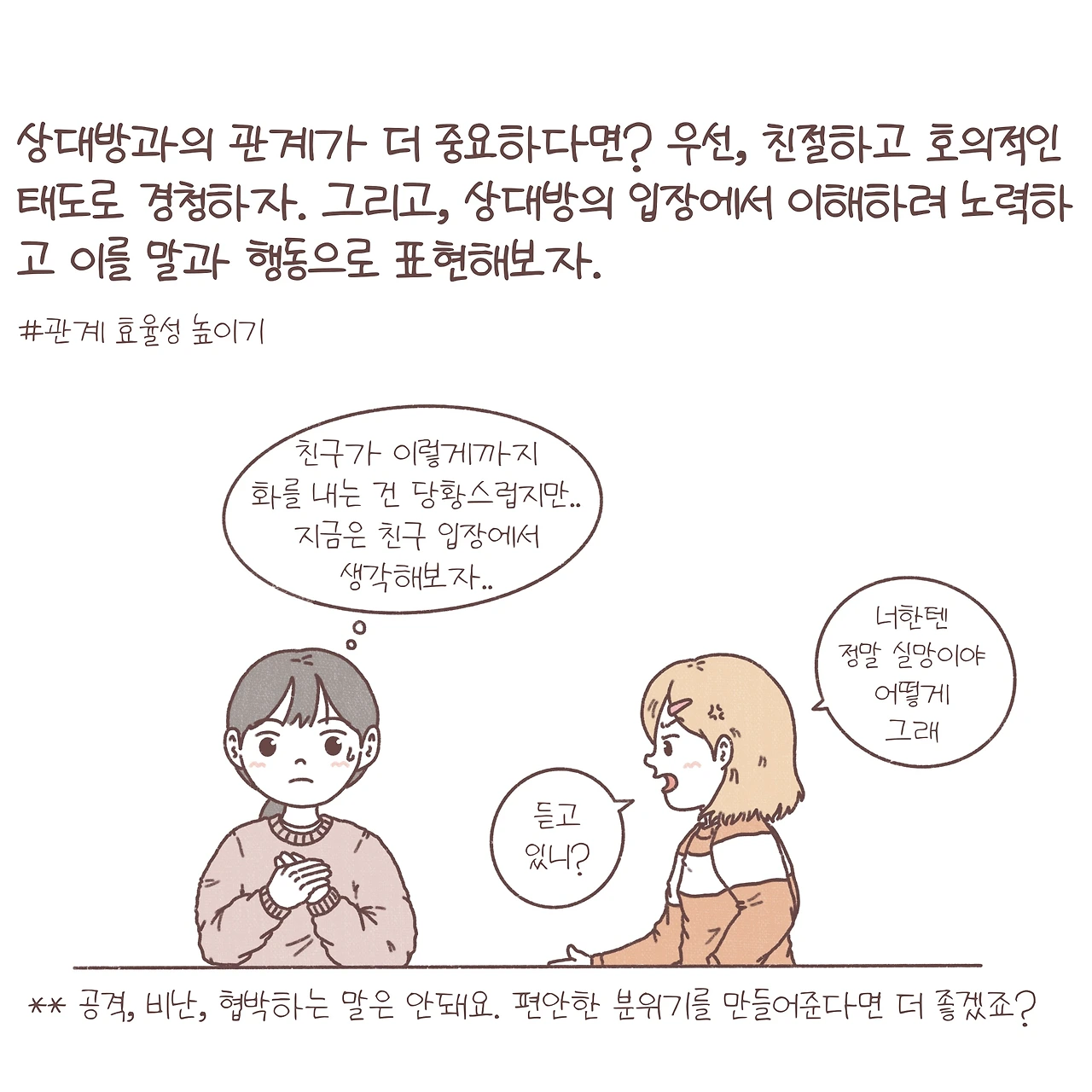 - 관계효율성을 높여야 할 때는 우선 상대방이 어떤 태도와 말을 하던 경청 하며 이해하려 노력하는 게 필요해요. 수인이라고 부르기도 하는데, 모든 것이 이해되지 않더라도 상대방의 입장에서 충분히 그럴 수 있겠다는 태도를 가져보는 거예요. 나와 생각이 다르더라도 절대 공격하거나 비난하지 않고, 상대방이 편안하게 느끼도록 유머를 섞어가며 대화를 나눠보면 더 좋을 것 같아요.