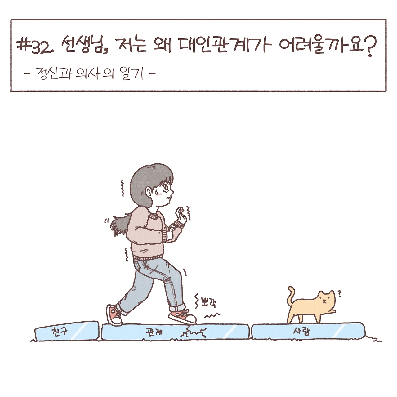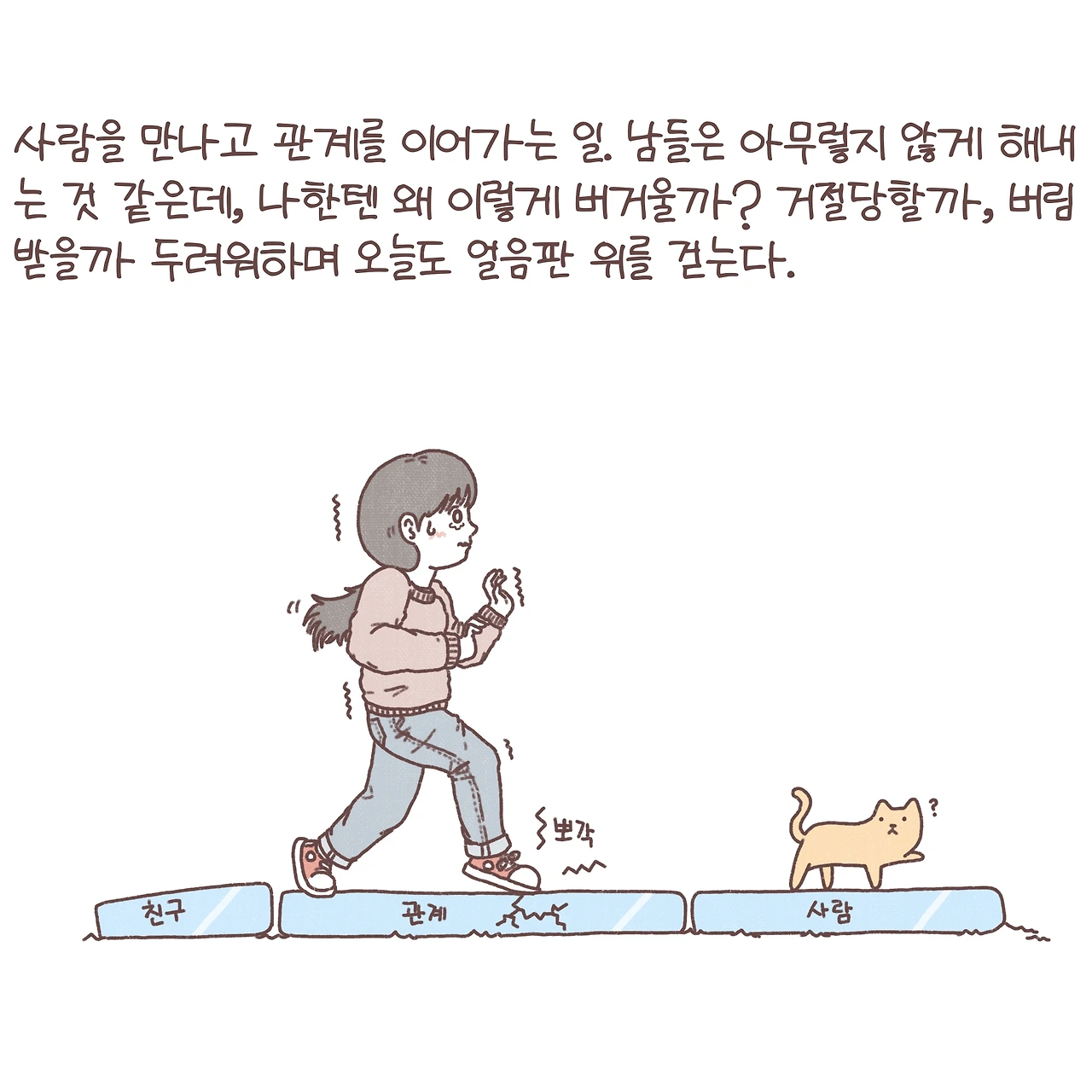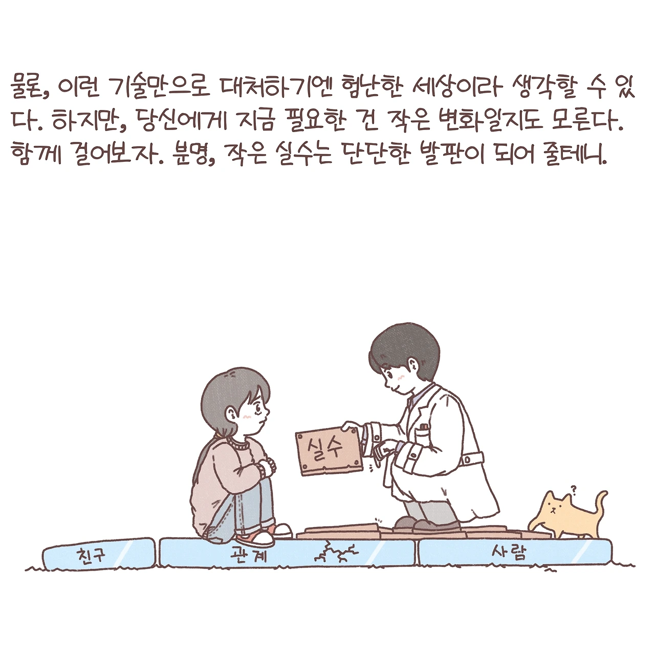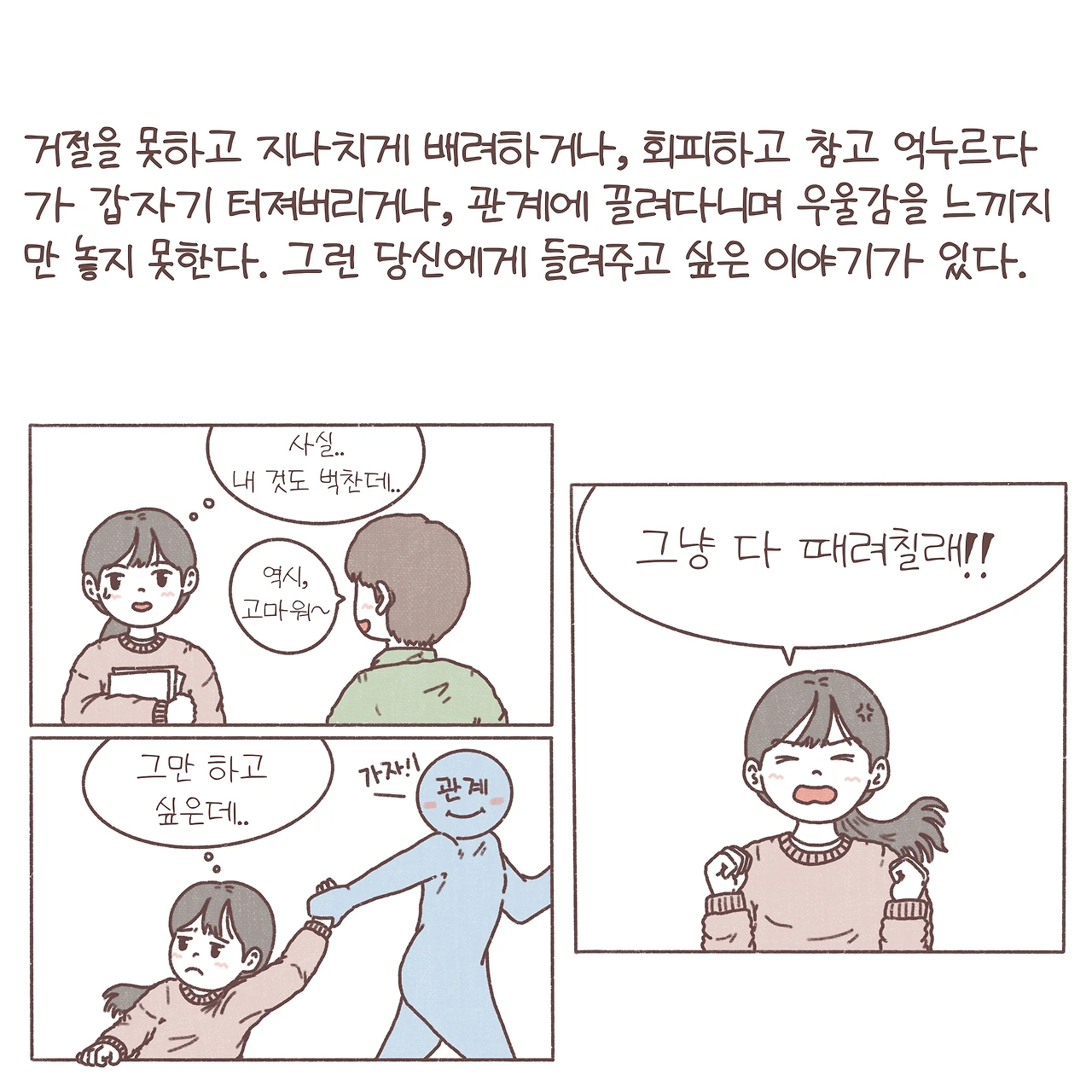 짧게 적힌 글만 보고 세상을 살아가며 겪는 우리들의 수많은 관계들을 쉽게 쉽게 풀어갈 수는 없다는 걸 압니다. 하지만, 관계의 어려움에 대해 함께 고민해 줄 누군가가 있다는 걸 기억해 두고, 언젠가 어려움이 찾아왔을 때 혼자서만 고민하지 않았으면 해요. 관계에 정해진 정답은 없겠지만, 내가 반복하고 있던 패턴을 파악하고 작은 변화를 따라가다 보면 분명 내가 두려워하던 실패들이 단단한 발판이 되어 딛고 나아갈 수 있을 거라 믿습니다.