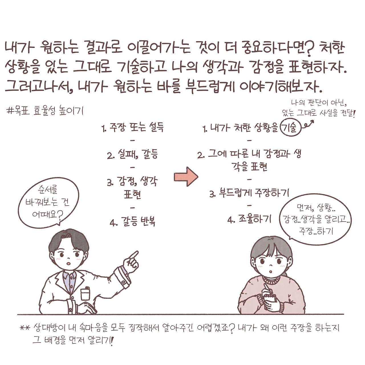 - 목표효율성을 높여야 할 때는 내가 처한 상황을 있는 그대로 기술하고, 그에 따른 내 감정과 생각을 표현, 그리고 내가 원하는 바를 부드럽게 주장하는 것이 중요하겠죠? 논점에서 벗어나지 않고 상대방과 의견을 조율할 수 있다는 태도를 가지면 더욱 좋고요. 말하지 않아도 알아주면 좋겠지만, 그렇지 않더라도 내가 왜 이런 주장을 하는지 그 배경을 먼저 설명해 보면 좋을 것 같아요.