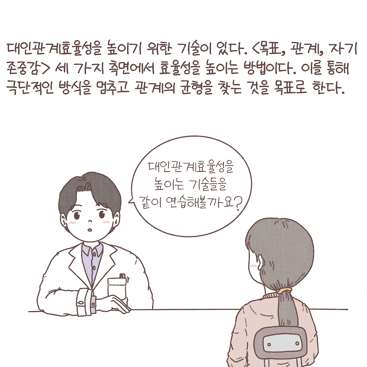 내가 원하는 걸 구체적으로 요구해야 할 때도, 엄마를 실망시켜서 사과하고 화해를 하고 싶을 때도, 나만 손해를 보고 있는 것 같은 상황에서 거절을 해야 할 때도.. 상황과 목적에 관계없이 항상 내게 익숙한 방식으로 관계를 풀어나가려 하다 보면, 처음에 내가 마음먹었던 방향과는 정반대로 걷고 있는 내 모습을 마주할지도 몰라요. 그런 사람들에게 알려주곤 했던 대인관계효율성을 높이는 기술에 대한 내용을 그림으로 담아봤답니다.