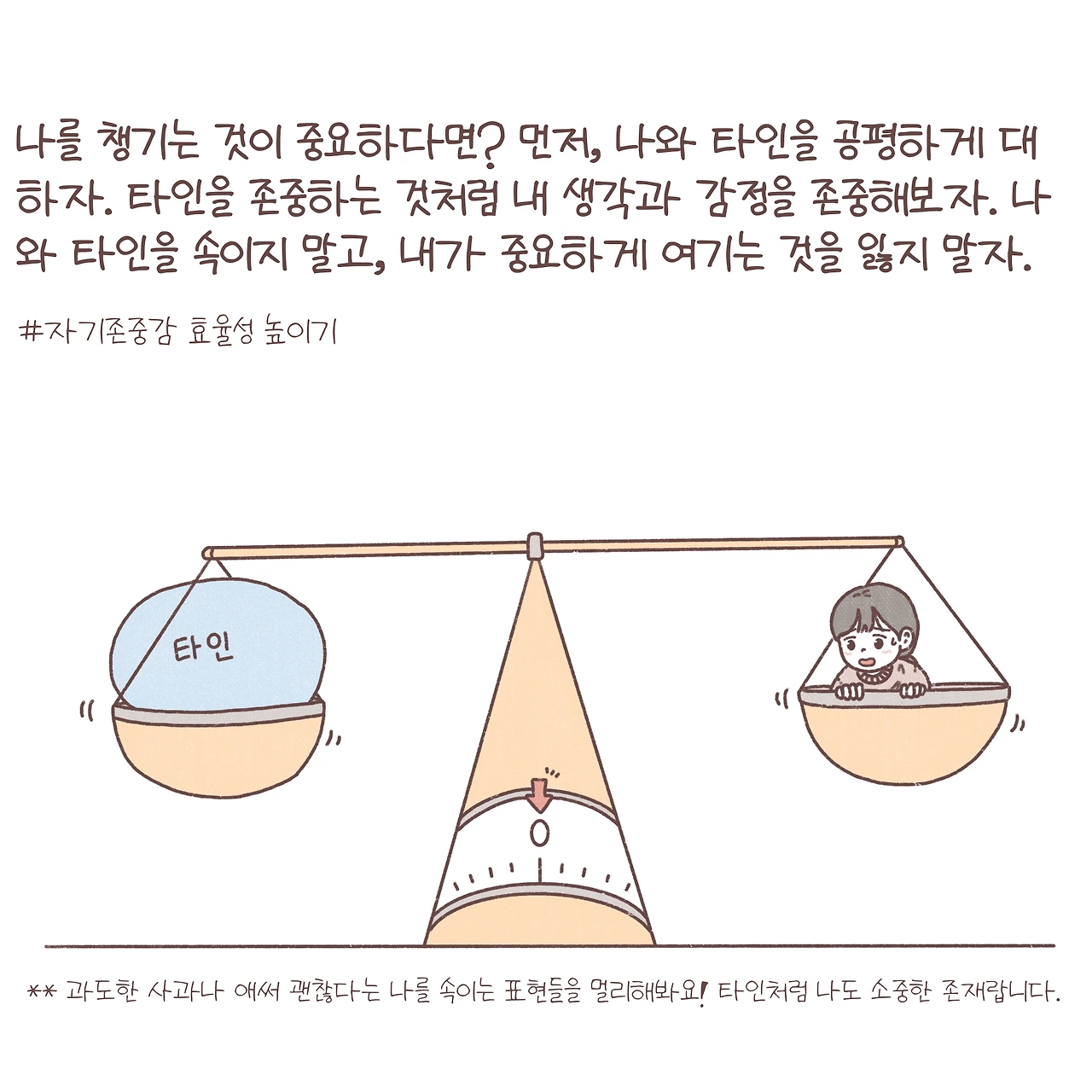 - 자기 존중감효율성을 높이기 위해선 우선, 나와 상대방을 공평하게 대하는 태도를 가져야 해요. 항상 배려하고, 내가 이해하고, 나는 괜찮다고 말해왔던 내 모습은 잠시 넣어두고, 상대방의 감정과 생각이 중요한 것처럼 나의 감정과 생각도 중요하다는 걸 떠올려봅시다. 나부터 나를 인정하고 배려하면서, 내가 중요하게 생각하는 가치와 태도를 잃지 않는 거예요. 굳이 애써 괜찮다며, 내가 잘못했다며 나와 상대를 속이지 않고 진솔한 태도를 가지면 더 좋을 것 같아요.