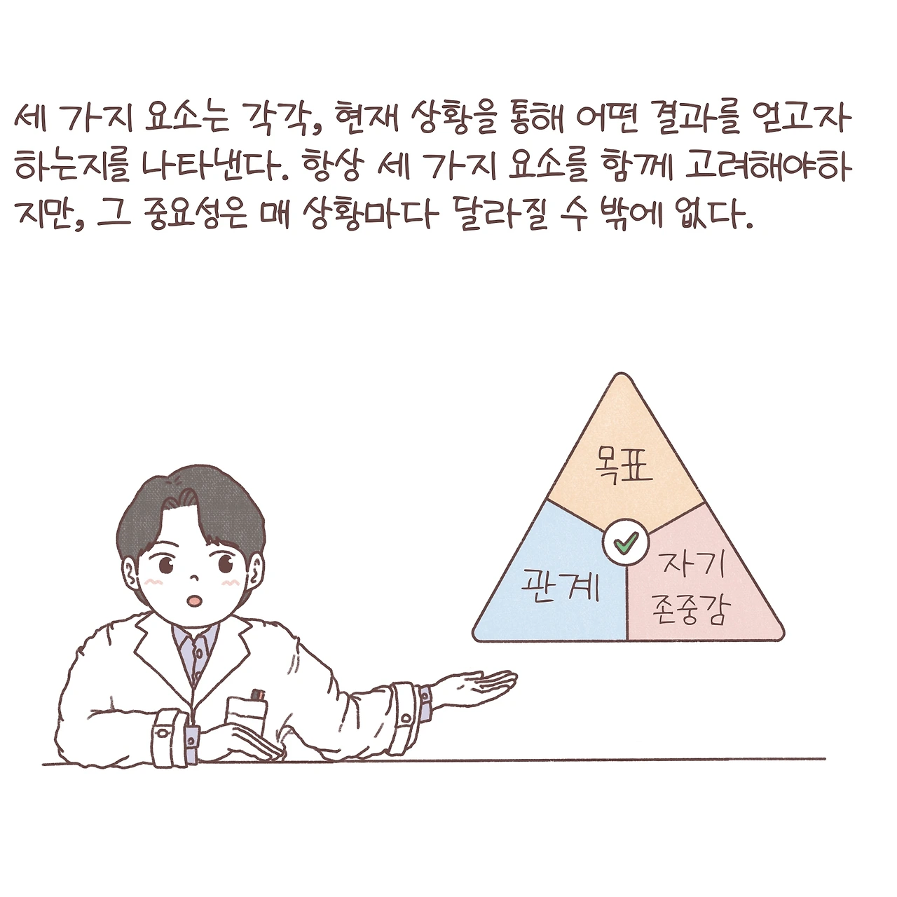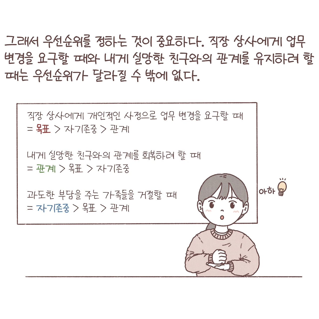 마샤 리네한이 개발한 변증법적 행동치료 중 대인관계에 대한 내용을 참고했는데, 분량이 방대해서 모든 내용을 담지는 못했다는 걸 먼저 말씀드리고 싶어요. 대인관계효율성을 높이는 기술은 먼저, 이 관계에서 내가 얻고자 하는 것을 세 가지 요소로 나누며 시작합니다. 목적, 관계, 자기 존중감. 이렇게 세 가지 요소가 존재하고 우리는 매 상황마다 내게 어떤 것이 중요한지 우선순위를 정해야 합니다.