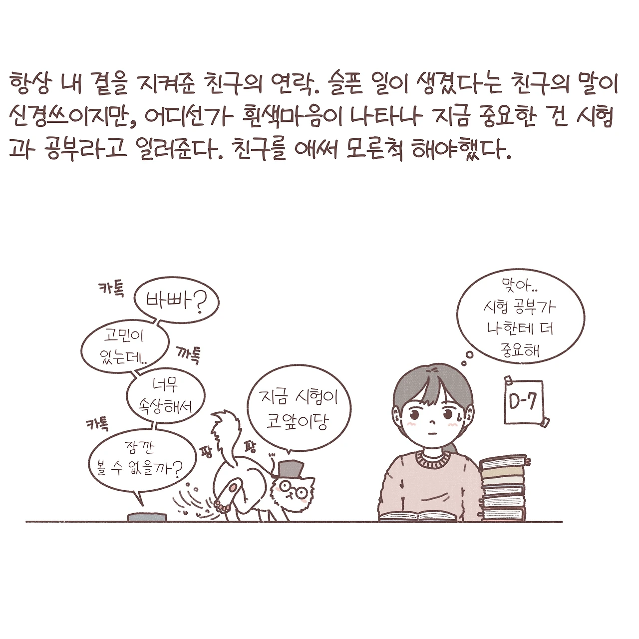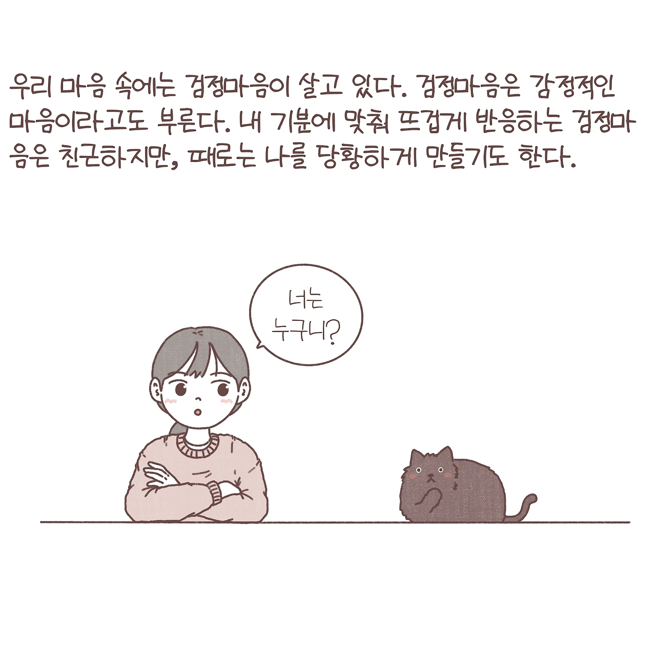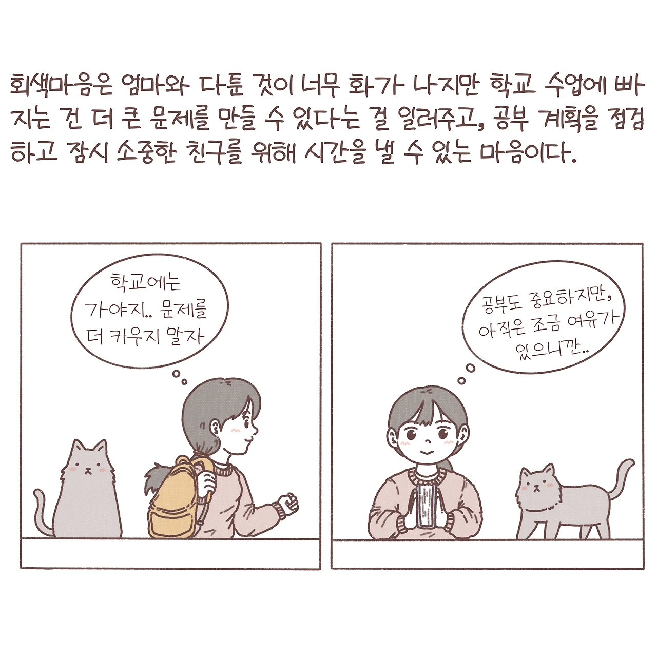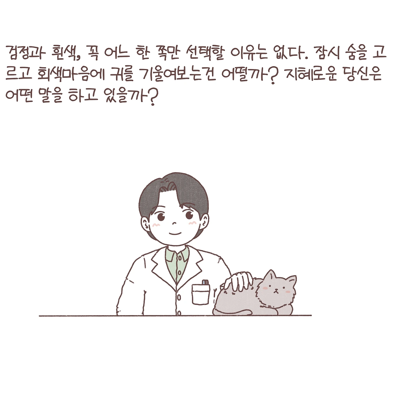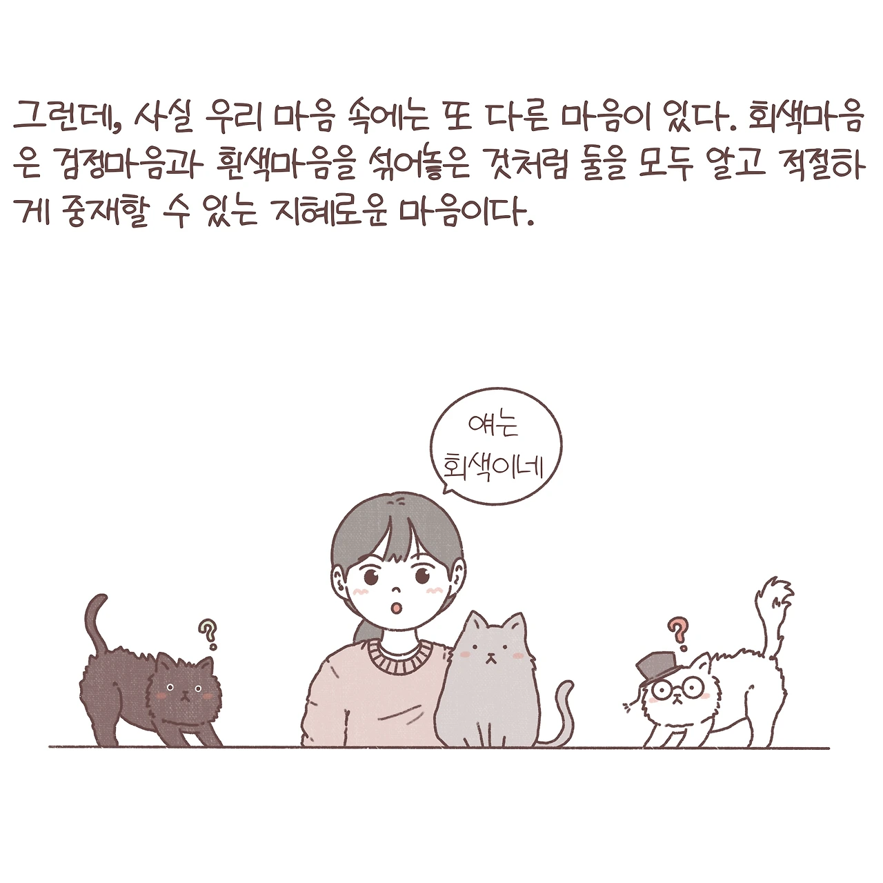 우리는 가끔 마치 감정적 마음과 합리적 마음, 검정과 흰색, 둘 중에 하나만을 골라야 할 것만 같은 착각에 빠지곤 합니다. 사실 둘 다 우리에게 정말 필요한 마음이지만, 상황에 따라 유리한 쪽을 선택해 한쪽만 크게 부풀어서 균형이 무너지곤 해요. 이런 우리에게 필요한 것이 바로 세 번째 마음인 회색마음이랍니다. 회색마음은 지혜로운 마음이라고도 불립니다. 지혜로운 마음은 감정적 마음과 합리적 마음이 이야기하는 것들을 모두 알고 있는 마음이에요. 검정과 흰색을 섞어놓은 것처럼 둘의 중요성을 알고, 적절하게 둘을 중재하며 좀 더 지혜로운 방향으로 우리를 이끄는 마음이라고 볼 수 있겠네요. 지혜로운 마음은 아무리 화가 나도 상황을 더 악화시키지 않기 위해 학교에 갈 수 있는 마음이고, 시험이 얼마 안 남았지만 계획을 점검하고 잠깐 틈을 내 친구의 감정을 돌봐줄 수 있는 마음이에요. 우리는 모두 지혜로운 마음을 가지고 있답니다. 감정과 이성, 한쪽에만 치우쳐 괴로운 어느 날에 지혜로운 마음에 귀를 기울여보는 건 어떨까요? 당신의 지혜로운 마음은 어떤 말을 해줄까요?