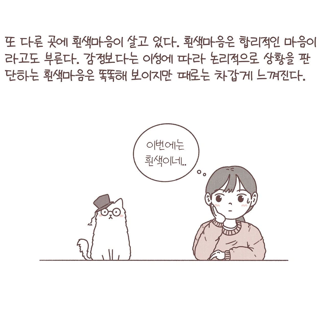 그리고 또 다른 곳에는 흰색마음이 있답니다. 흰색마음은 검정마음의 반대쪽에 있는 합리적인 마음을 뜻해요. 감정보다는 이성에 충실한 흰색마음은 둘도 없는 단짝 친구가 속상한 일로 연락을 하더라도, 당장 내게 더 중요한 급한 일이 있다면 이성적으로 판단하도록 중심을 잡는 마음이에요. 논리적이고 이성적인 흰색마음이 하는 소리는 대부분 맞는 것처럼 들리지만, 때로는 차가 워보일지도 모르겠어요. 이성에만 집중하다 보면 정작 인생에 중요한 많은 것들을 놓치며 살아갈 수도 있을 것 같고요.