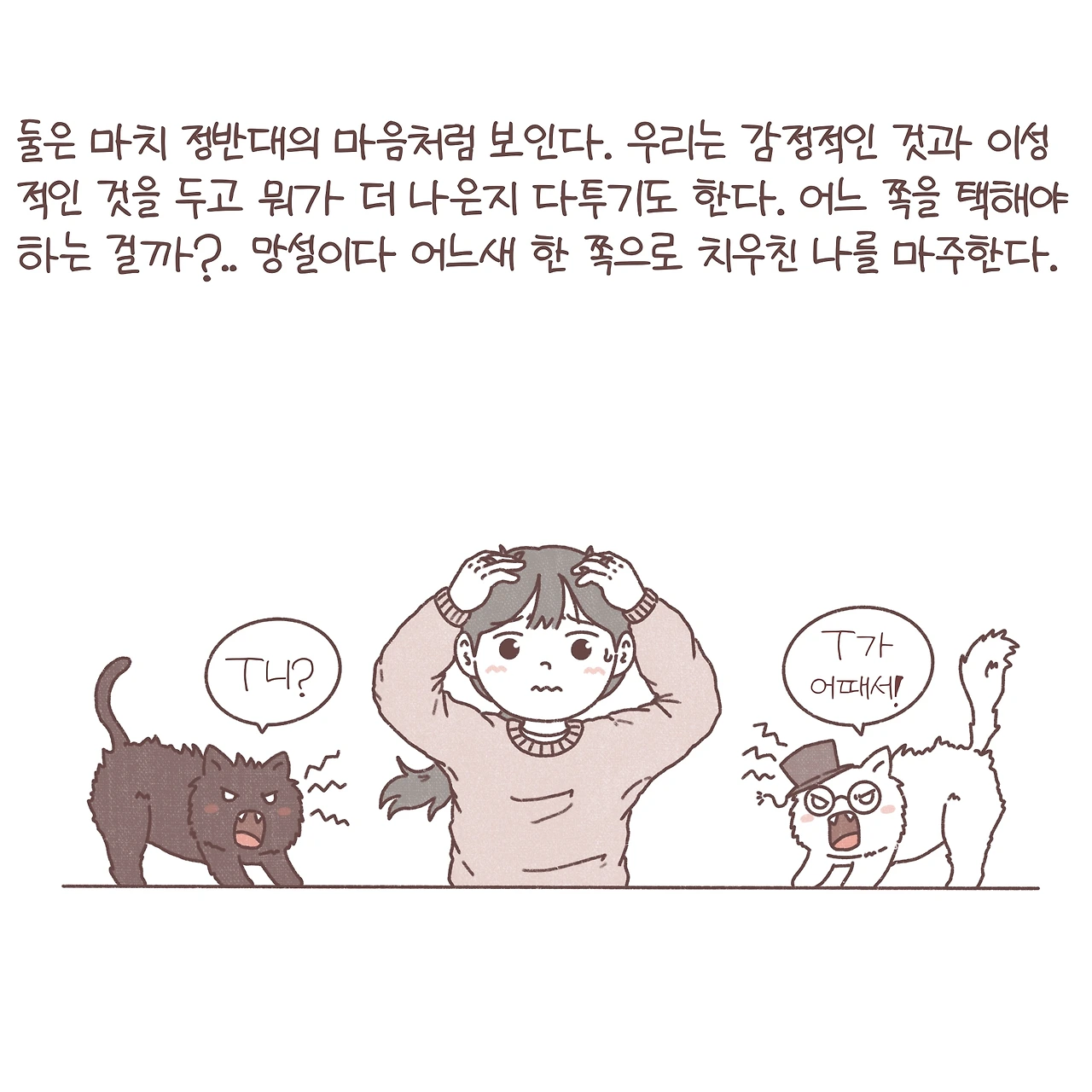 요즘은 T와 F로 성향을 파악하는 것이 유행인 것 같더군요. 저는 정신과의사지만, 한없이 T 같은 성격이라 공감능력이 부족해서 고생할 때가 종종 있습니다. 이성과 감정, 여러분은 둘 중에 어떤 것을 더 중요하게 생각하나요? 오늘은 우리 마음속에 있는 세 가지 마음에 대해 이야기해보려 합니다.