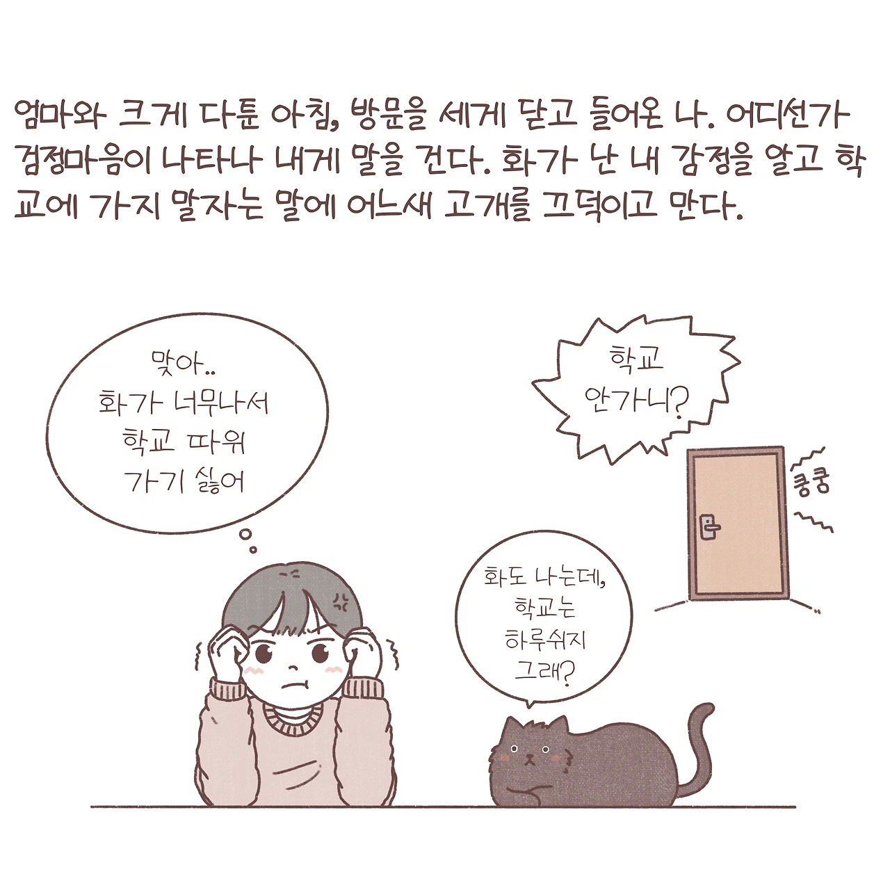 먼저, 검정마음은 흔히 우리가 F라고 알고 있는 감정을 중시하는 감정적인 마음입니다. 내 감정 상태에 맞추어 발 빠르게 움직이면서 감정에 따른 행동을 하도록 부추기죠. 엄마와 크게 다퉈서 분노로 가득한 날에는 학교도 학원도 모두 가기 싫어지는 그런 마음일지도 모르겠네요. 감정에 충실한 마음은 따뜻한 느낌을 주기도 하지만, 너무 오로지 감정에만 집중하다 보면 때로는 당혹스러운 실수를 하기도 하죠.