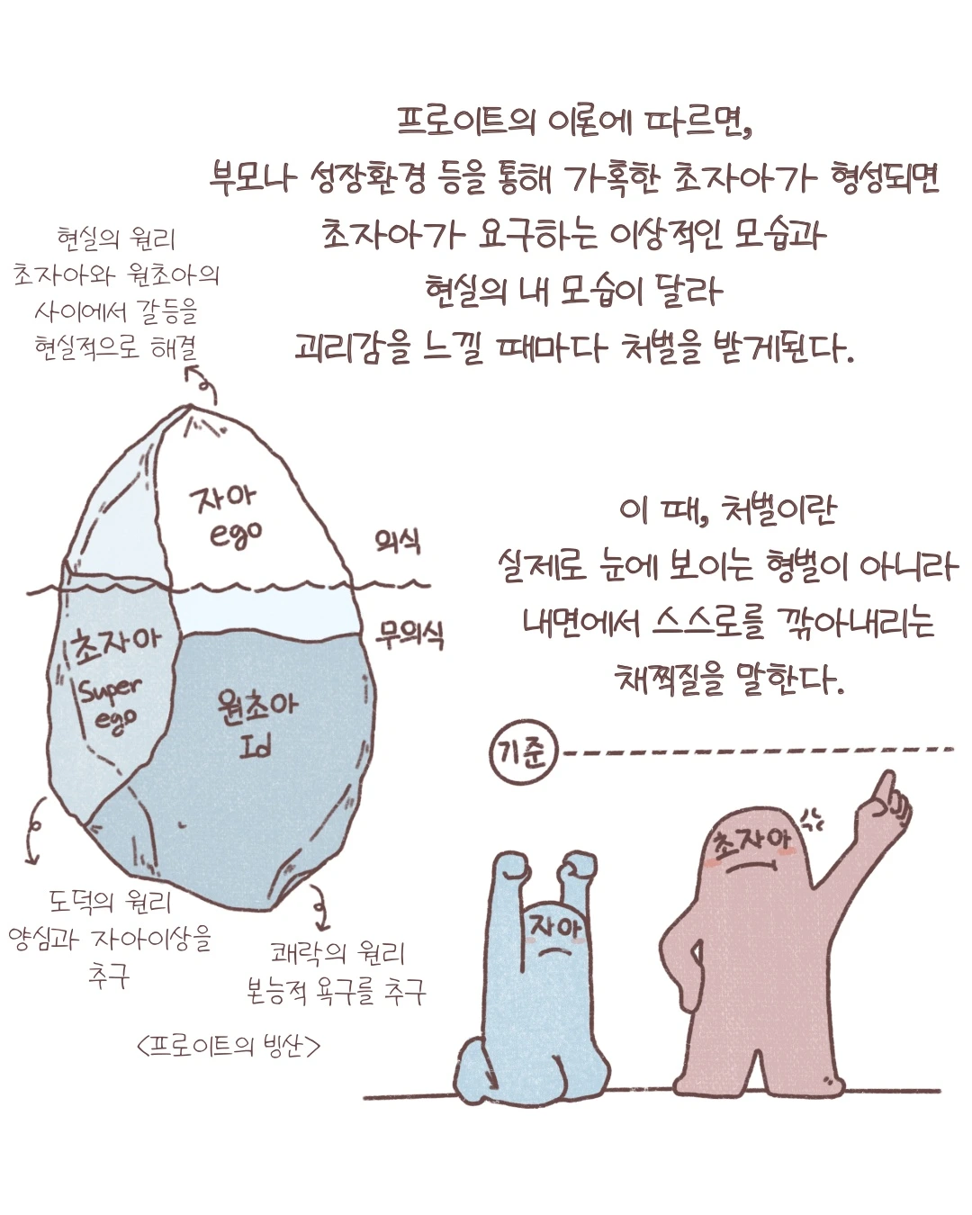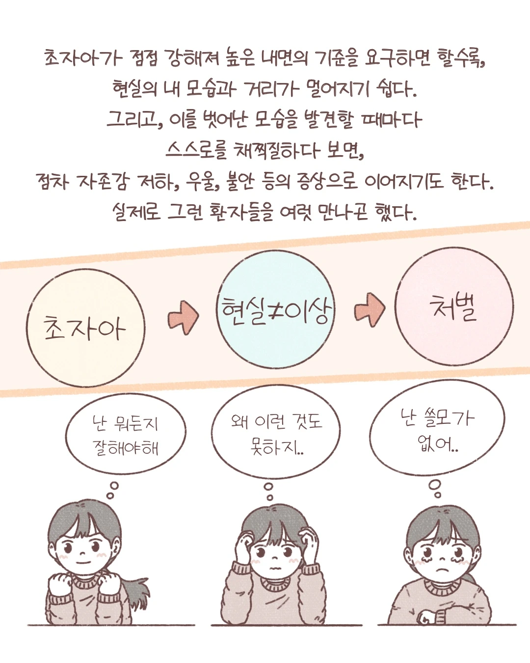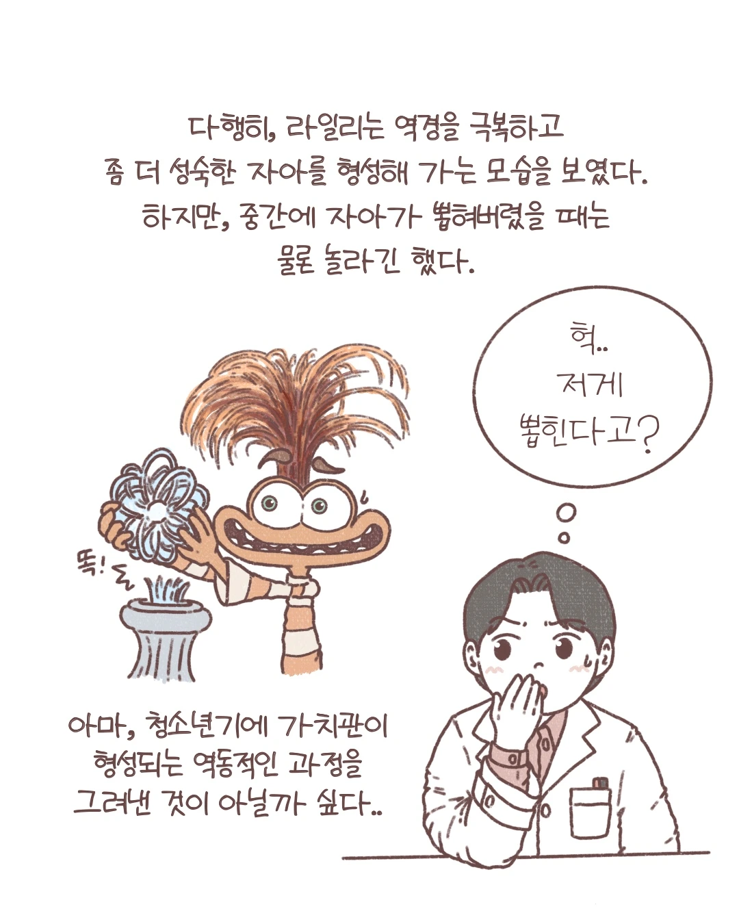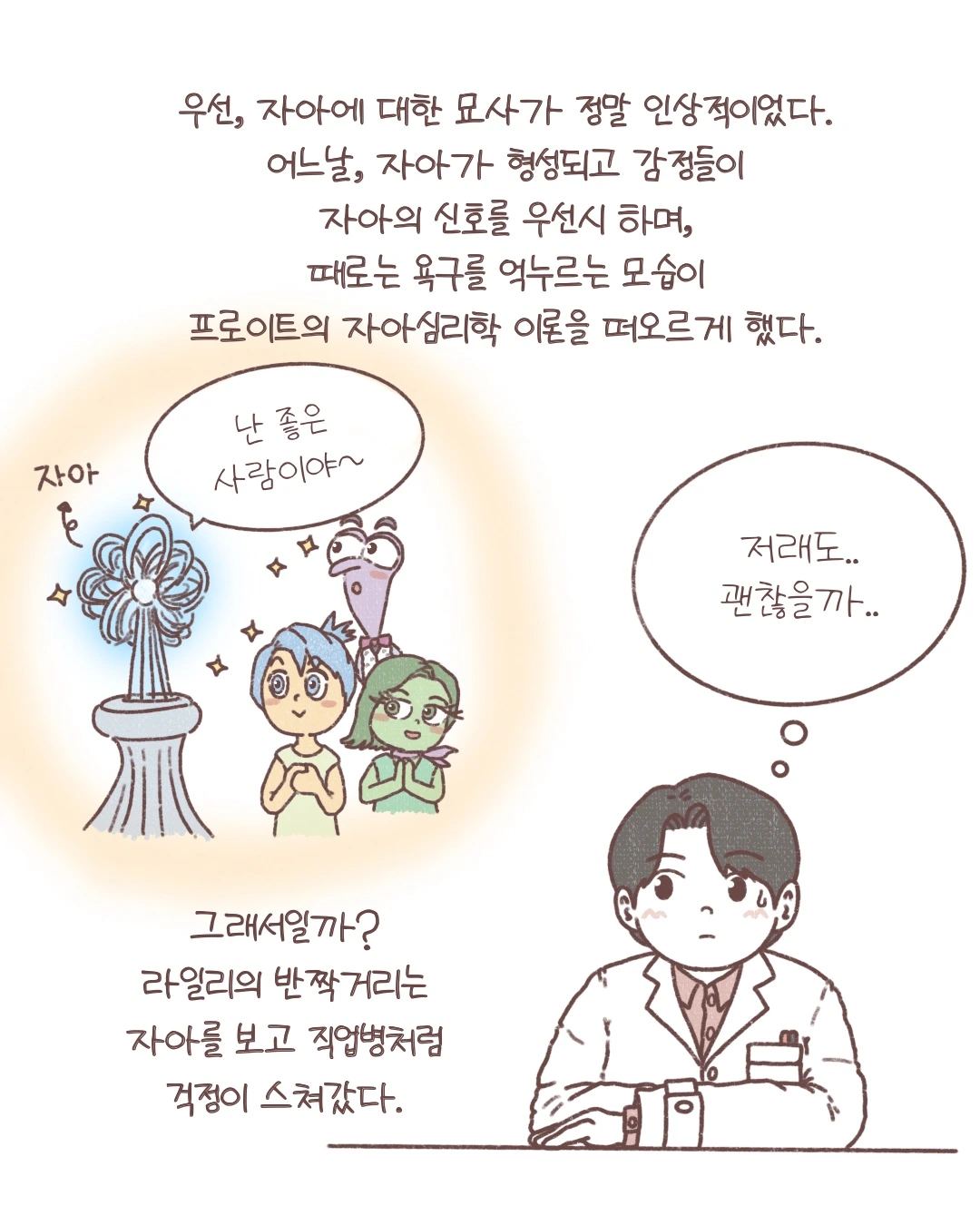 전작에는 등장하지 않았던 자아라는 개념의 등장도 인상적이었어요. 라일리가 청소년이 되어가며 형성된 자아는 도덕적 신념이나 가치관을 품고 반짝거리는 조형물처럼 표현됩니다. 이 자아가 때로는 감정들의 욕구나 성급한 결정들을 자제시켜 주는 역할을 하는 걸 보면서, 이전에 배웠던 프로이트의 자아심리학 이론이 떠오르기도 했어요. 이론에 따르면 의식에서 실제 판단하고 행동하는 자아보다는 무의식과 전의식에 걸쳐 도덕적 신념과 양심, 가치관 같은 것들을 자아에게 요구하는 초자아가 좀 더 영화 속 반짝거리는 자아와 닮아있다는 생각을 하기도 했습니다.(물론, 개인적인 의견입니다ㅎㅎ) 초반부에 영화를 보며 조이가 나쁜 기억들을 모두 던져버리고 좋은 기억만을 토대로 “난 좋은 사람이야”라는 어찌 보면 너무 높은 기준을 요구할 것만 같은 자아를 고집하는 것이 걱정되기도 했어요. 성장과정에서 부모나 환경 등 여러 요인을 통해 가혹한 초자아가 형성되면, 자신이 내면에 정해놓은 높은 기준을 현실의 내가 충족시키지 못할 때마다 처벌을 받게 됩니다. 이런 과정이 반복되다 보면 우울이나 불안 등의 증상으로 이어지기도 하죠. 실제로 내면에 너무 높은 기준을 두고 현실과 이상의 괴리감을 느끼며 자신을 끊임없이 깎아내리는 환자들을 종종 만나곤 합니다. 영화는 언뜻 좋게만 보이는 “나는 좋은 사람이야”라는 자아가 때로는 라일리에게 너무 가혹한 기준을 요구하며, 모든 걸 잘 해내야 하고 때로는 거절하지 못하는 모습을 반복하다 좌절을 경험하는 이야기로, 점차 역경을 딛고 성숙한 자아를 통합해 가는 과정을 그려가며 우리에게 깊은 울림을 주는 것 같습니다.