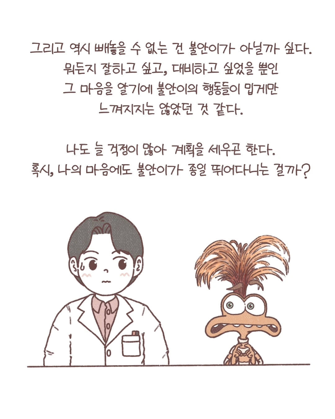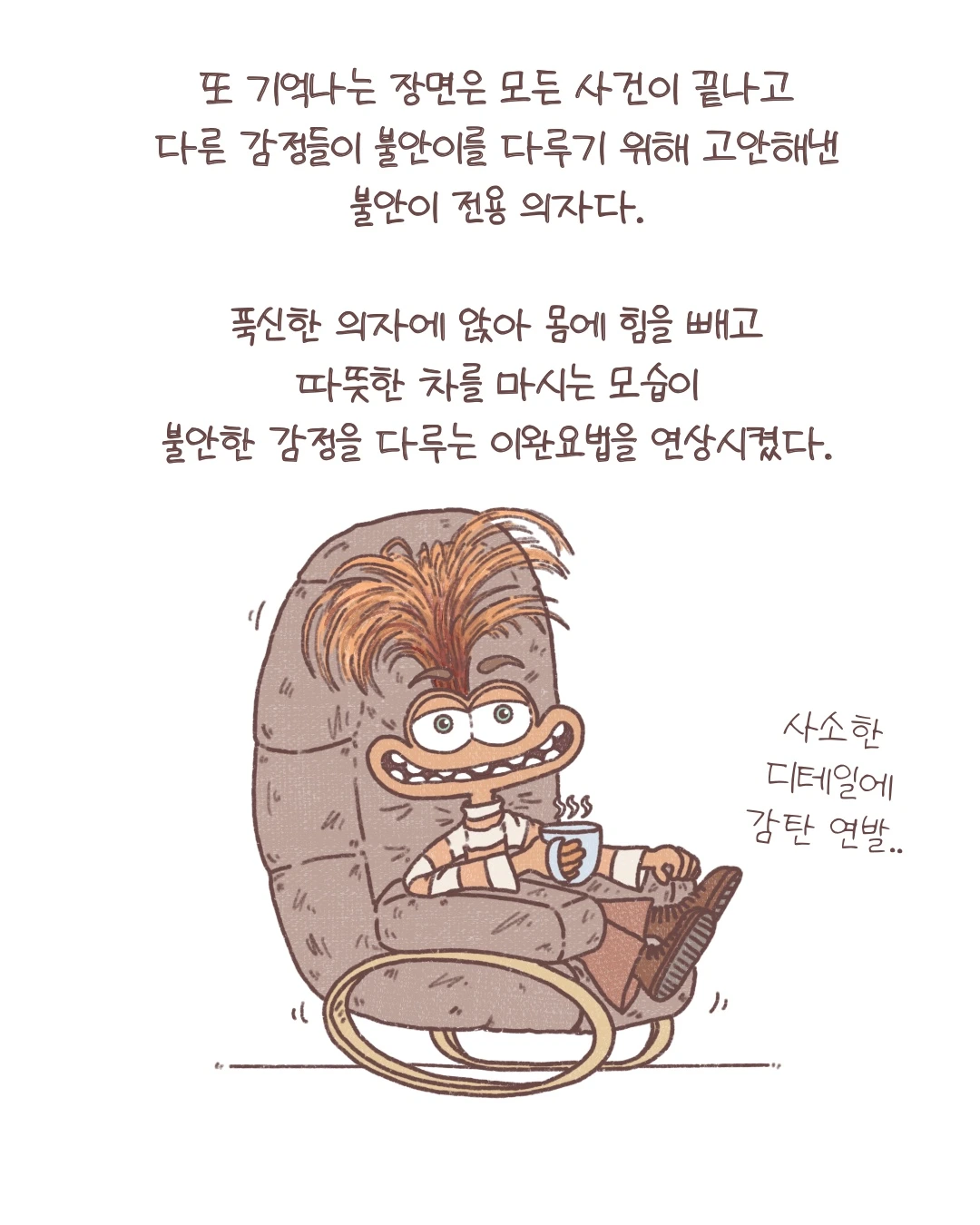 감정들은 그런 불안이를 다루는 방법을 영화 마지막에 찾아냅니다. 푹신해 보이는 큼지막한 소파에서 온몸에 힘을 풀고 따뜻한 차를 한 잔 마시는 불안이의 모습을 보고 환자들에게 종종 알려주고 했던 복식호흡이나 이완요법 같은 기술들이 떠올랐어요. 감정에서 벗어나 현실로 돌아오는 방법 중에 온몸의 근육을 이완시키고 차분하게 좋아하는 음악을 듣는 등의 방법을 표현한 것 같아 속으로 디테일에 여러 번 감탄했답니다.