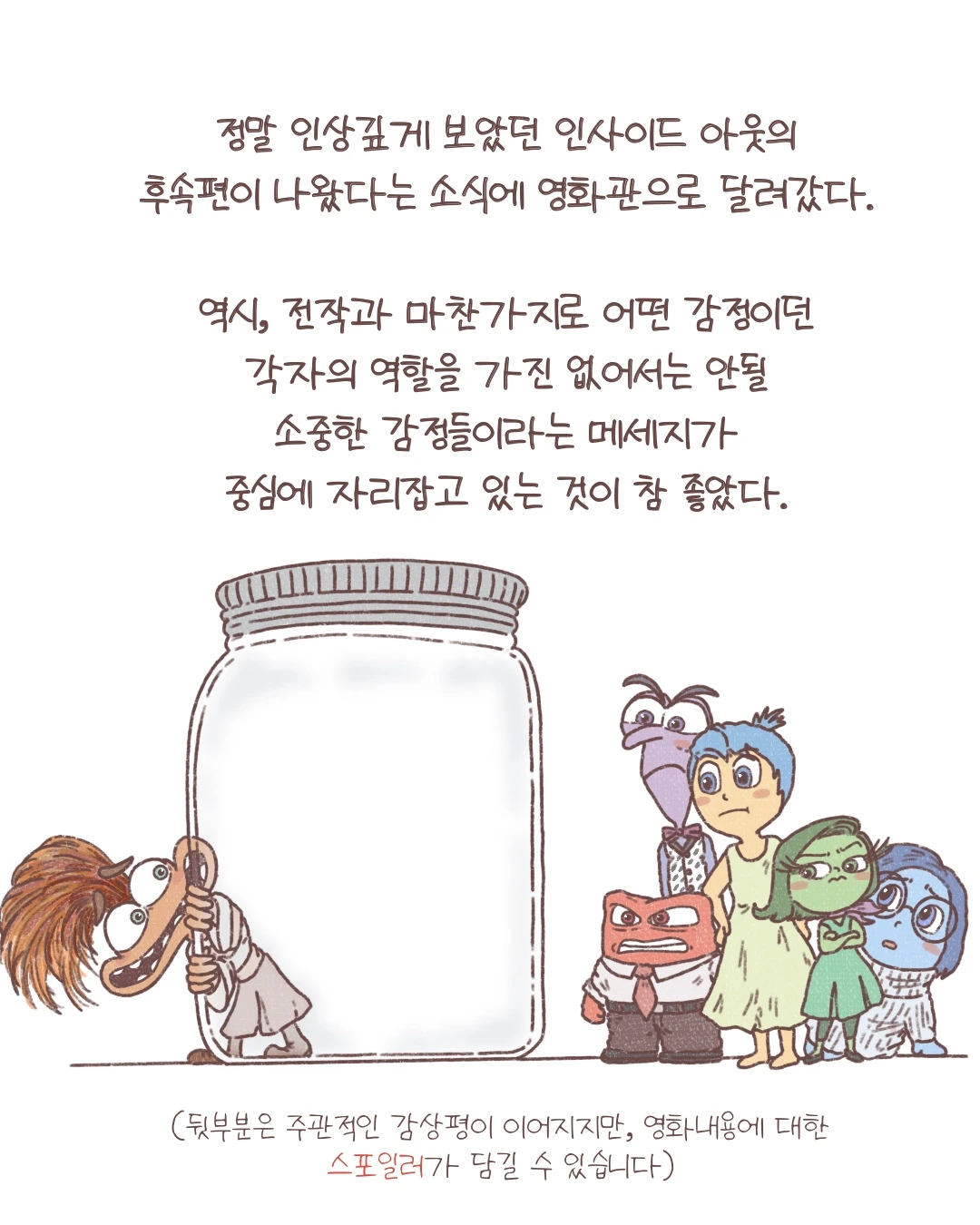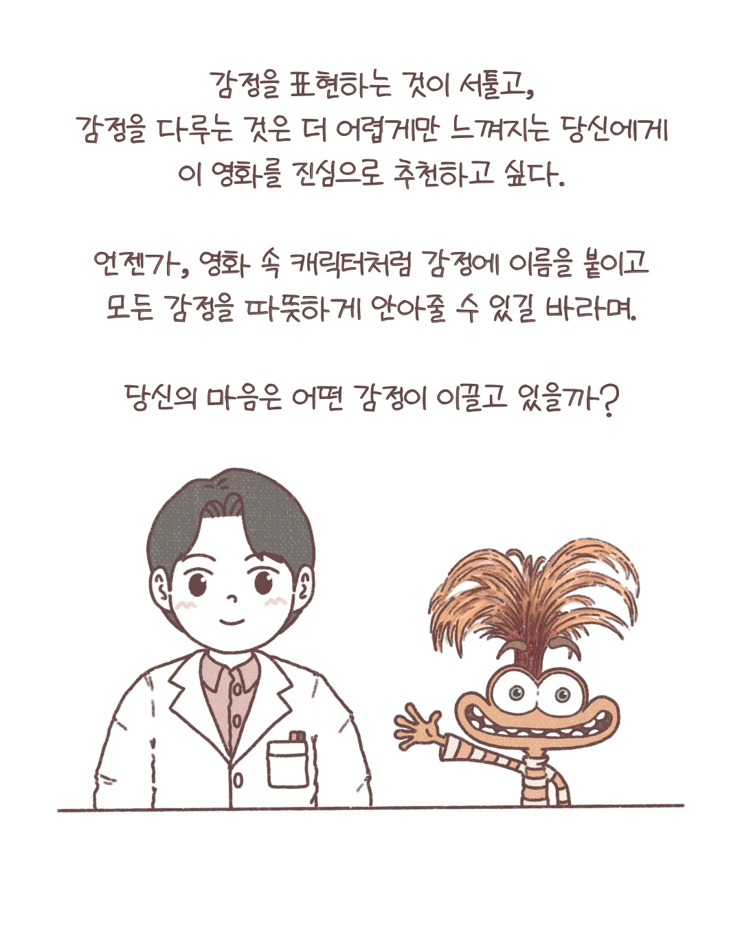 우리는 감정이 중요한 걸 안다고 말하면서도, 막상 내 감정에 이름을 붙이고 자세히 들여다보는 것과 그 감정을 다루는 것은 여전히 어렵게 느껴지기만 하죠. 그런 당신에게 꼭 추천드리고 싶은 영화 <인사이드아웃2> 후기였습니다. 언젠가 영화 속 캐릭터처럼 이름을 붙인 감정들을 마주하고 능숙하게 다뤄갈 수 있는 날이 오길 바라며. 당신의 마음속은 어떤 감정이 이끌고 있나요?