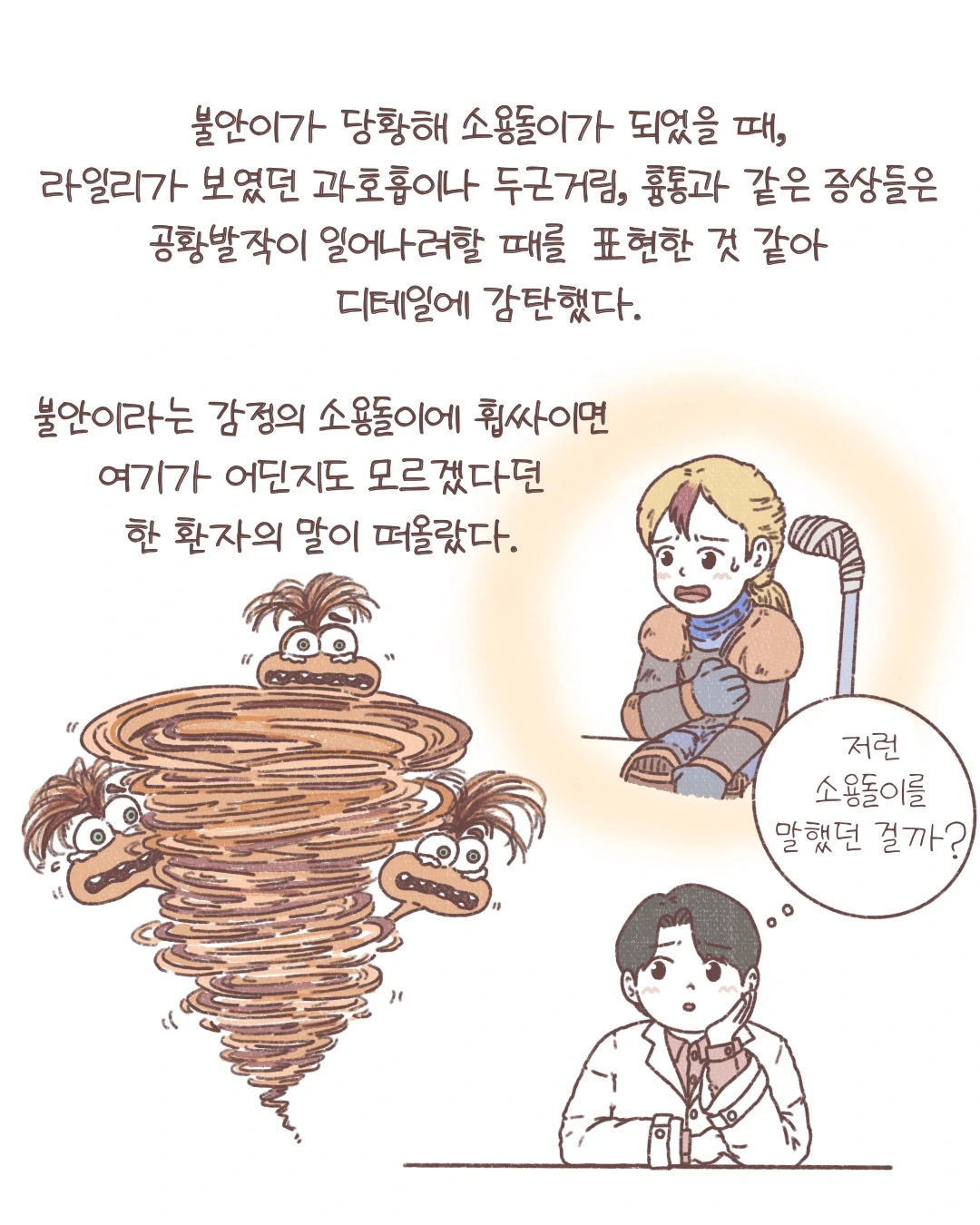 불안이가 당황해 소용돌이치며 계기판을 잠식했을 때는 라일리가 가슴을 부여잡고 숨을 몰아쉬는 모습을 보입니다. 이는 아마, 불안이라는 감정과 연관 지어 떠올려 볼 수 있는 공황발작을 표현한 것이 아닐까 싶었어요. 공황발작 정도의 심한 상태는 아니더라도 누구나 감정이 극에 달해 자율신경계가 항진되며 심박수가 오르고 숨이 가빠지는 그런 경험을 할 수 있습니다. 감정이 실제로 신체적 증상을 야기할 수 있다는 점을 표현해서 그런지 인상 깊게 다가왔어요.