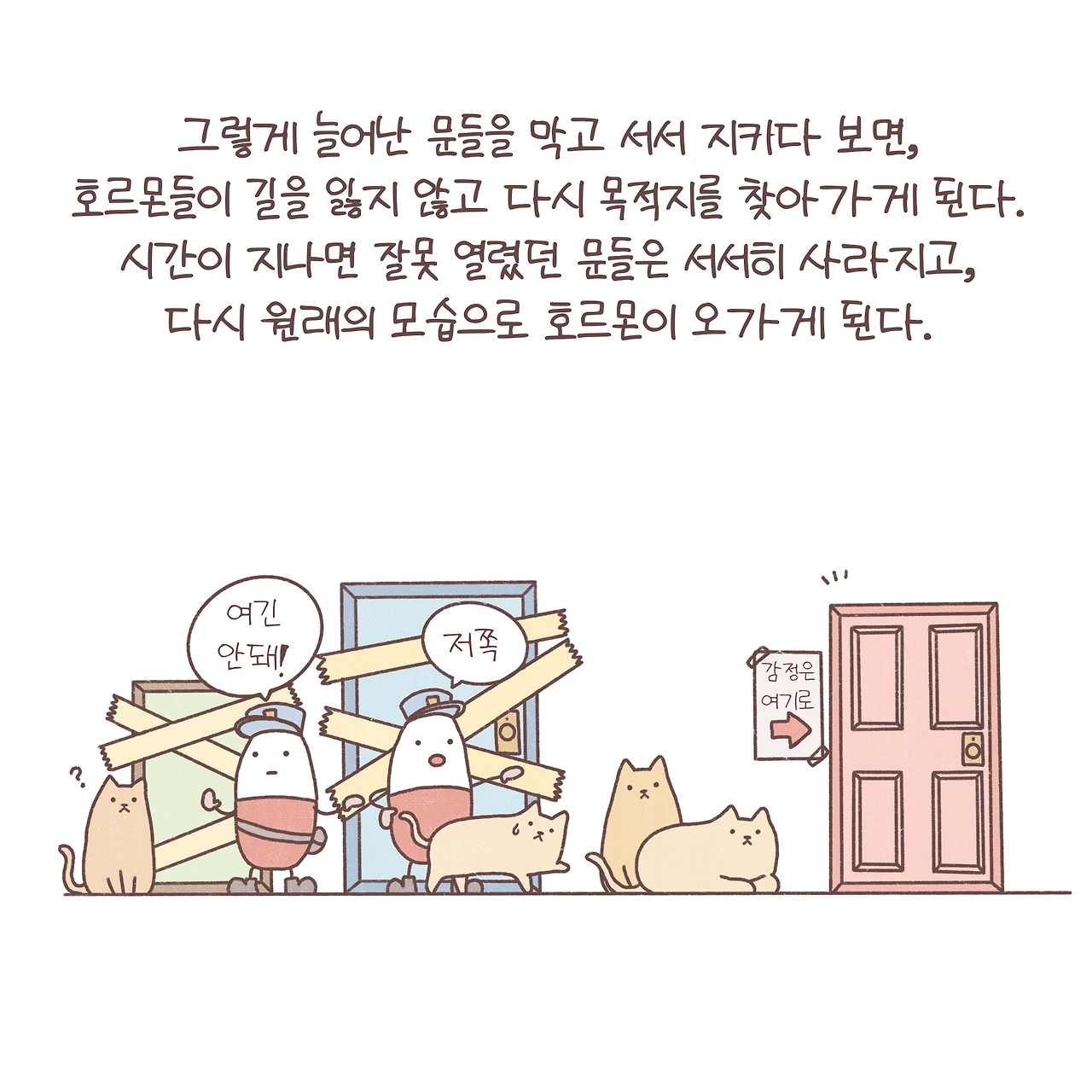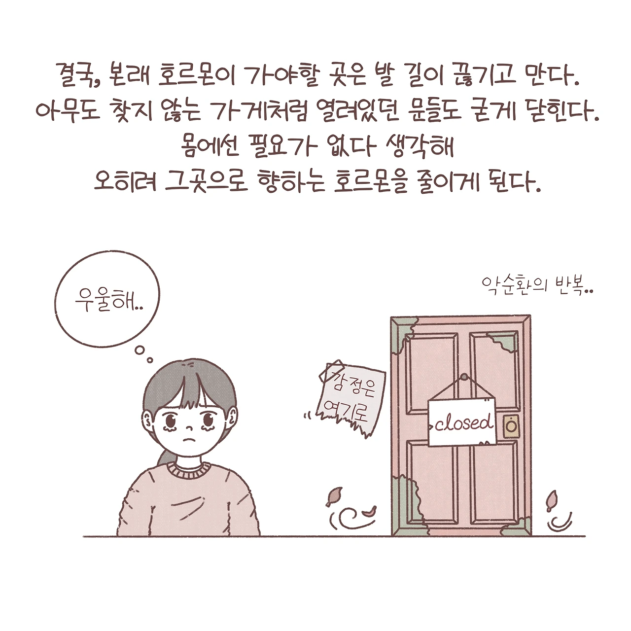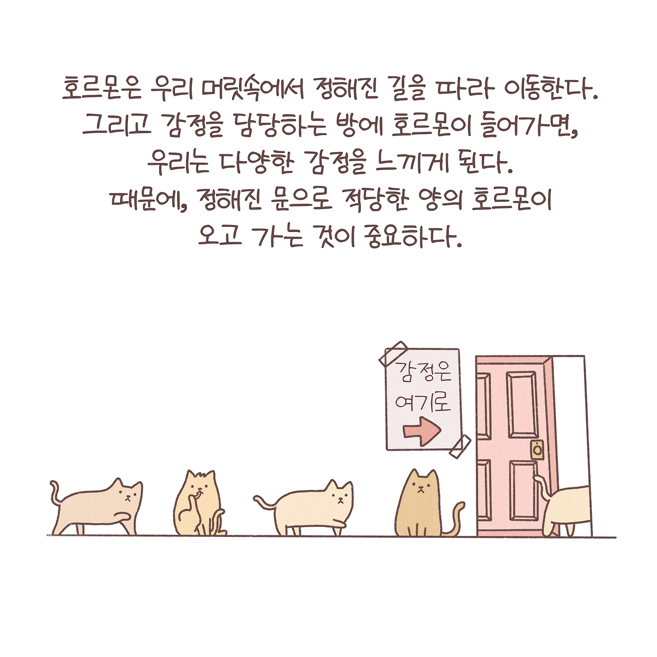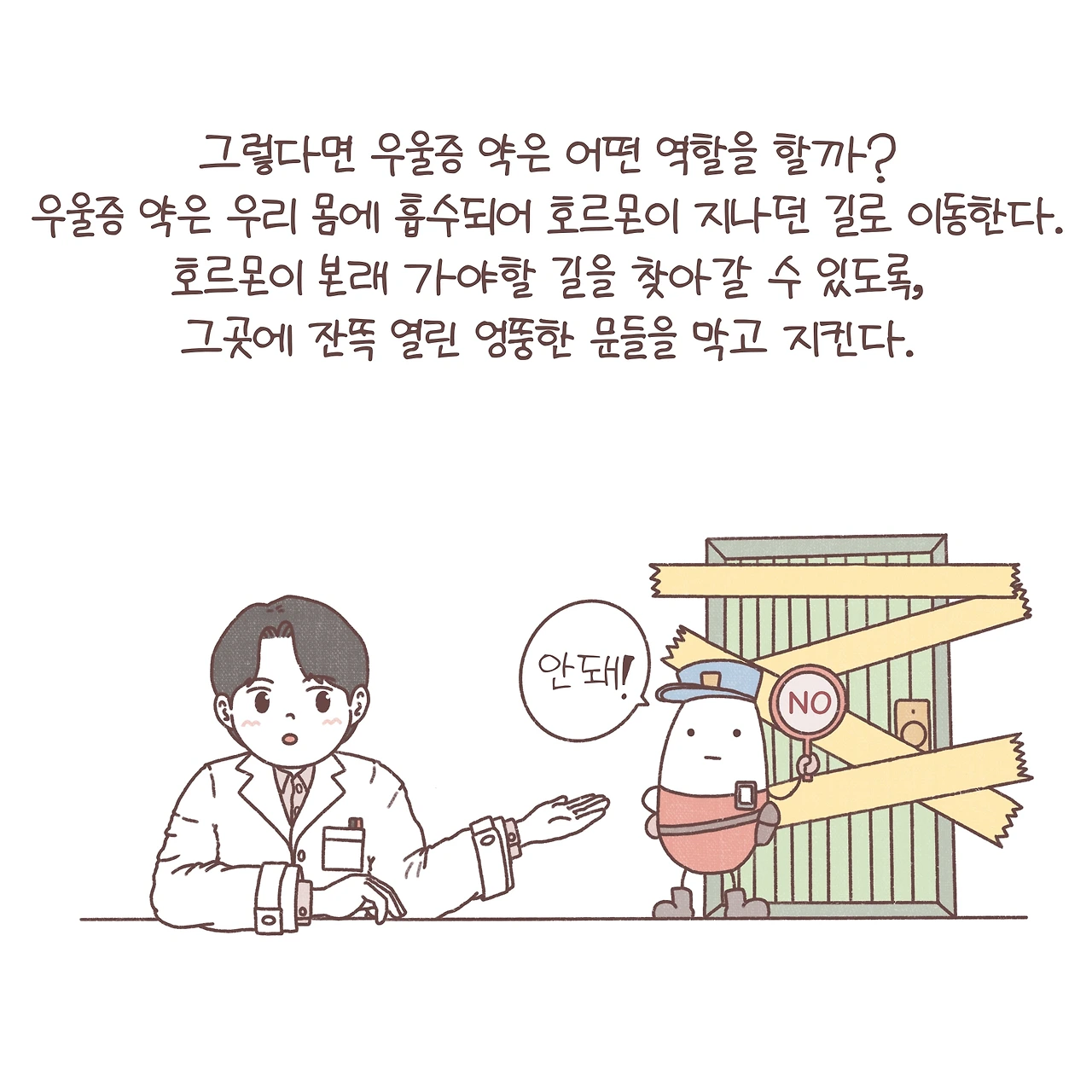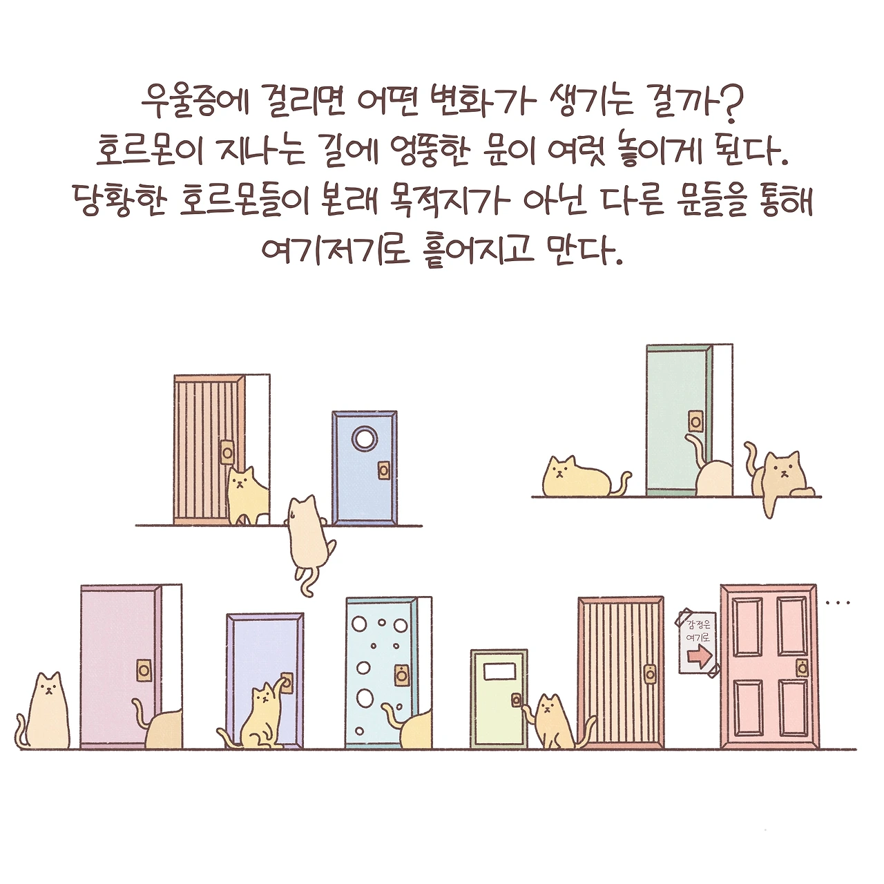 진료실에서 환자들에게 가장 자주 듣는 말을 떠올려보면, 약을 먹는다고 진짜 이게 나아질까요? 어떻게 약으로 기분이 좋아지나요? 같은 약에 대한 궁금증이었던 것 같습니다. 눈에 보이는 상처나 염증, 골절이 생긴 게 아닌 터라, 약을 먹고 치료를 해서 기분이 나아진다는 것이 쉽게 이해되지 않을 것 같아요. 그런 환자들에게 약에 대한 이해를 돕기 위해 ‘호르몬과 문 이야기’를 들려주곤 합니다.
