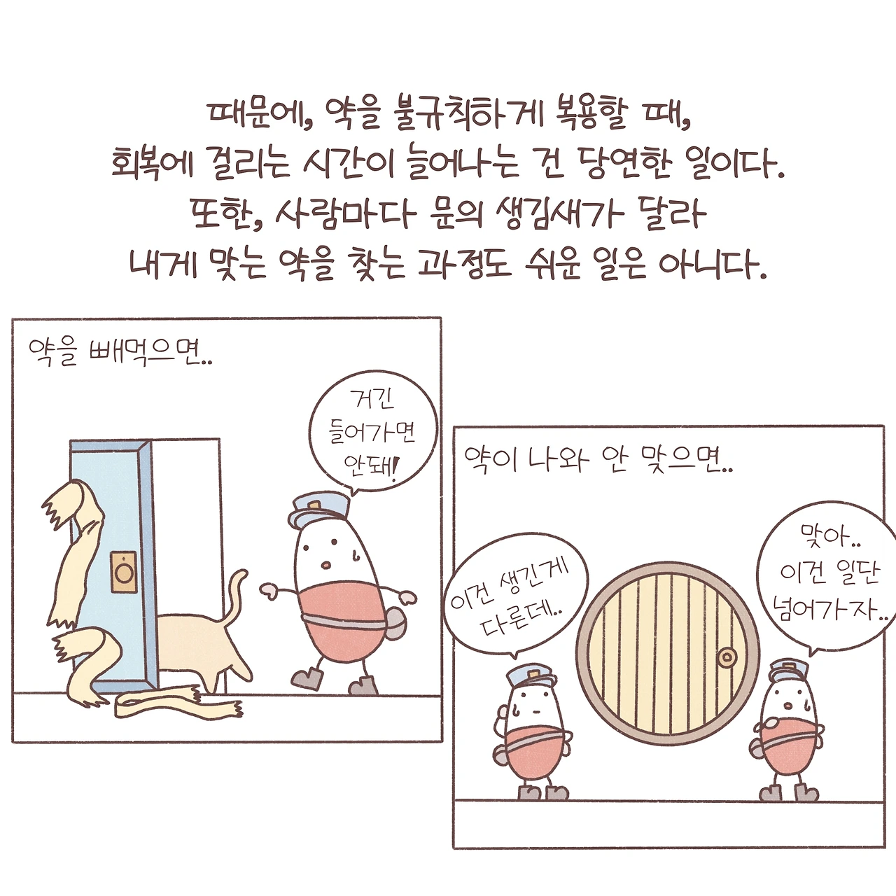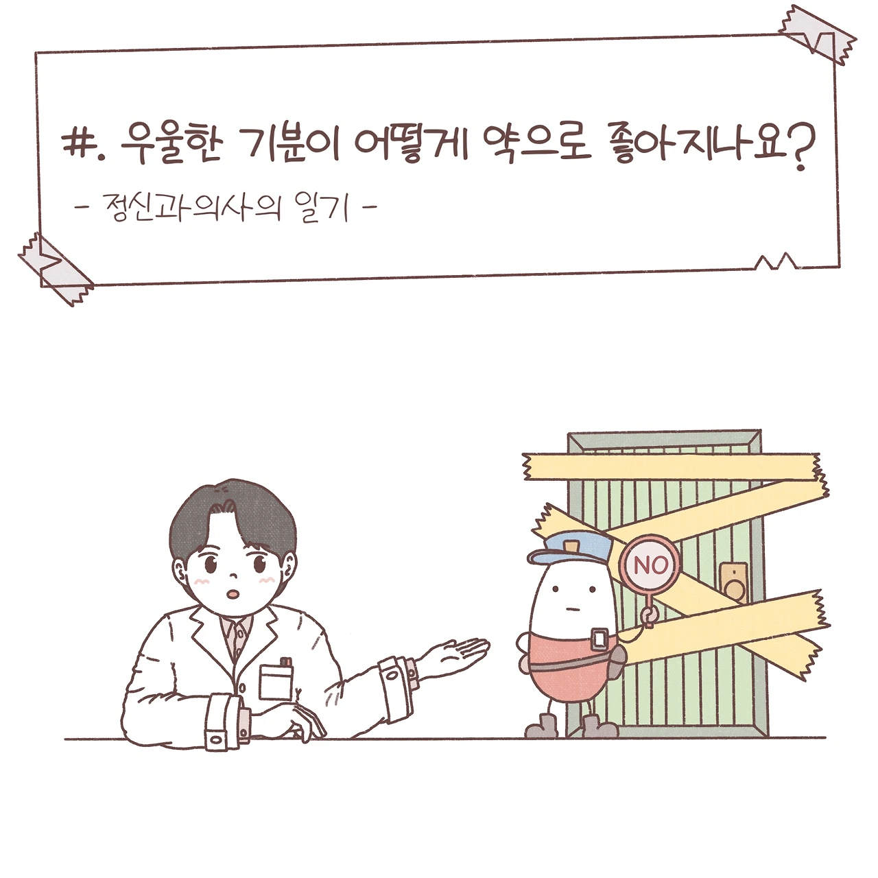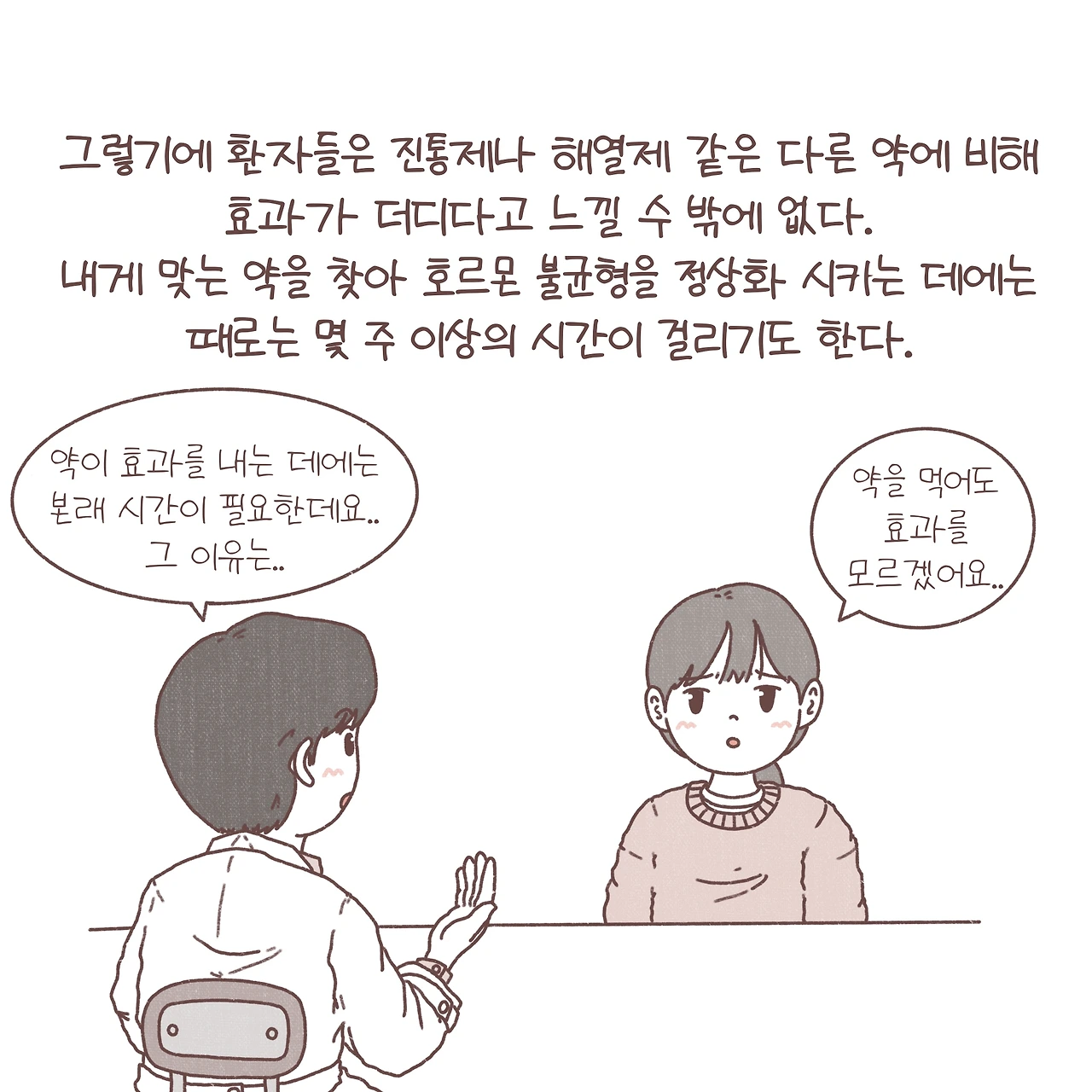 우울증 약을 복용하면, 호르몬이 지나는 신경회로에 놓인 엉뚱한 문들을 바로잡기 시작합니다. 문 앞에 지키고 서서 호르몬이 제 길을 갈 수 있도록 안내하죠. 하지만, 곧바로 문을 없애지는 못하기에 약을 불규칙하게 복용한다면, 호르몬이 다시 엉뚱한 곳으로 새 버리고 말겠죠? 꾸준한 약물 복용이 중요한 이유입니다. 또한, 사람마다 문의 생김새가 달라 필요한 약이 다를 때가 많아요. 세로토닌뿐만 아니라 도파민, 노르에피네프린과 같은 다양한 호르몬이 우울증과 연관되어 있기 때문입니다. 이러한 복잡성 탓에 내게 맞는 약을 찾는 데 시간이 걸리는 것이죠. 호르몬 불균형을 바로 잡고 서서히 예전처럼 균형을 맞추는 것을 목표로 하기에 효과가 더디고 오래 걸리는 것처럼 느껴지는 경우가 많습니다. 그래도 약이 필요한 경우에는 꼭 약물치료를 권하는 편이에요.