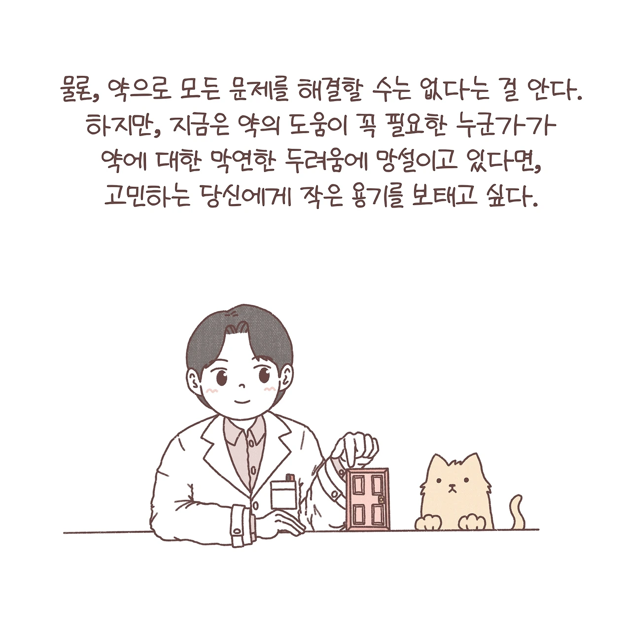약으로 모든 문제가 해결되지는 않습니다. 당장 내게 닥친 환경이나 경제적 어려움, 틀어진 관계 등을 약이 회복시켜주지는 못하죠. 하지만, 누군가에게는 약이 분명 꼭 필요합니다. 다리에 골절이 생겼는데, 전혀 치료를 받지 않은 채로 급한 일을 해결하려 노력한다고 상상해 보세요. 노력하는 마음을 모르는 건 아니지만, 노력하는 만큼 좋은 결과를 기대하기 힘들지도 모릅니다. 마음의 골절을 입은 당신이 약에 대한 막연한 두려움에 치료를 망설이고 있다면, 작은 용기를 전해봅니다.