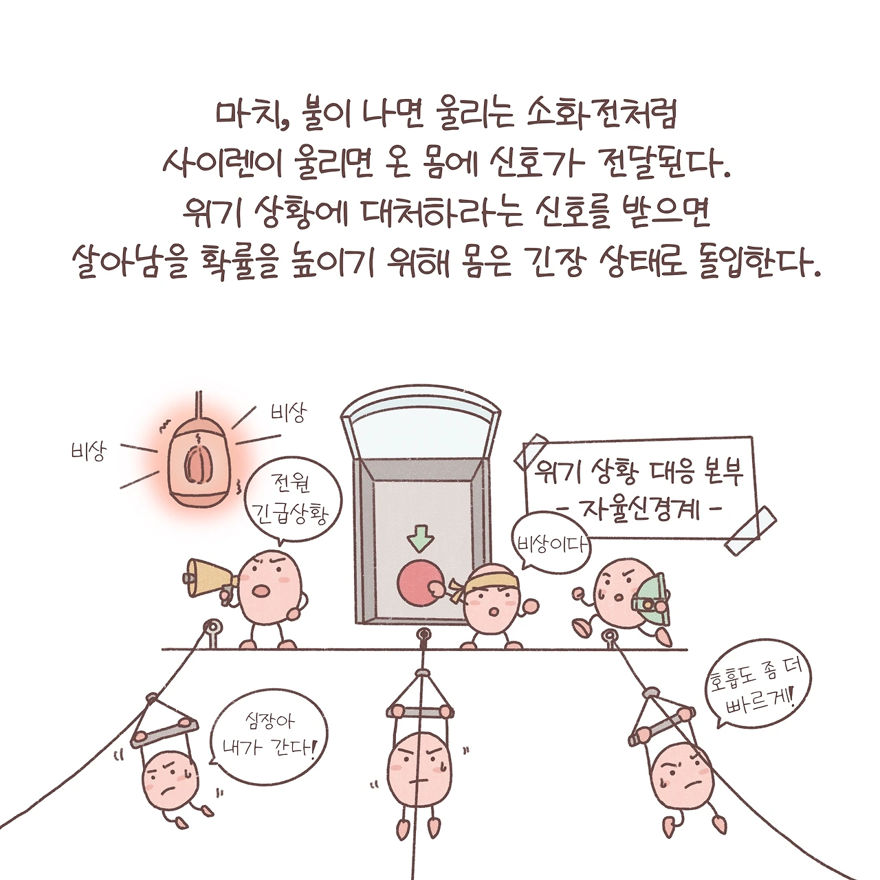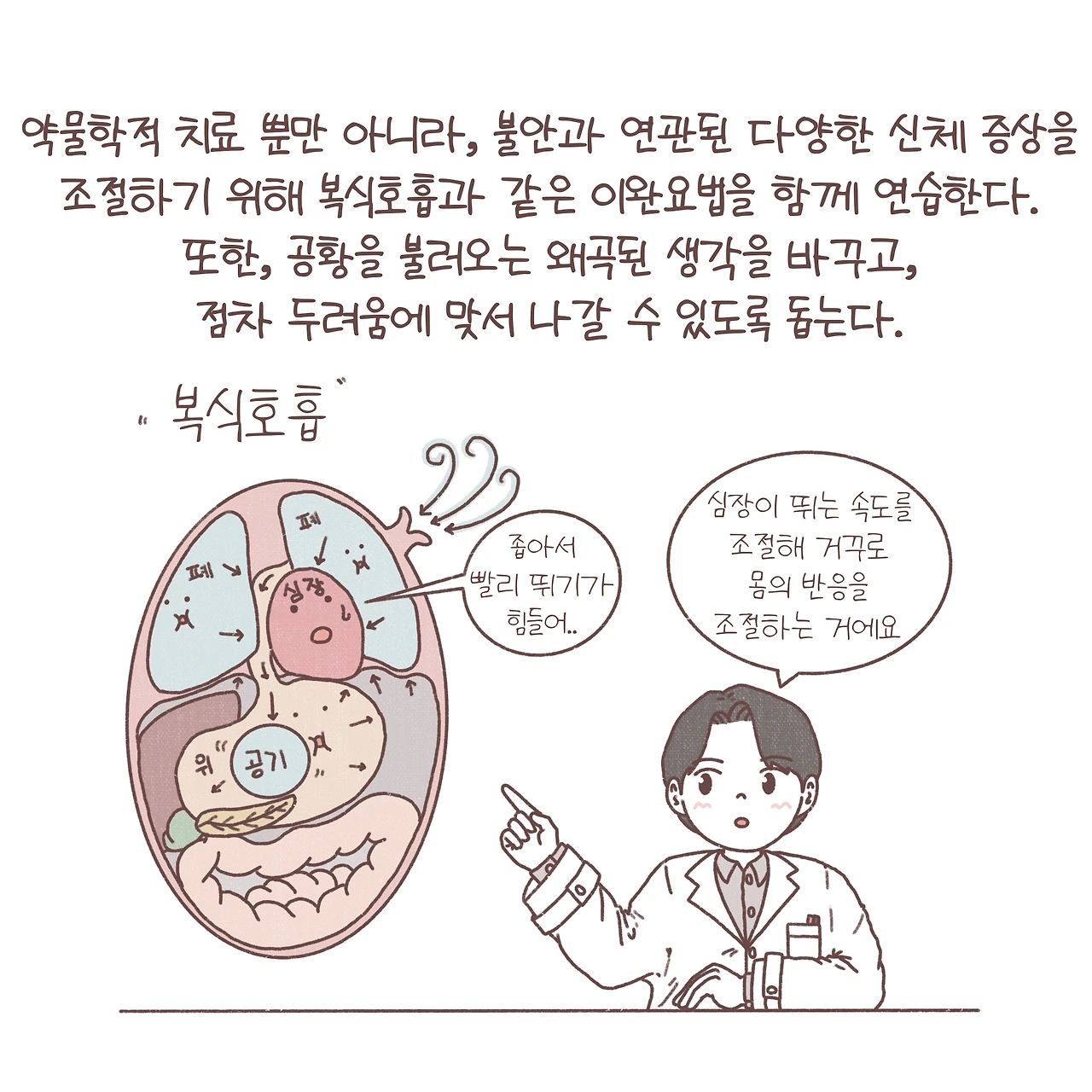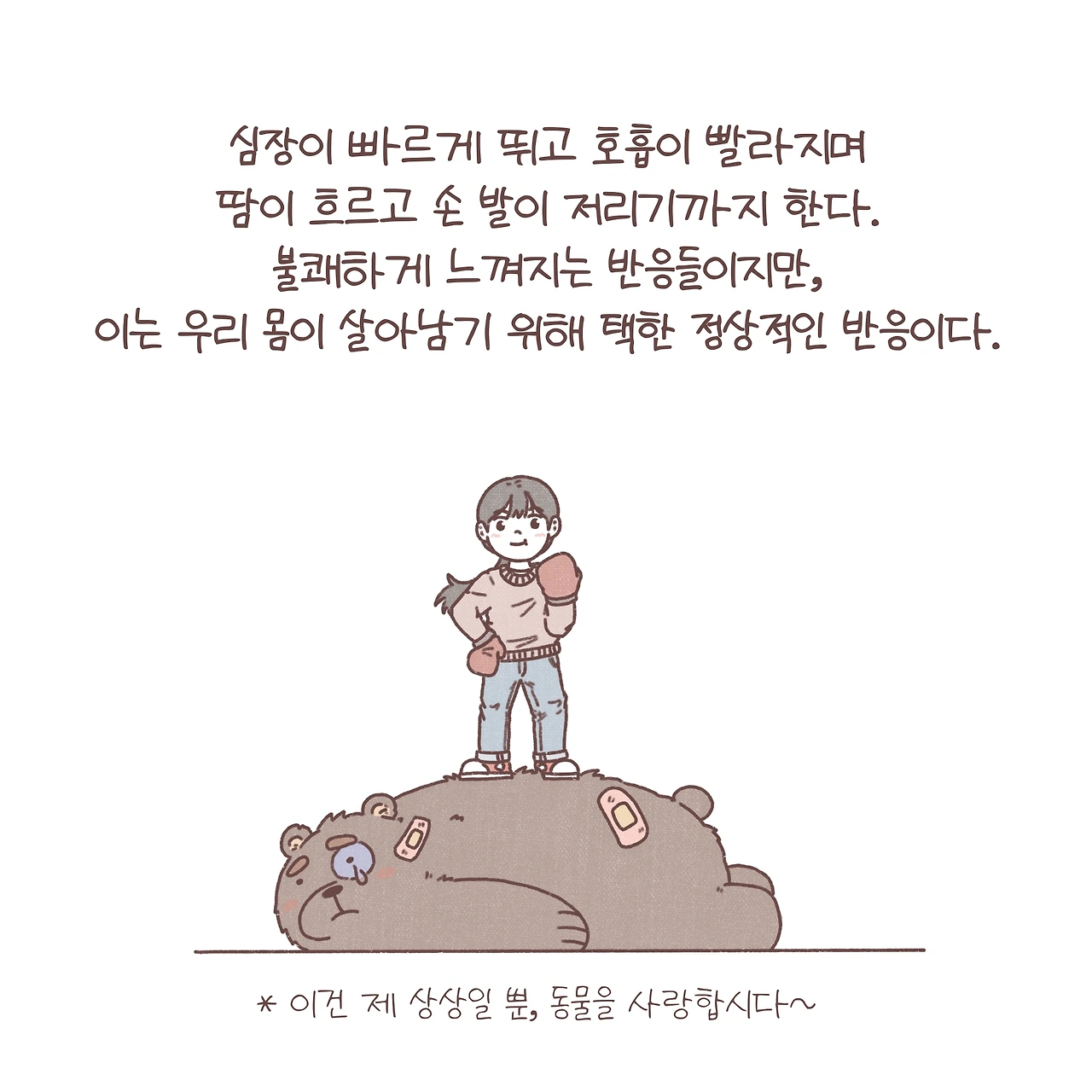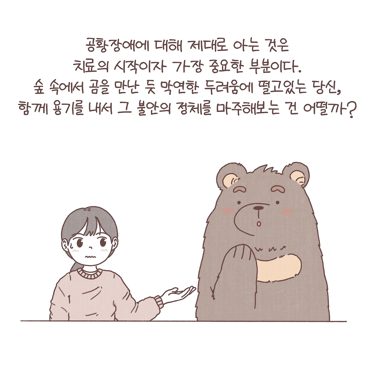 두려움에 대처하기 위한 몸의 당연한 투쟁-도피(fight or flight) 반응. 공황장애는 신경전달회로의 이상으로 고장 난 소화전이 계속해서 울리듯 통제할 수 없는 두려움에 몸이 계속해서 긴장상태에 돌입하는 것과 같아요. 때문에 신경전달물질의 불균형을 교정하기 위한 약물치료가 필요한 경우가 많습니다. 약물치료뿐만 아니라, 복식호흡과 같은 불안과 연관되어 나타나는 심계항진 등 신체 증상을 조절하는 이완요법을 교육하고 공황을 유발하는 왜곡된 생각에 접근해 점진적으로 공황을 극복하는 인지행동치료를 병행하기도 해요. 무엇보다 가장 중요한 것은 공황장애에 대해 제대로 아는 것입니다. 반복해서 나타나는 신체증상에 마치 숲 속에서 곰을 만난 듯, 막연한 두려움에 떨고 있는 당신이 용기를 내 그 불안의 실체를 천천히 들여다볼 수 있길 바라며 글을 마칩니다.