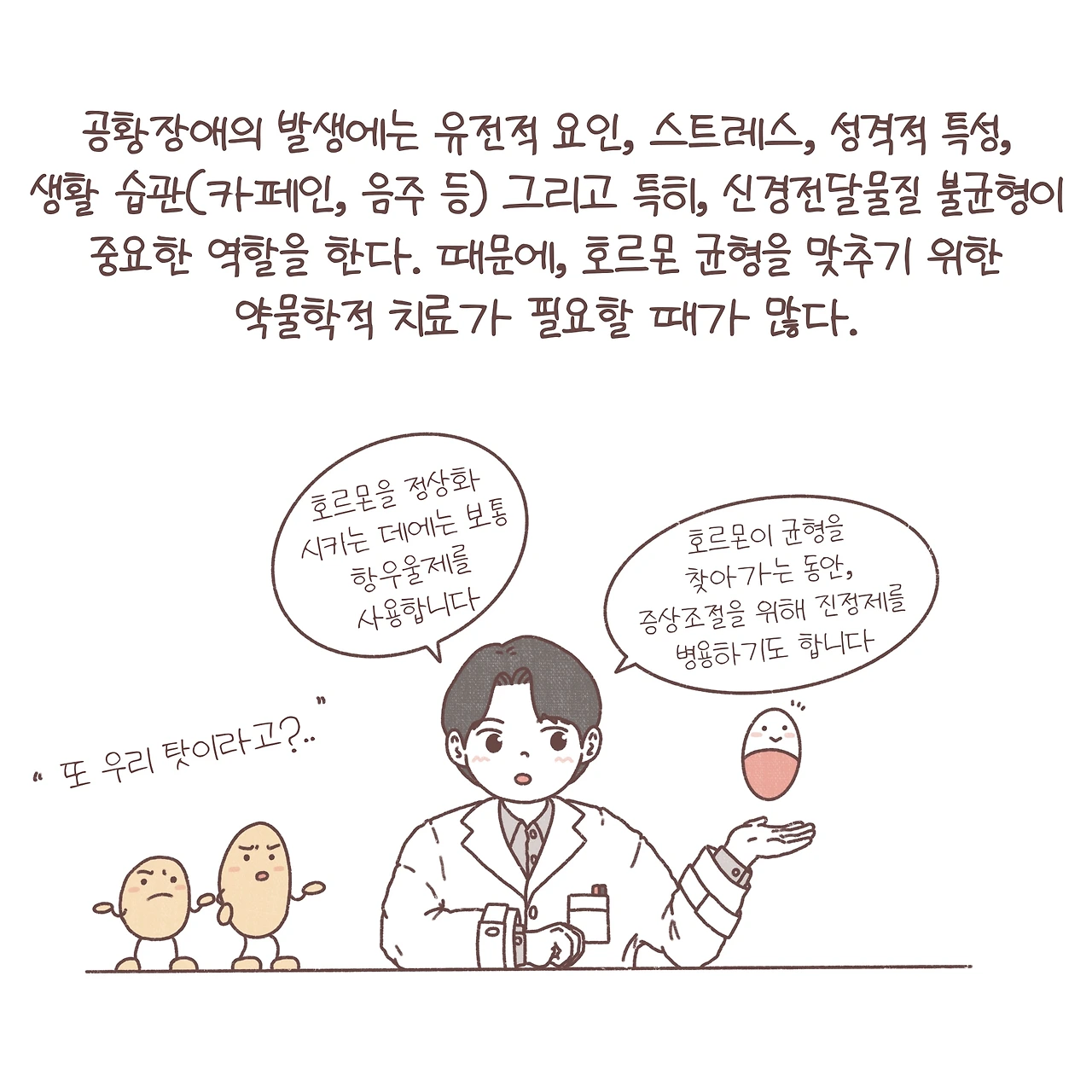 공황장애는 유전적, 심리적, 생물학적, 환경적으로 다양한 요인에 의해 발생합니다. 임상에서 주로 마주하는 사례를 예로 들어볼까요? 중요한 시험이 있어 며칠을 날을 꼬박 새우며 카페인을 과다 섭취한 20대 여성이 시험 전날, 시험이 망할 것 같은 느낌에 스트레스를 받다가 갑자기 숨이 안 쉬어지고 가슴이 두근거리는 느낌을 겪다가 죽을 것만 같은 두려움에 응급실에 방문했지만 검사 결과는 이상이 없었습니다. 하지만, 다음날, 또 다음날까지 하루에도 여러 번 반복되는 증상에 정신과를 방문했습니다. 이처럼, 공황장애는 불안과 연관된 다양한 신체반응을 증상을 보입니다. 공황발작이라고 부르는 몇 분만에 최고조에 달하는 불쾌한 신체 증상과 다음번 발작이 또 언제 올까 두려움에 떠는 예기불안이 진단에 중요한 기준이 되죠.