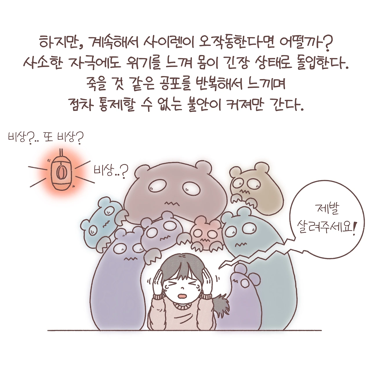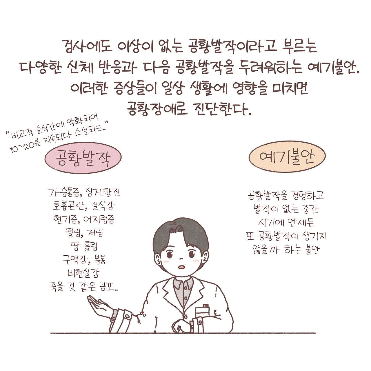 공황장애는 비교적 많은 사람들에게 익숙한 질환인 것 같습니다. 하지만, 정작 내게 그 공황이 찾아왔을 때, 이를 정확히 알아보고 대처하는 것은 쉬운 일이 아닌 것 같아요. 실제로 응급실이나 외래로 찾아오는 많은 사람들이 흉통이나 두근거림, 어지럼증, 손발 저림 등의 증상으로 여러 병원을 전전하며 다양한 검사를 반복해도 원인을 찾지 못해 답답한 마음을 호소하곤 합니다. 죽을 것 같은 공포를 느끼며 병원을 찾았지만, 딱히 이상소견이 없다는 말에 당황해 오히려 두려움이 배가 되기도 하죠. 안타깝게도 아직은 낯설고 무겁게 느껴지는 정신건강의학과에 대한 시선 탓에 방문을 미루고 병을 키우기도 합니다.