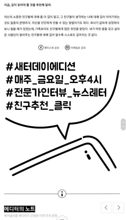 A. 자신의 소중한 친구들에 대해 좀 더 깊이 알고, 그 친구들이 생각하는 나에 대해 깊이 이야기하는 것도 일종의 콘텐츠다. 자신을 단단하게 만들 수 있는 방법이기도 하다. 회사가 급하게 성장하다 보니 힘들 때가 있었는데, 가족보다도 친구들에게 많은 위안을 받았다. 내가 어떤 꿈을 갖고 살아온 사람인지 알아주는 친구들에 대해 깊이 알수록 스스로도 깊어지는 것 같다.