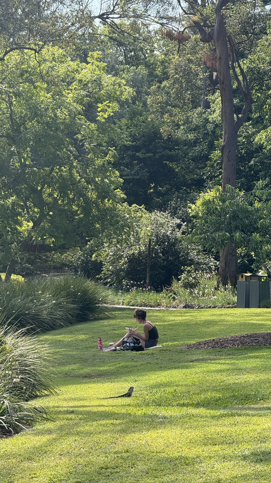 연못에는 새 떼가 와서 놀고 다른 곳에는 수련의 무리가 있더니 또 한 곳에는 조망할 수 있는 나무데크 난간을 설치해 놓았네. 내려다보니 연꽃이 피기 전이라 봄빛에 넓은 잎이 반짝이고 봄바람은 살랑대고 그것을 보는 나는 '이보다 평화로울 수는 없어'라는 생각이 들었어. 산책로를 따라 걷는데 애나가 저쪽 풀숲을 가리켰어. 그쪽을 보니 잔디밭에 앉아 작은 호수 풍경을 그리고 있는 젊은 여성의 모습은 그 자체로 그림이더라.