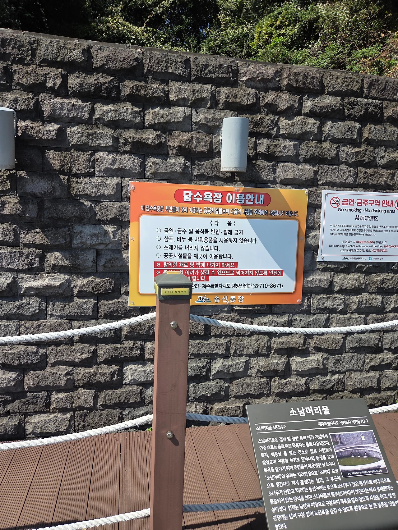 더운데, 정방폭포는 사람들까지 많았다. 더구나 유료. 귀찮고 번잡해 함께 붙어있는 '서복공원'에서 정방 반대편, 오른쪽으로 내려갔다. 바다를 만지고 싶어 내려갔더니,