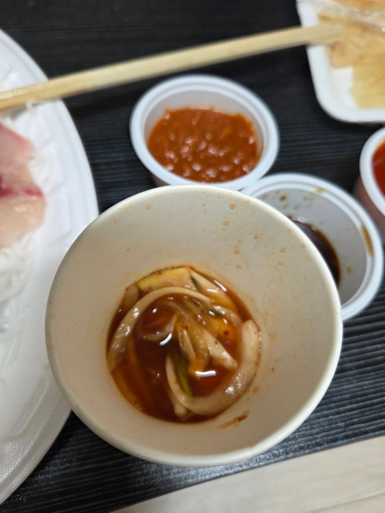 '드림 회 센터'에서 갈치, 고등어 회 2만 원짜리 세트를 샀다. 사진의 양파 초절임 같이 먹는다.