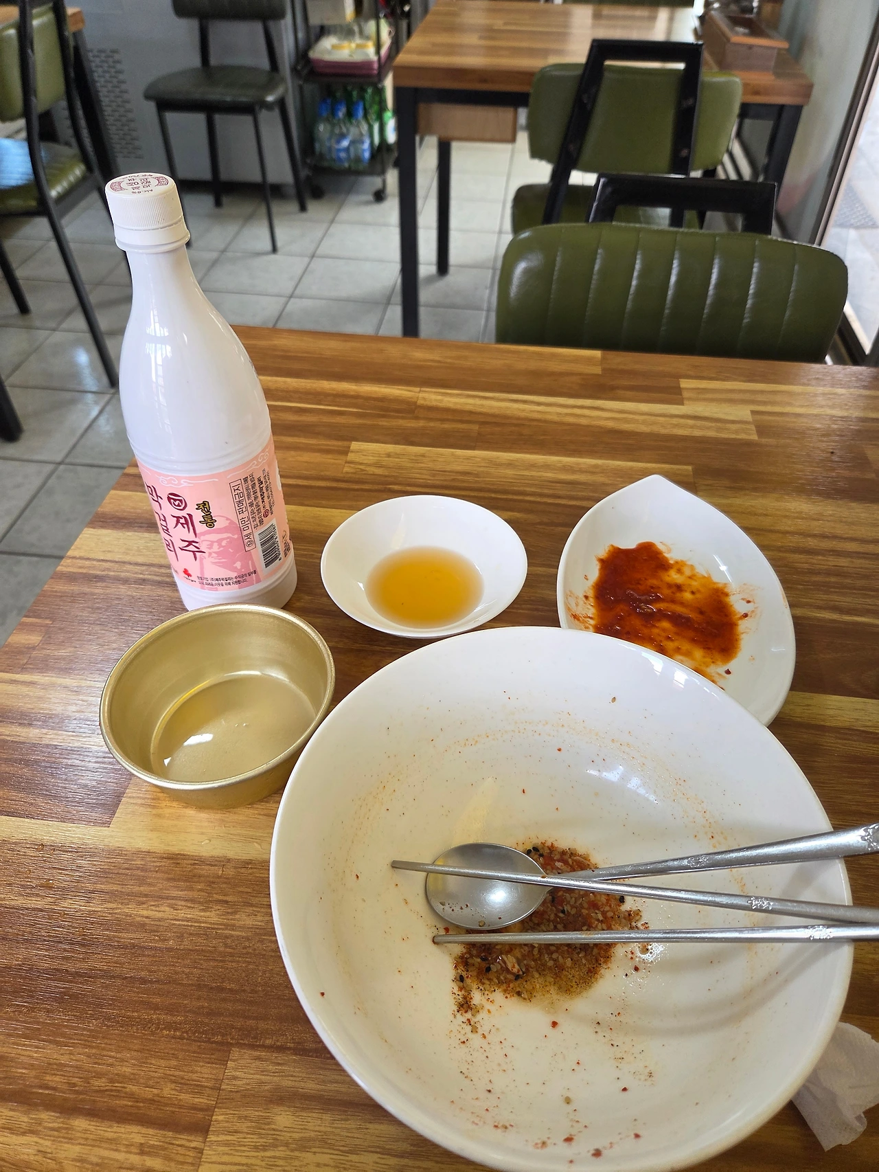 한 입 먹고, 도저히 참을 수 없어 안 마시려 했던, 아침 계획 취소 후, 막걸리(4000원) 콜~.