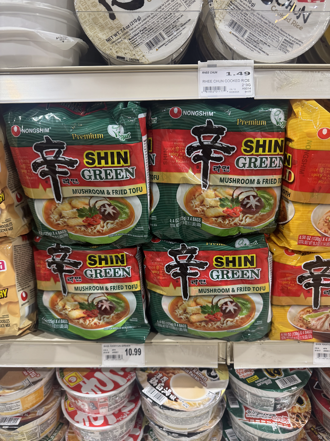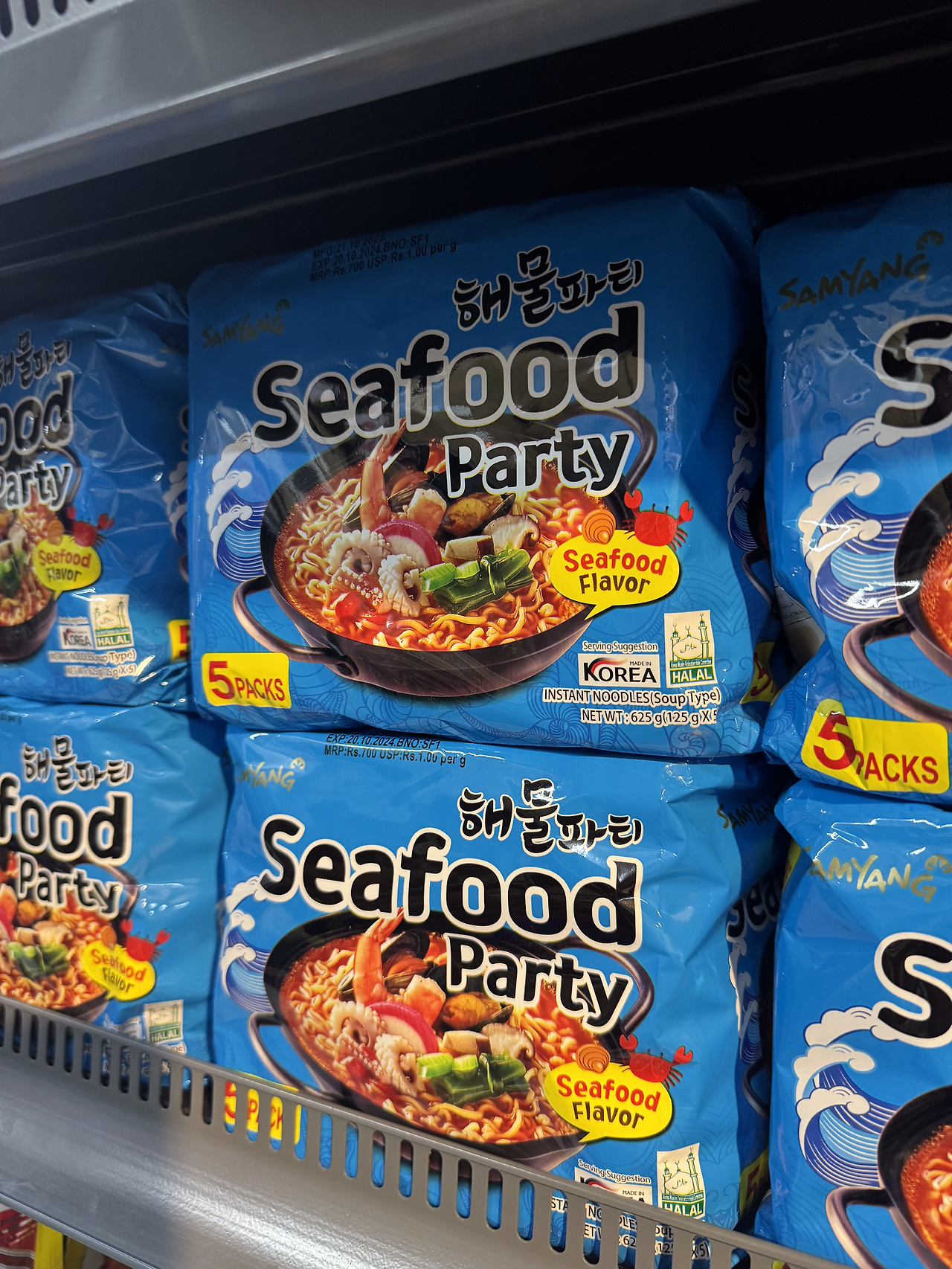 제가 찍은 사진 속 라면들도 그렇습니다. 한국에서는 볼 수 없는 Shin Green 비건 라면, 해물파티(Seafood Party) 같은 상품명, 그리고 중국어로 포장된 농심 컵라면까지… 각 나라의 입맛과 문화에 맞춰 현지화된 K-라면을 보고 있자면 정말 ‘글로벌 식품’이란 말이 실감 납니다.