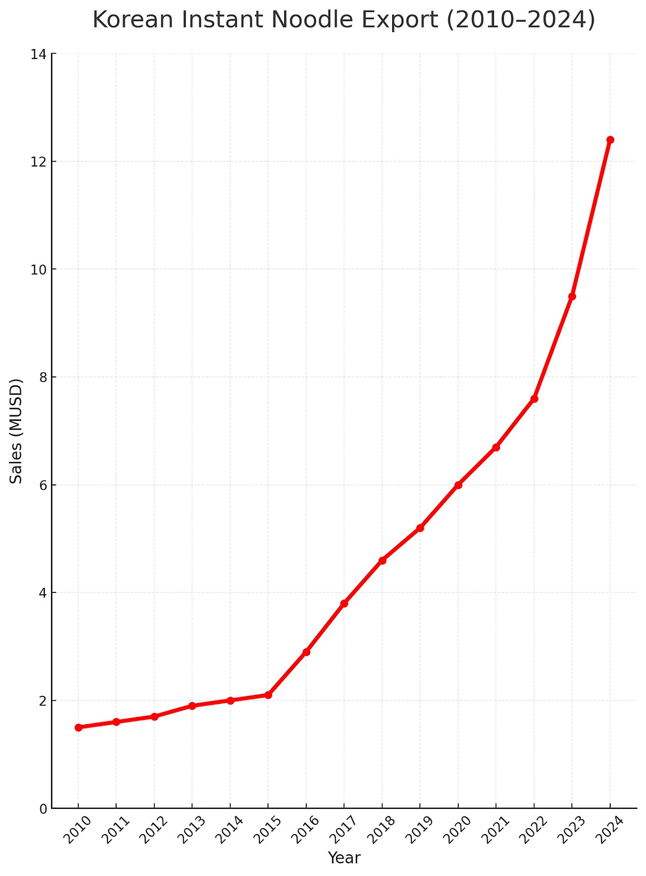 한국 라면의 수출은 2010년대 초반까지만 해도 연 1억~2억 달러 규모에 머물렀습니다. 2010년 수출액은 약 1억 5천만 달러 수준이었죠. 하지만 2013년 《별에서 온 그대》 등 한류 드라마의 인기로 K-푸드에 대한 관심이 서서히 높아졌고, 2015년에는 수출액이 2억 달러를 넘었습니다.