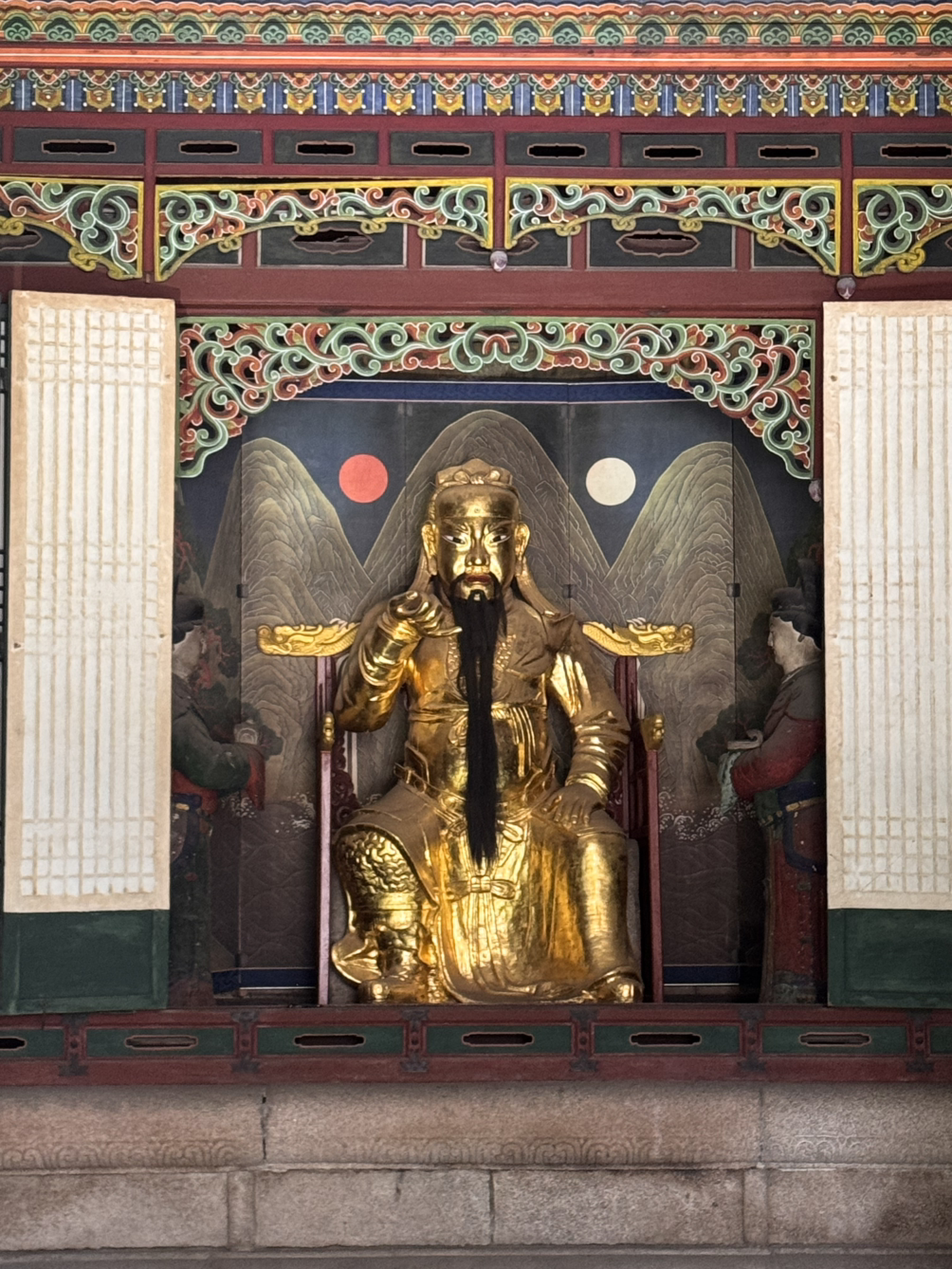 정전의 한가운데는 황금빛으로 된 관우상이 놓여 있습니다. ‘미염공(美髥公)’이라는 그의 별명답게 길게 늘어진 수염이 매우 인상적으로 조각되어 있었고, 눈을 부릅뜨고 정면을 응시하는 얼굴은 살아생전 그가 보여줬던 무공, 의리, 충절의 기세를 고스란히 담고 있는 듯 보였습니다.