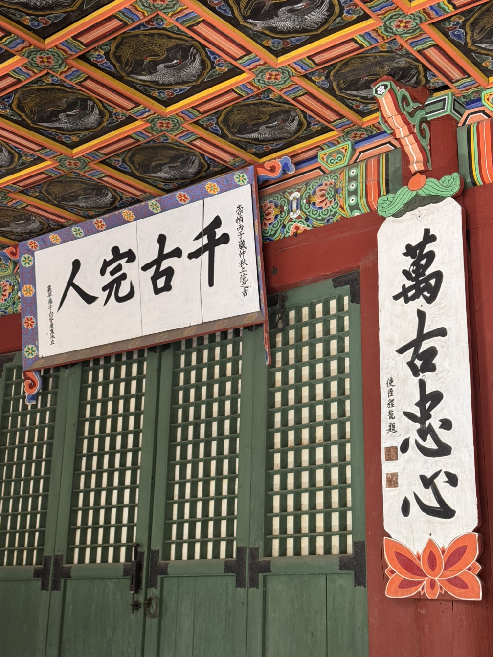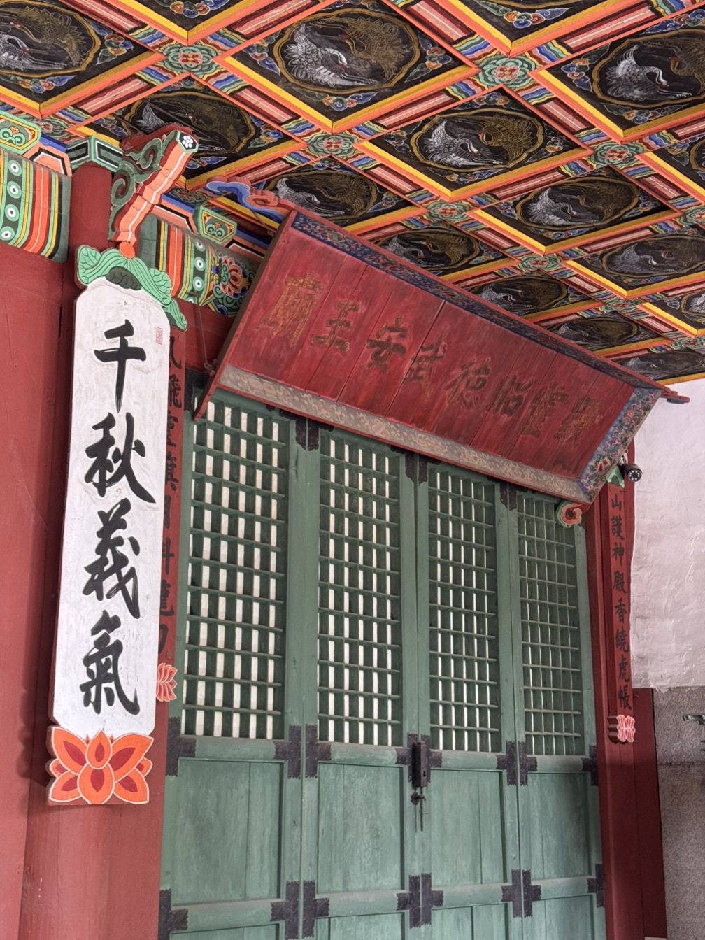 정전 안으로 들어서면 관우상을 중심으로 좌우 벽에 두 개의 사자성어가 눈에 들어옵니다. 바로 ‘만고충심(萬古忠心)’, 그리고 ‘천추의기(千秋義氣)’입니다.