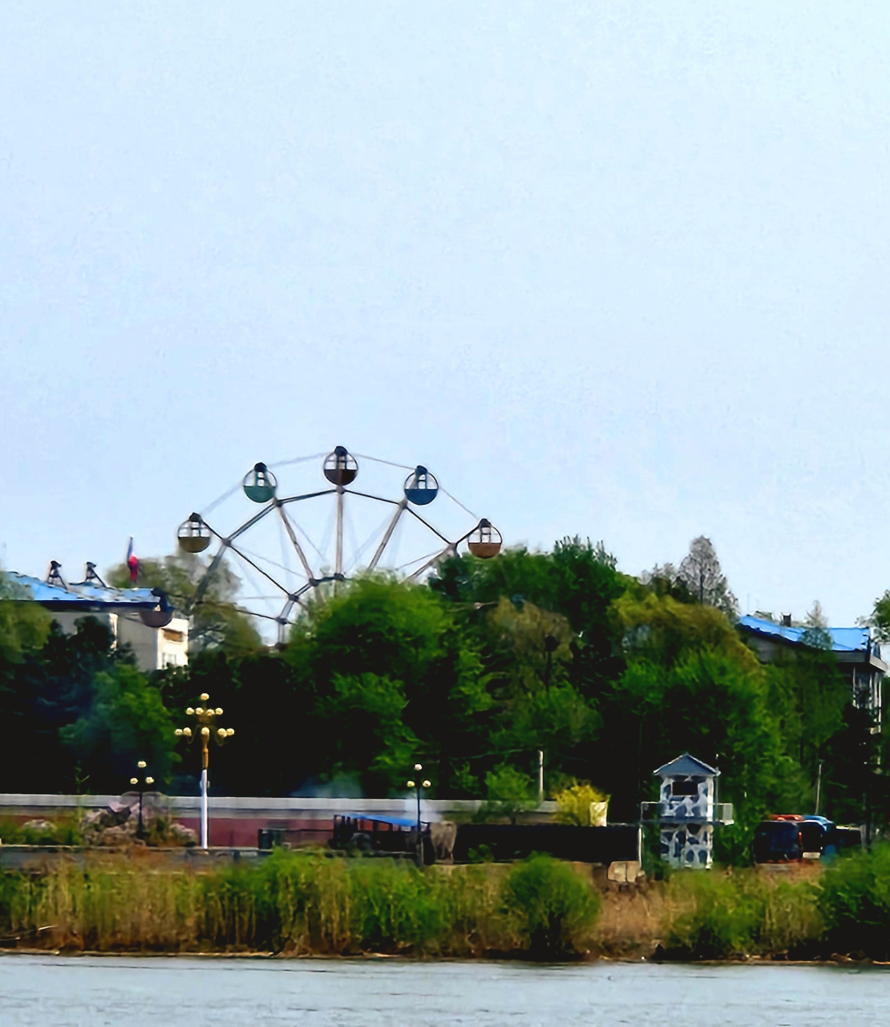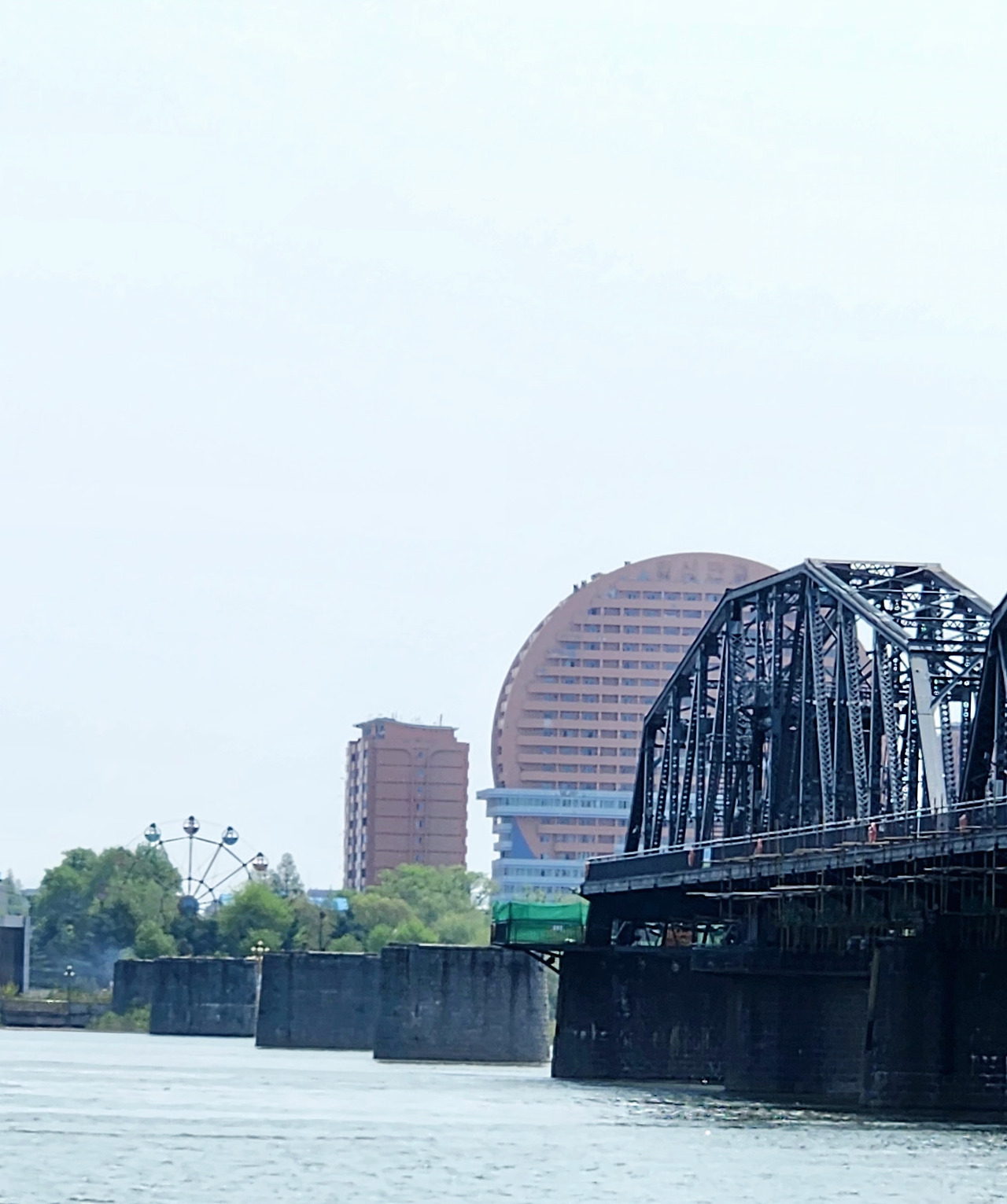 단동에는 아주 특별한 관광 상품이 하나 있습니다. 바로 유람선을 타고 압록강을 따라 북한에 가장 가까이 다가가는 여행 상품입니다. 마치 국경을 따라 짧은 시간을 항해하는 듯한 느낌이랄까요. 배를 타고 출발하면 곧 압록강 단교 아래를 지나게 됩니다. 그리고 곧 눈에 들어오는 것은 북한 쪽의 동그란 형태의 호텔. 겉으로 보기엔 제법 웅장하지만, 영업을 하고 있는 흔적은 보이지 않습니다. 아마도 체제 선전을 위한 과시용 건물인 듯 보였습니다. 호텔 바로 옆으로는 놀이공원도 있습니다. 대관람차가 눈에 띄지만, 돌아가지는 않습니다. 이 모든 풍경이 마치 시간의 흐름을 멈춰버린 듯 정지된 상태로 존재하고 있었습니다.